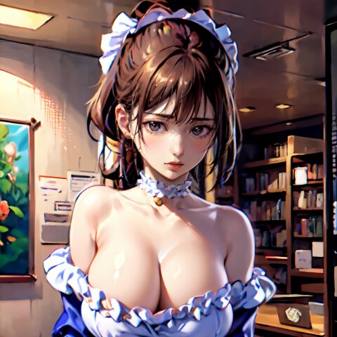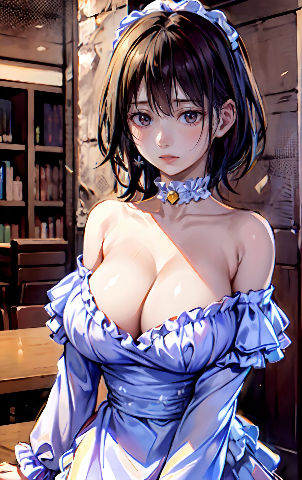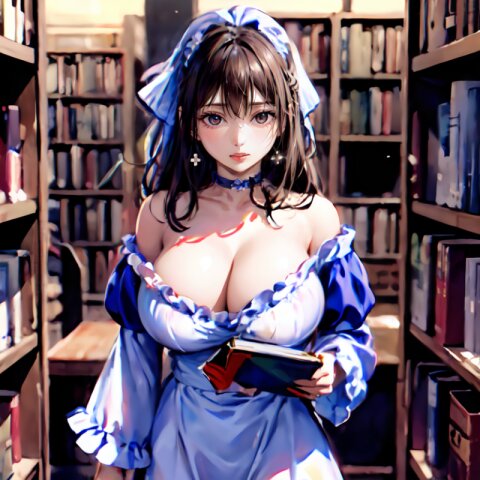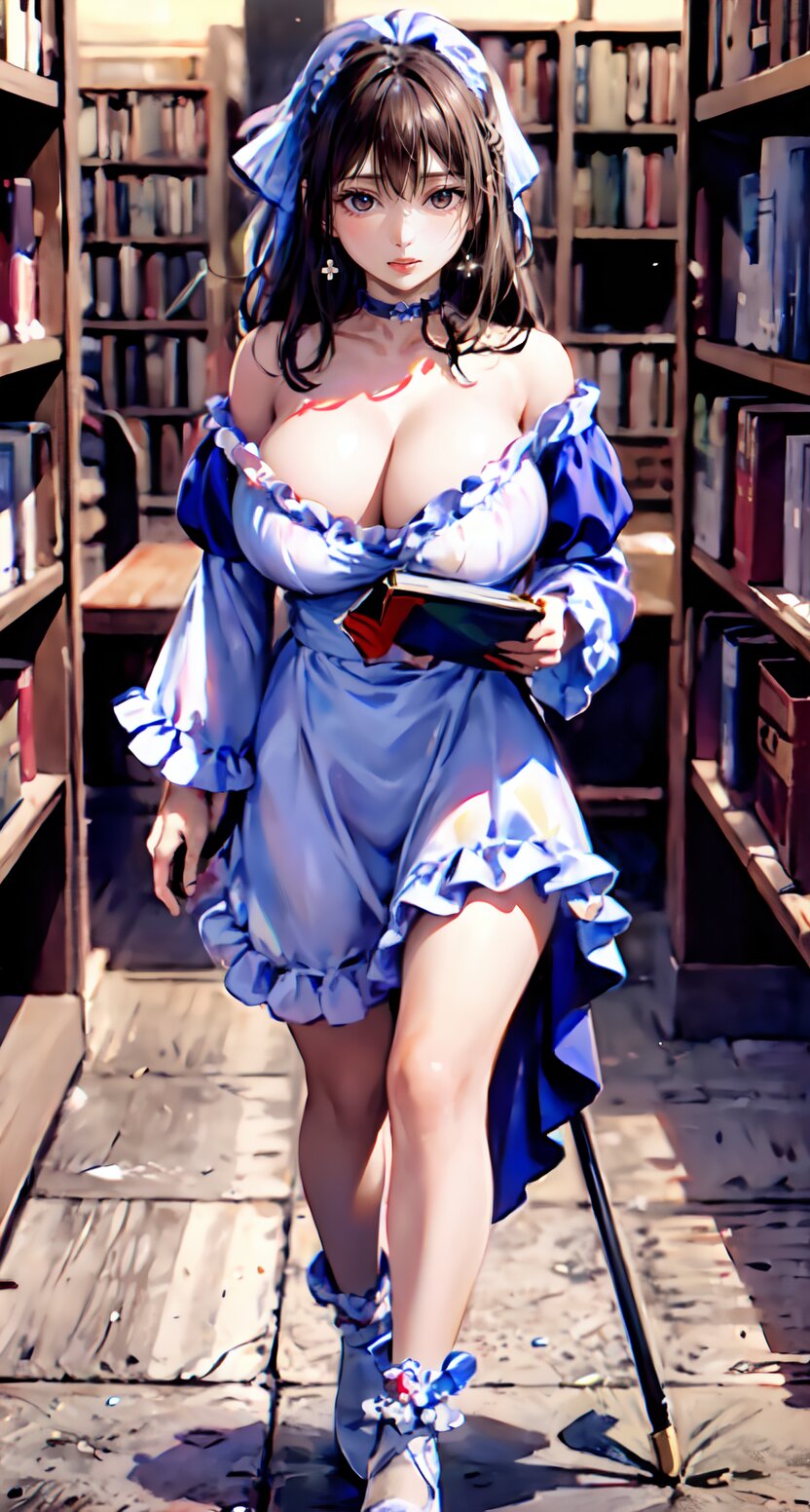 upper body, closed up face, (from front: 1.8), (8k, best quality, masterpiece:1.4), (realistic, photo-realistic:1.6), (vibrant color:1.2), ultra-detailed, 8K, HDR, 1girl, 18 years old, (slender, gigantic breasts: 1.4), long hair, (Off Shoulder Frilled Shirred Waist Puff Sleeve Layered Hem Milkmaid Dress, choker: 1.8), looking away, (standing: 1.6), in the school library, <lora:ris_v01:1>