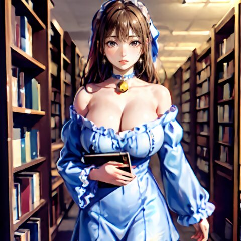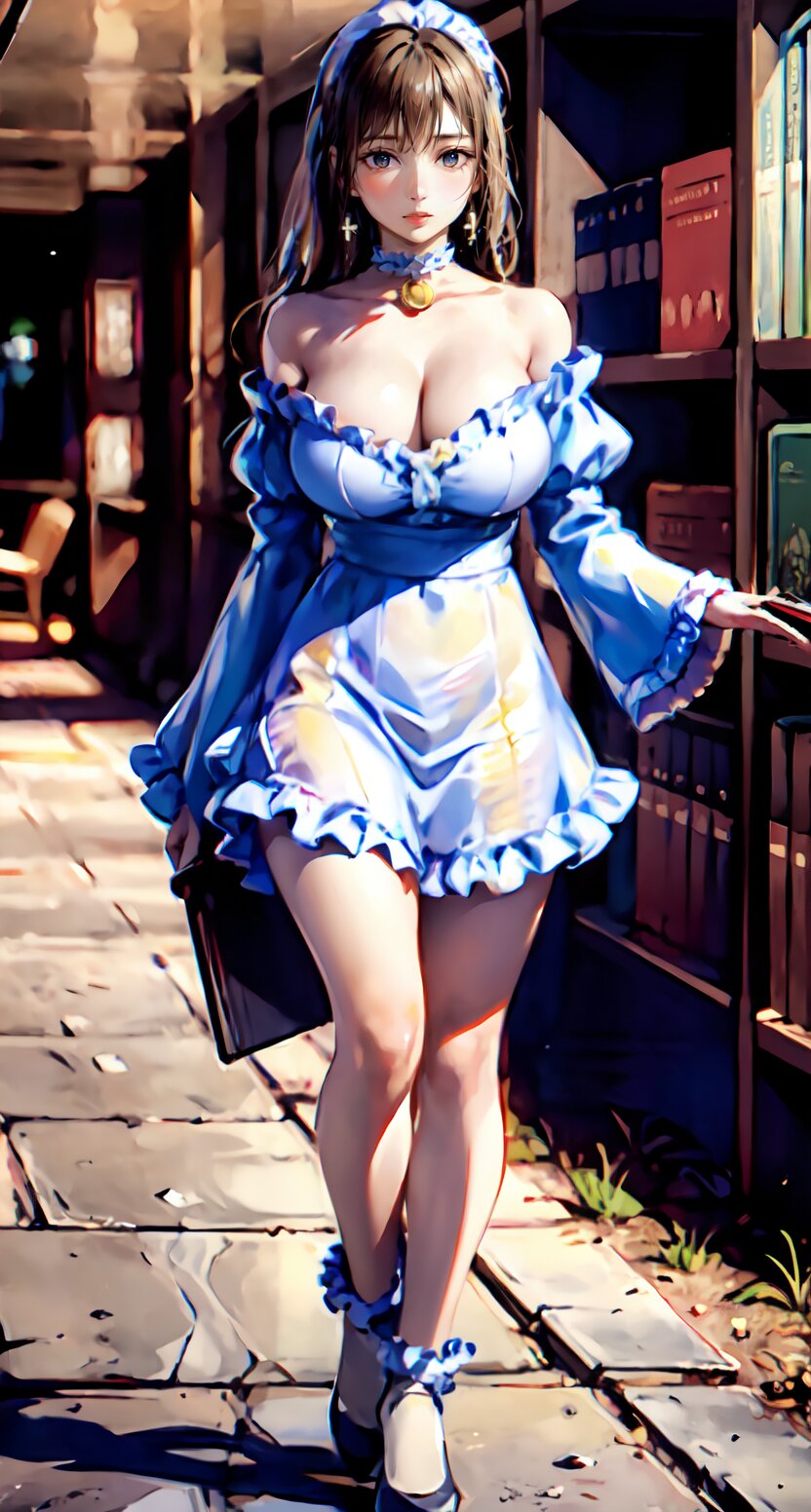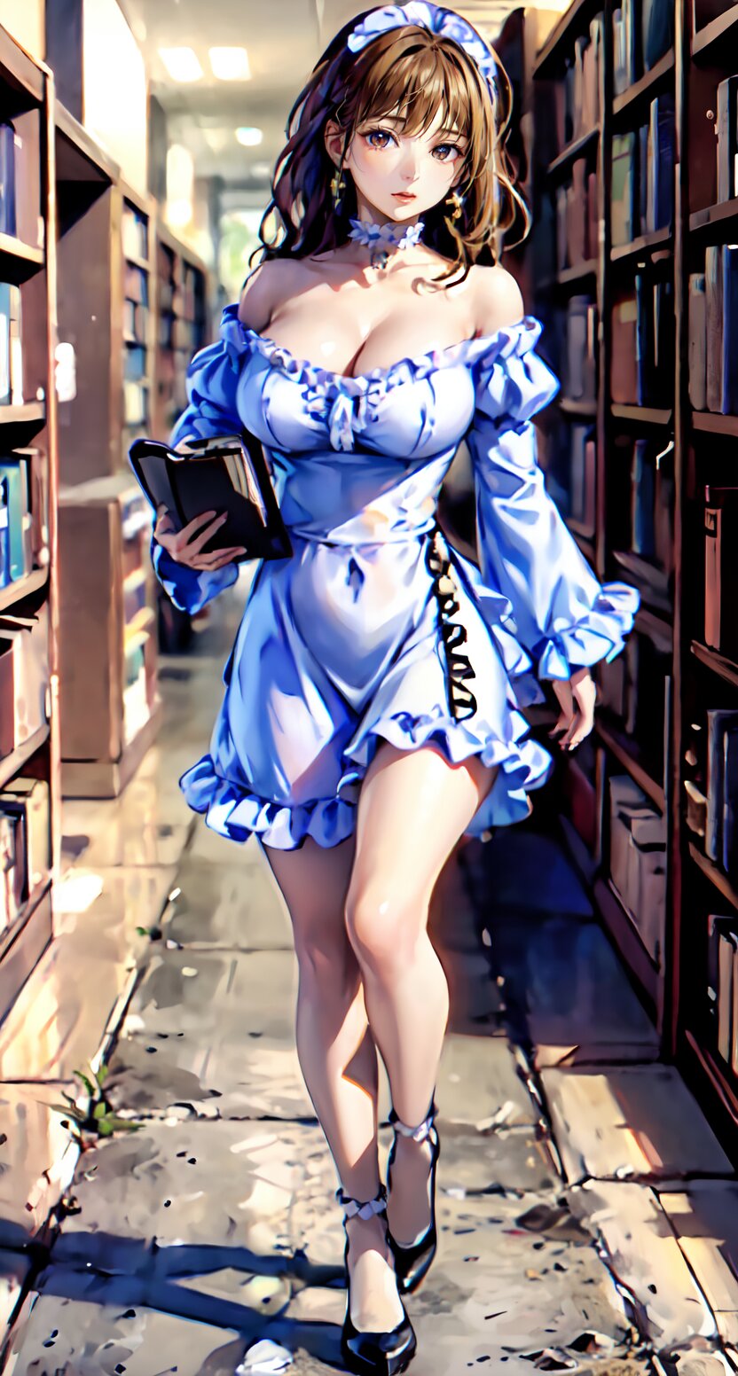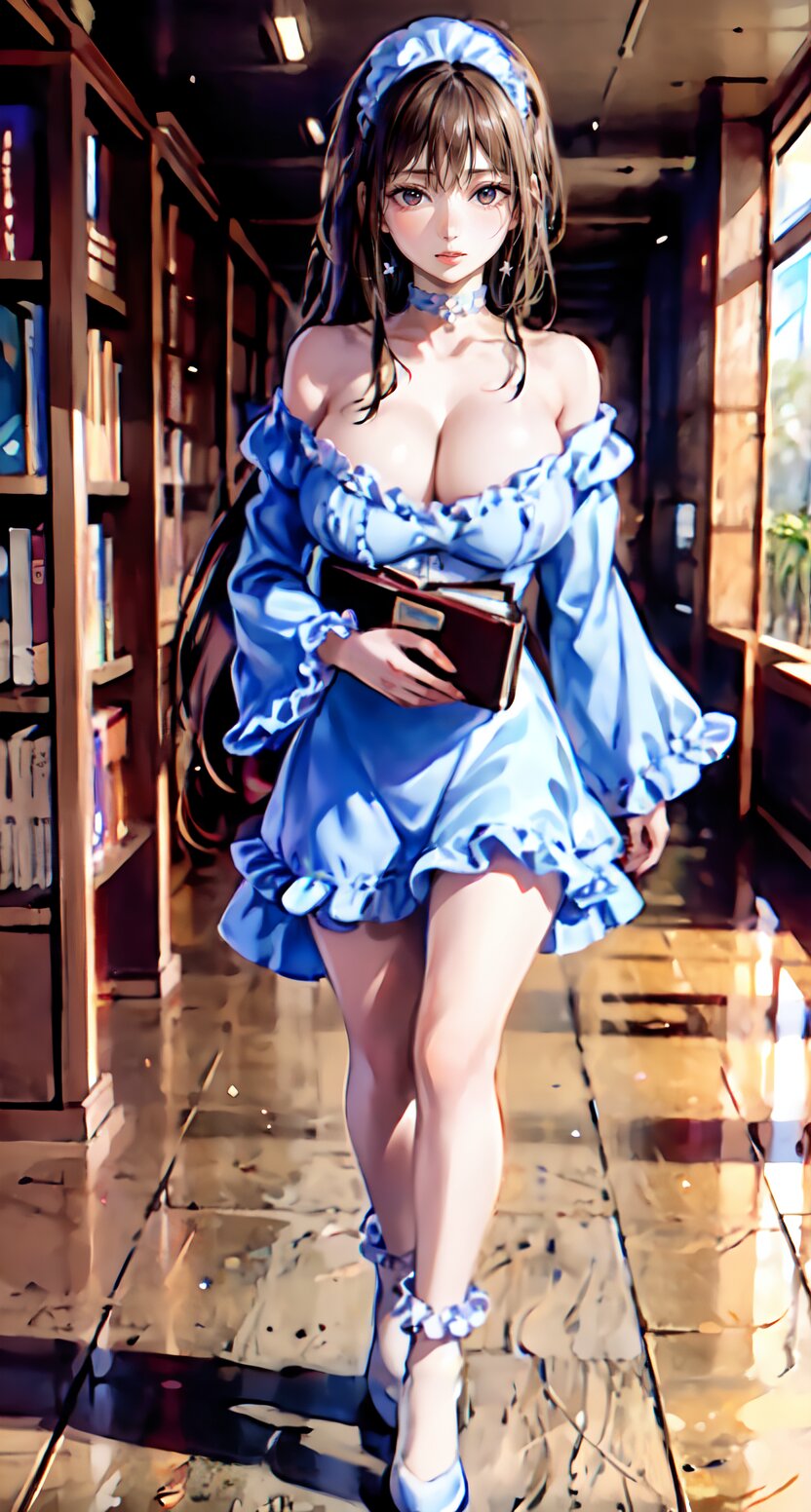 (full body, from front: 1.8), (8k, best quality, masterpiece:1.4), (realistic, photo-realistic:1.6), (vibrant color:1.2), ultra-detailed, 8K, HDR, 1girl, 18 years old, (slender, gigantic breasts: 1.6), long hair, (Off Shoulder Frilled Shirred Waist Puff Sleeve Layered Hem Milkmaid Dress, choker: 1.8), looking away, (walking, holding book: 1.6), in the school library, <lora:ris_v01:1>