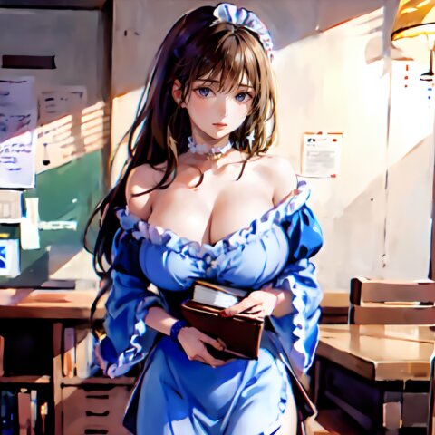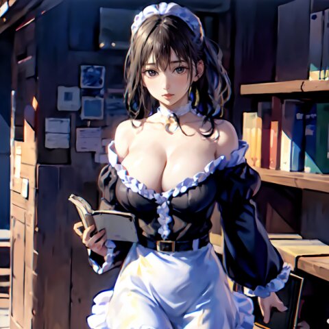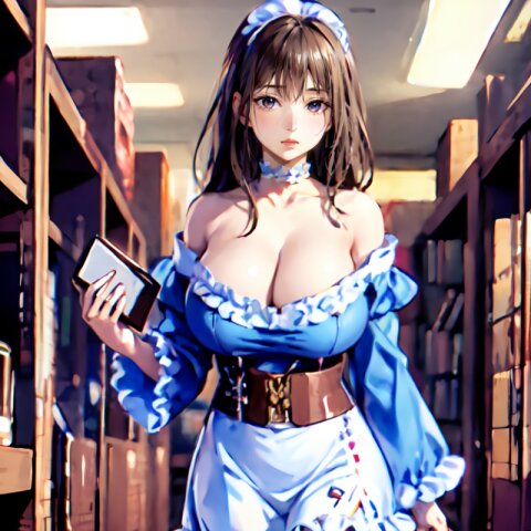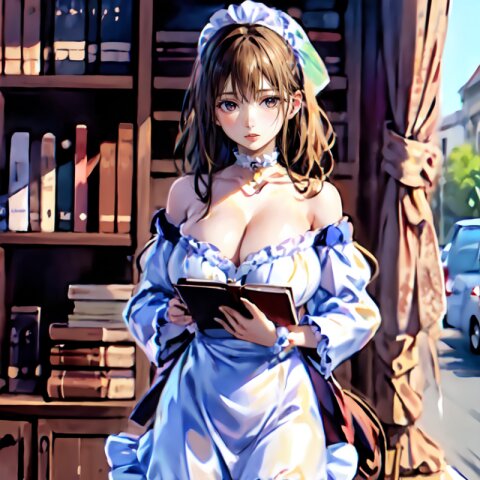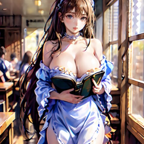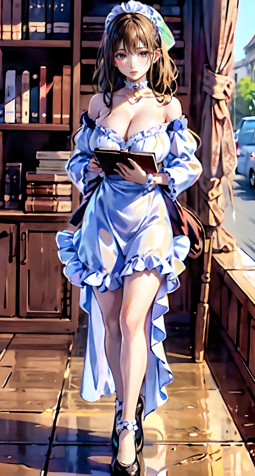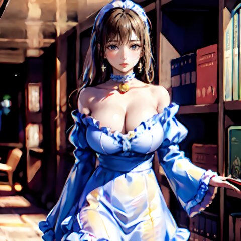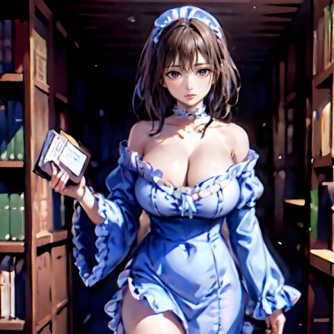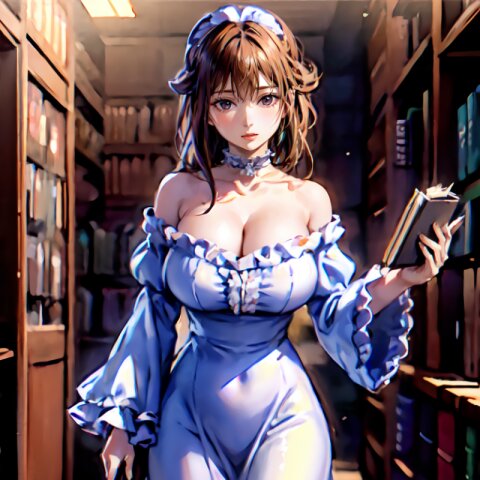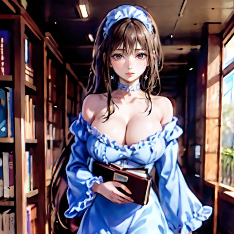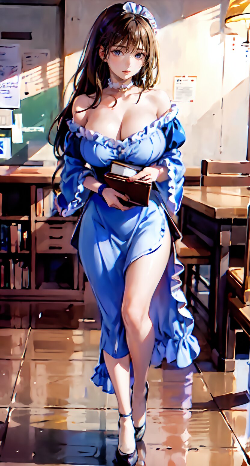 (full body, from front: 1.8), (8k, best quality, masterpiece:1.4), (realistic, photo-realistic:1.6), (vibrant color:1.2), ultra-detailed, 8K, HDR, 1girl, 18 years old, (slender, gigantic breasts: 1.6), long hair, (Off Shoulder Frilled Shirred Waist Puff Sleeve Layered Hem Milkmaid Dress, choker: 1.8), looking away, (walking, holding book: 1.6), in the school library, <lora:ris_v01:1>