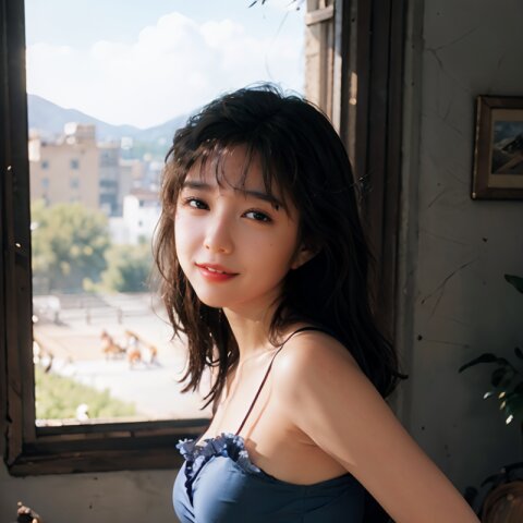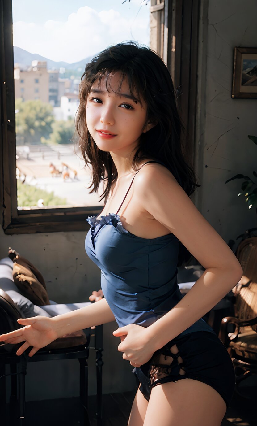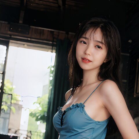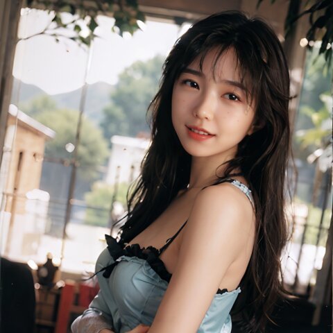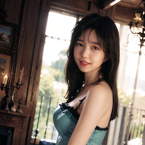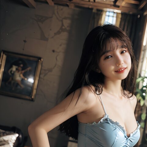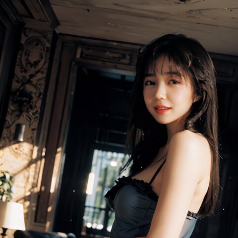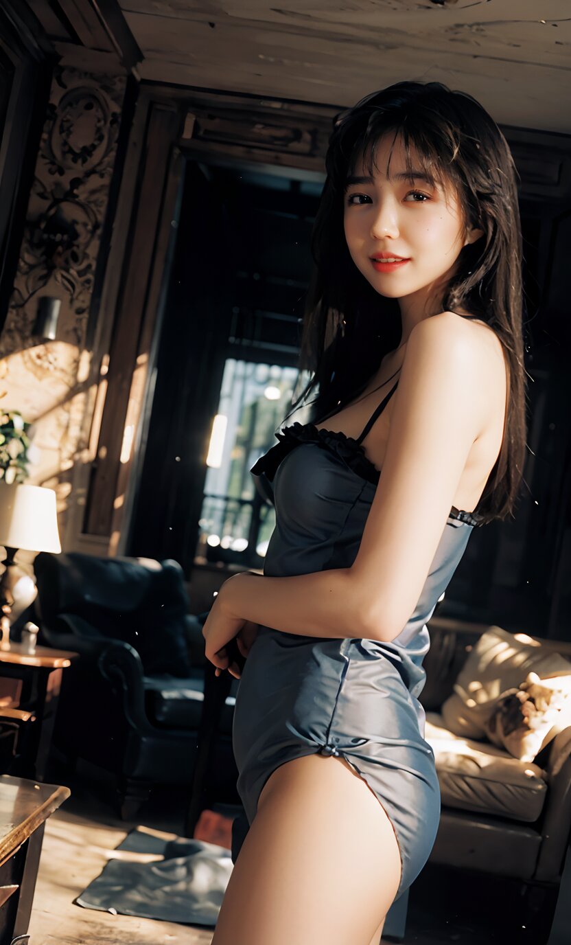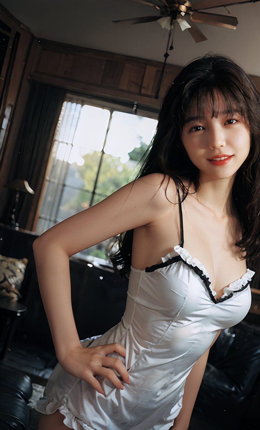 (8k, best quality, masterpiece:1.4), (realistic, photo-realistic:1.6), HDR, (incredibly absurdres:1.2), (vibrant color:1.2), ultra-detailed, ((random pose, random angle: 1.8)), 1girl, solo, 19 years old, long hair, (cowboy shot: 1.8), perfect body, large breast, highly detailed, shiny skin, shiny hair, looking at viewer, (chemise: 1.4), (standing, hands on hip, in the living room: 1.2), <lora:mom_v02:0.8>