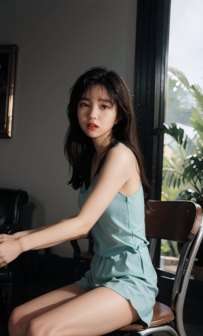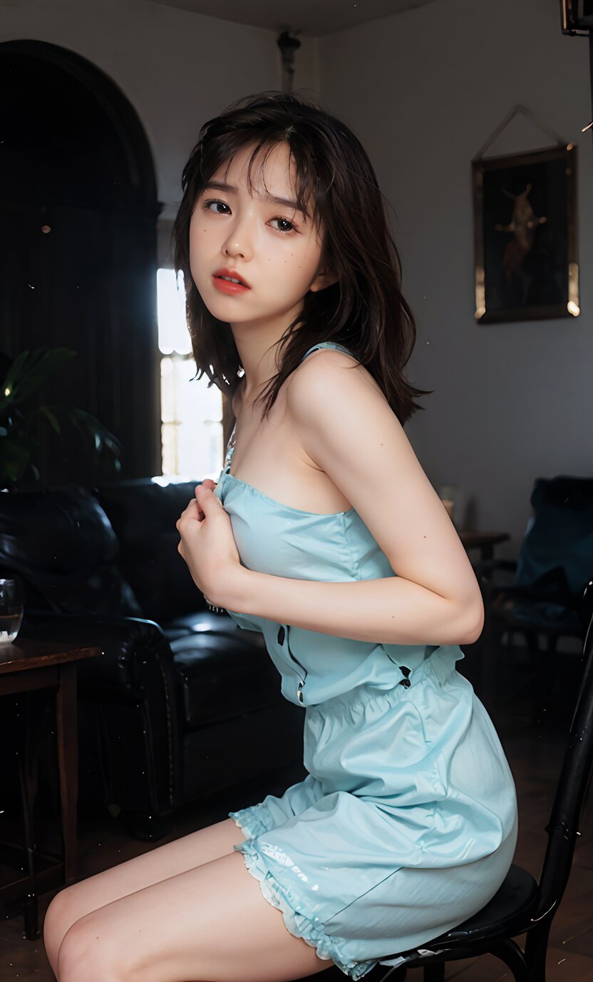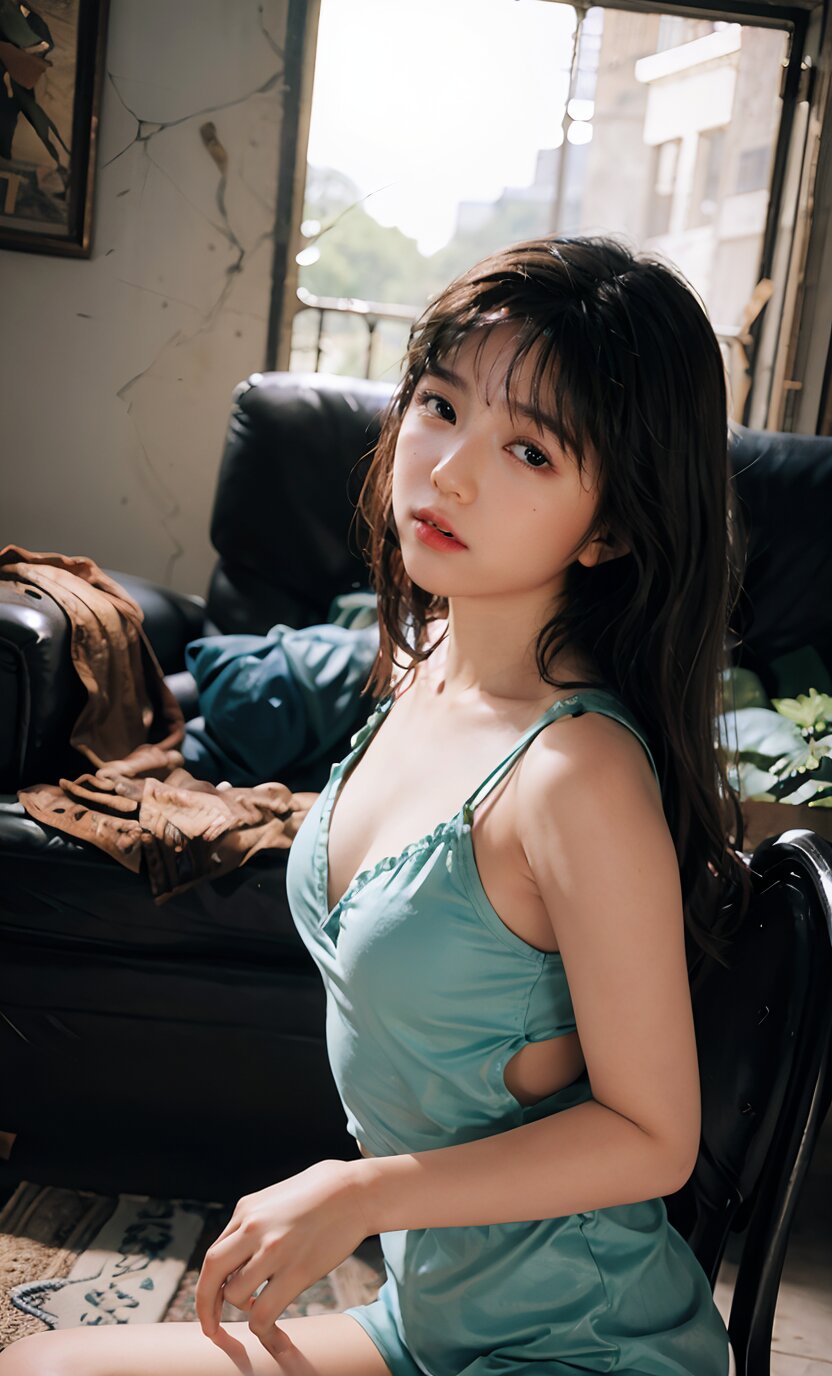 (8k, best quality, masterpiece:1.4), (realistic, photo-realistic:1.6), HDR, (incredibly absurdres:1.2), (vibrant color:1.2), ultra-detailed, ((random pose, random angle: 1.8)), 1girl, solo, 19 years old, long hair, (cowboy shot: 1.8), perfect body, large breast, highly detailed, shiny skin, shiny hair, looking at viewer, (rompers: 1.4), (sitting on chair, in the living room: 1.2), <lora:mom_v02:0.8>