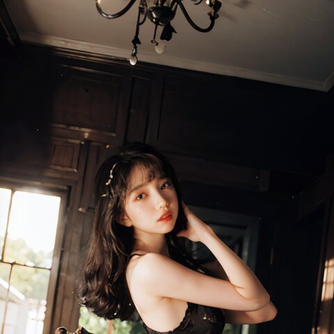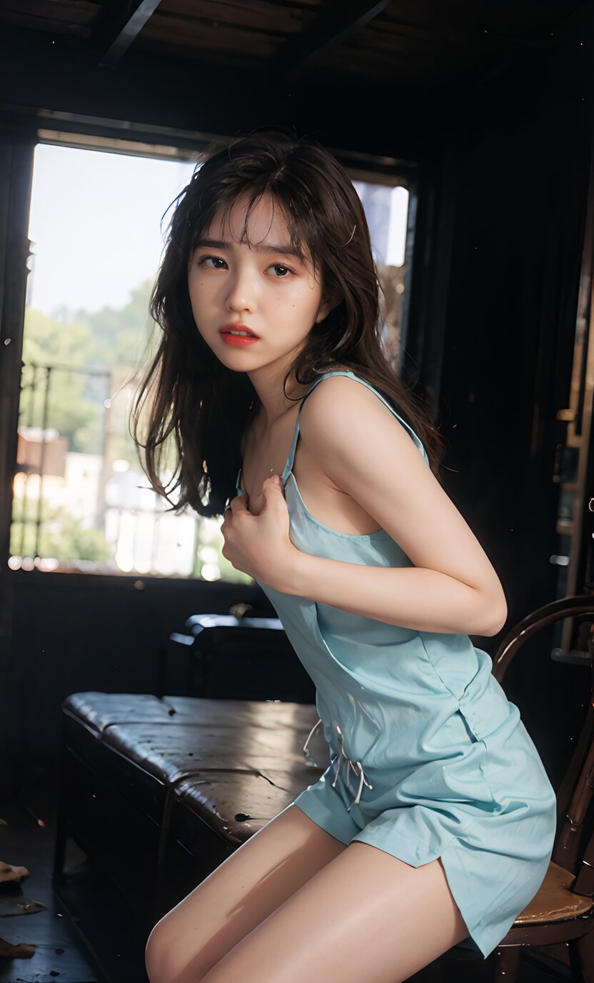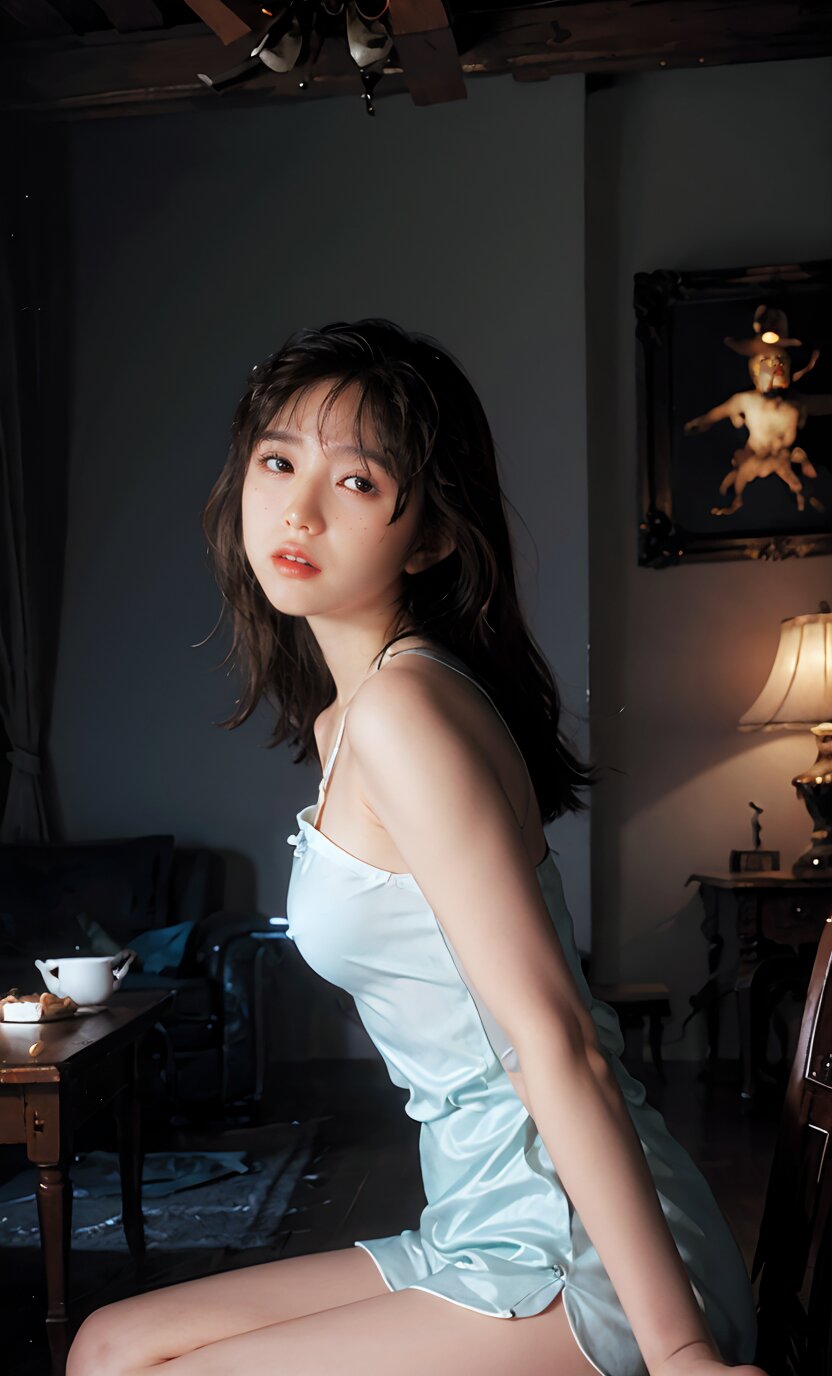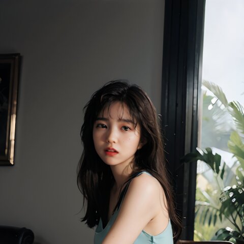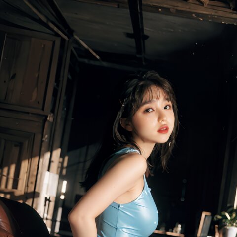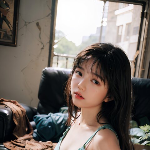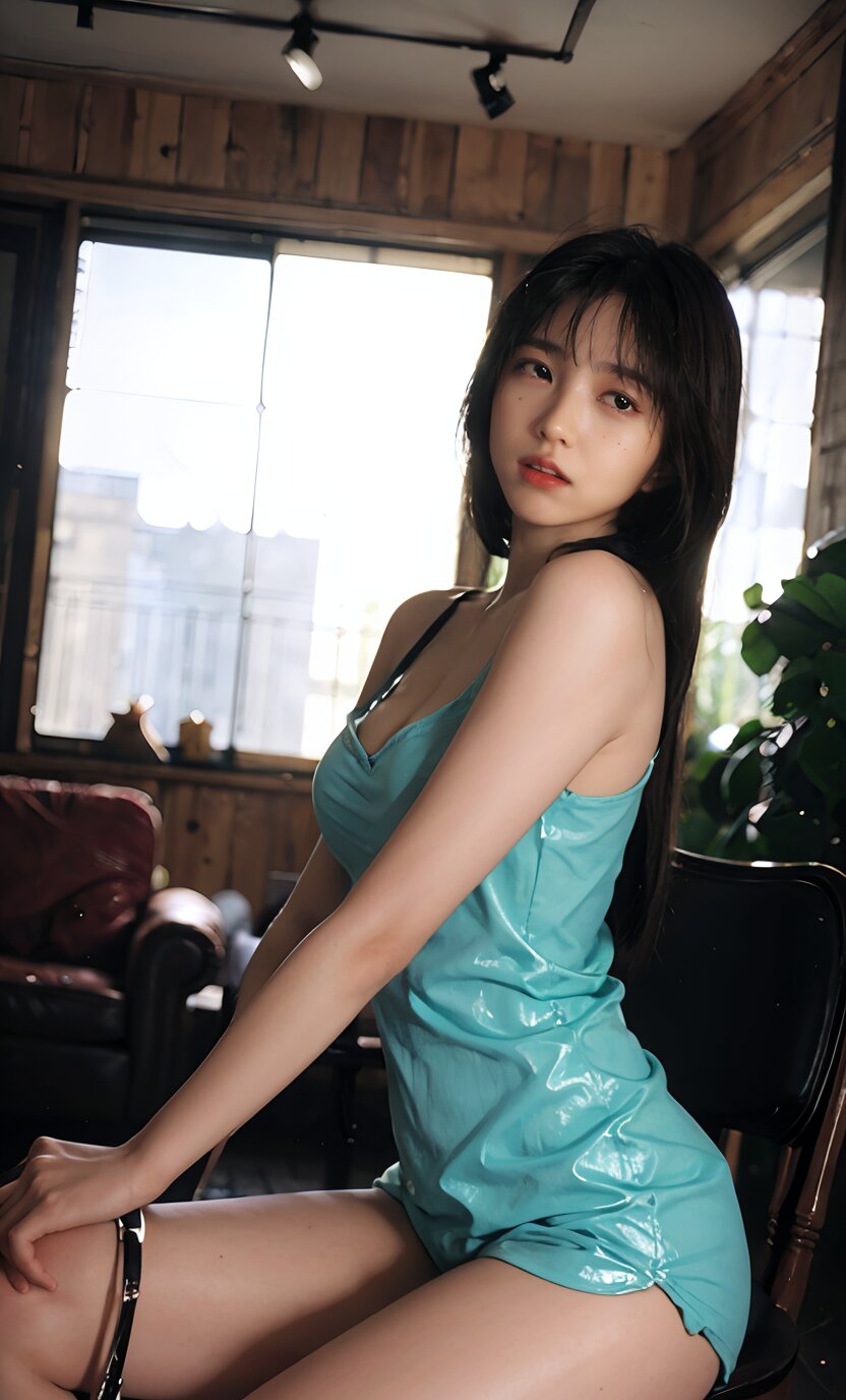 (8k, best quality, masterpiece:1.4), (realistic, photo-realistic:1.6), HDR, (incredibly absurdres:1.2), (vibrant color:1.2), ultra-detailed, ((random pose, random angle: 1.8)), 1girl, solo, 19 years old, long hair, (cowboy shot: 1.8), perfect body, large breast, highly detailed, shiny skin, shiny hair, looking at viewer, (rompers: 1.4), (sitting on chair, in the living room: 1.2), <lora:mom_v02:0.8>