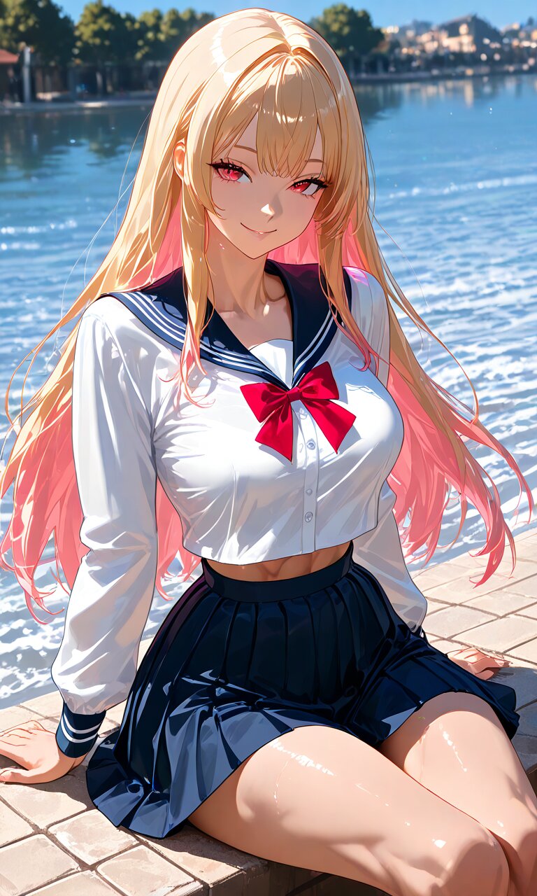 1 lady, blonde long hair, pink inner hair, gradient hair from blond to pink, bangs, red eyes, slanted eyes, full breasts, tight waist, muscular abs,, riverside, sitting, school uniform, (relaxed), smile ,(gal fashion)