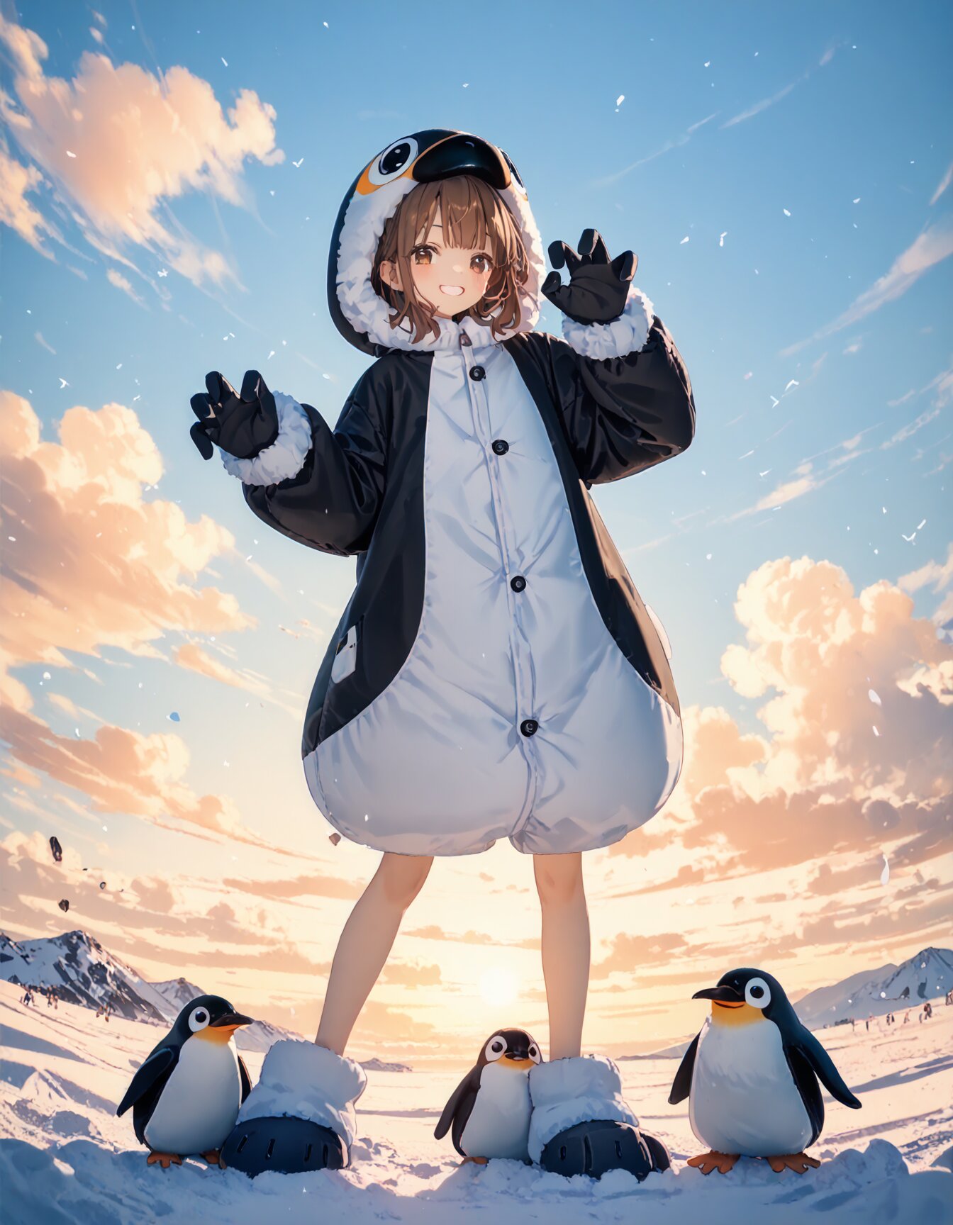 score_9, score_8_up, score_7_up, score_6_up, rating_safe, best quality, high quality, cowboy shot, (1girl), detailed face, (smile showing her tooth), (brown hair), brown eyes, full body, (pow pose), (Fluffy fleece penguin hood full suit Costume:1), (fluffy fleece penguin gloves:1), (Fluffy fleece penguin slippers that wrap foot:1), On the ice of Antarctica, blue sky, sun lighting, White Clouds, Lots of penguins,