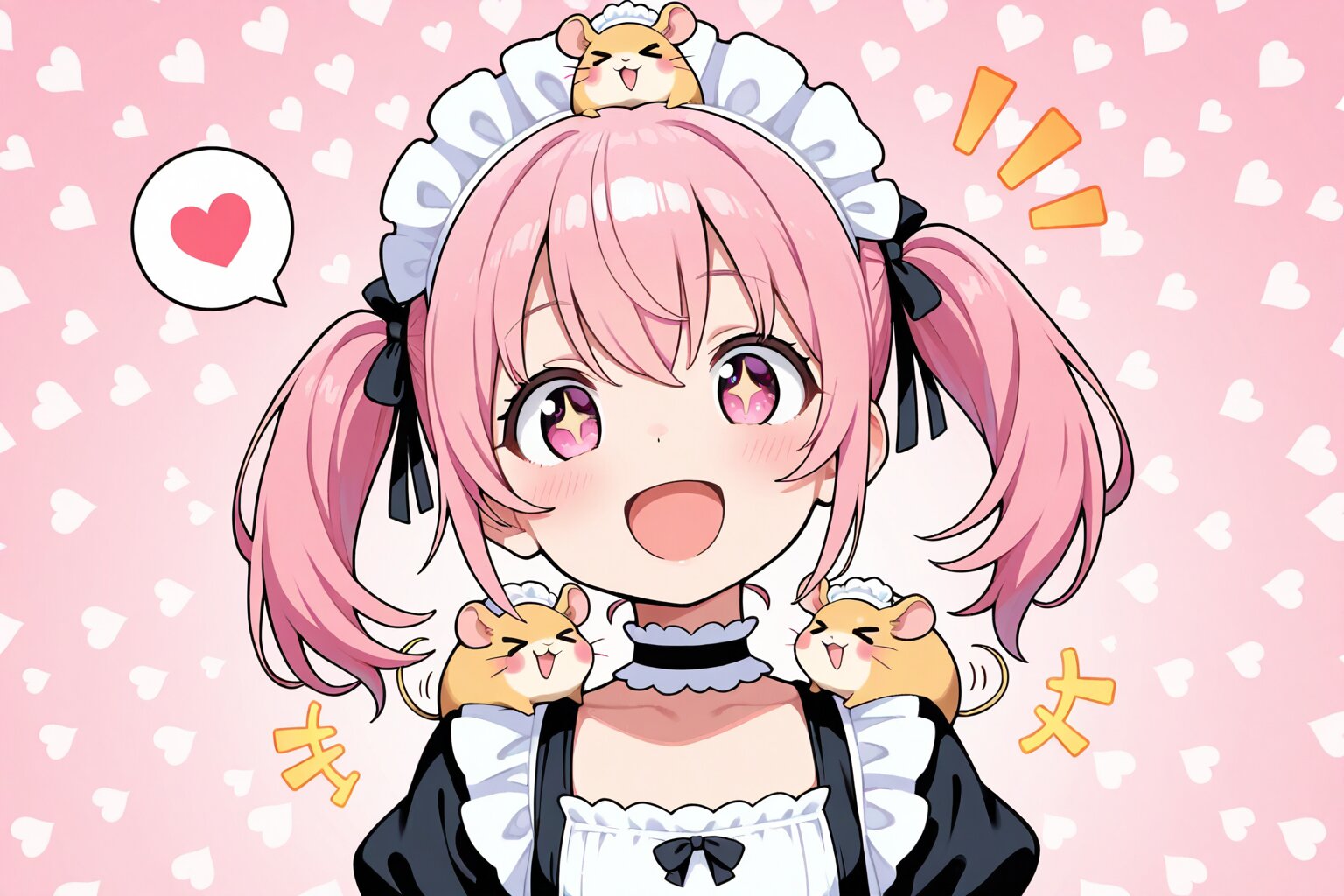 1 little girl, diagonal angle, upper body, masterpiece, best quality, amazing quality, very aesthetic, pink hair, twintails, pink eyes, +_+, open mouth, smile, cheerful, +++, notice lines, choker, maid outfit, spoken heart, hamsters on head, hamsters on shoulders, > <, heart patterned background,