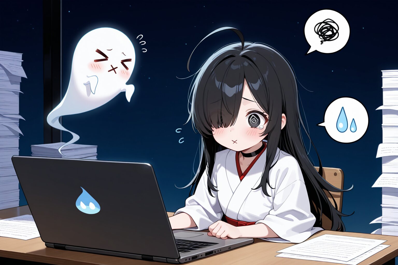 1 little girl, diagonal angle, upper body, masterpiece, best quality, amazing quality, very aesthetic, black hair, long hair, ahoge, (hair over one eye:1.2), black eyes, @_@, (:x:1.2), troubled, confused, tearful, cheerful, flying sweatdrops, spoken sweatdrop, spoken squiggle, choker, white kimono, ghost, >_<, in office, laptop on the desk, piles of documents, night,