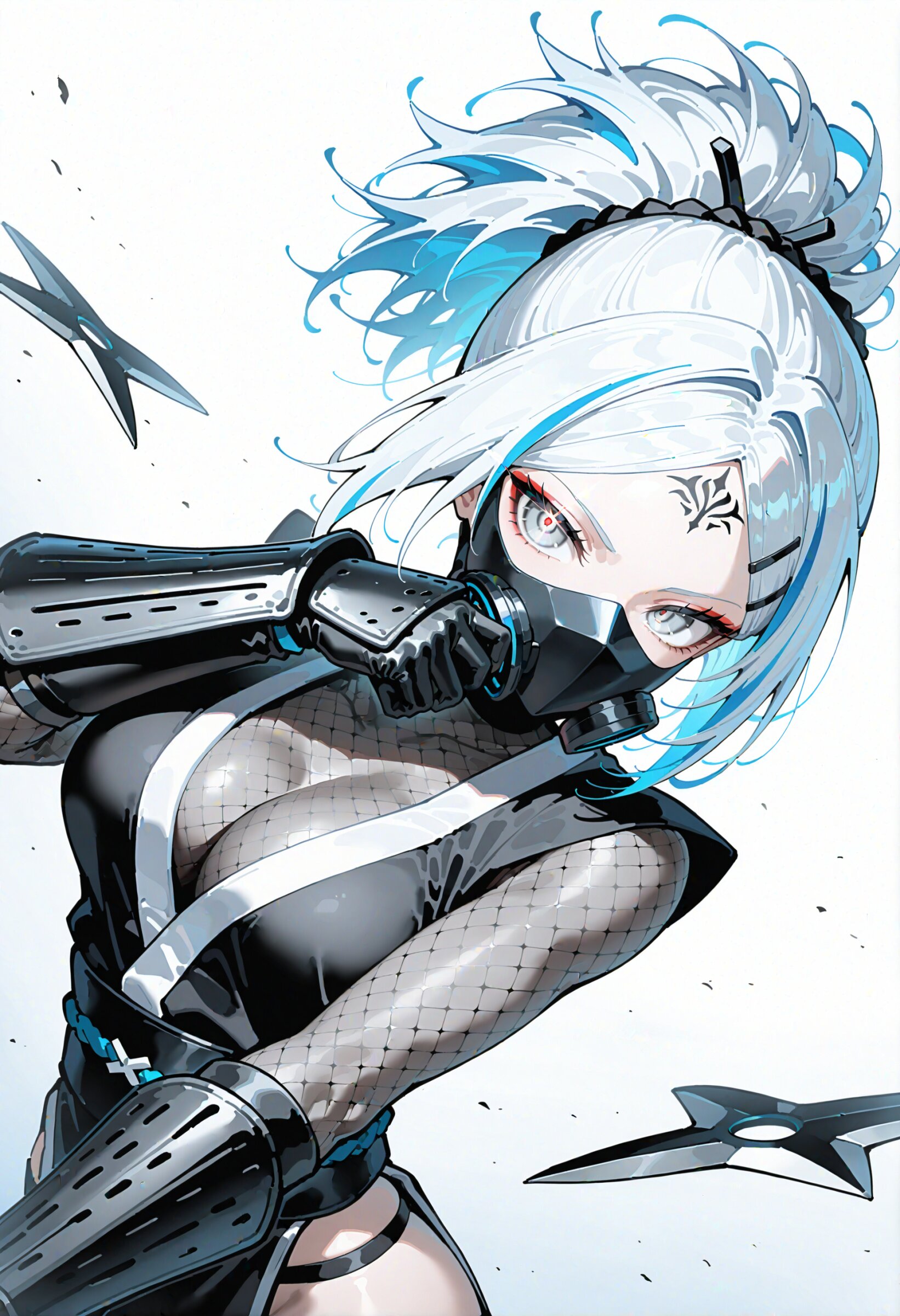 (upper body:1.2), knees out of frame (from above,looking up:1.0) , (dutch angle:1.2), white background, sumi-e, faux traditional media, color ink \(medium\), painting \(medium\), calligraphy brush (medium), , spot color, 1girl, samurai, (muscular female:0.65), multicolored hair, white hair, slategray and light blue hair, short hair, short ponytail,parted bangs hairclip , airy hair, glowing eyes, eye trail, beautiful grey eyes medium breasts, ,, ninja cloth, short kimono, obijime, fishnet inner, fishnets, fishnet thighhighs, pelvic curtain, panty straps, kote, (ninjutsu:1.1), (wearing big shuriken:1.1) mask around neck, respirator, forehead protector, cleavage, zouri, , japanese winter clothes, seductive smile, dynamic pose, kung fu attack, kung fu action, kuji-in, ninjutsu, multiple weapons , raijin, lightning ink wash painting, , super fine concept art, hard surface, 8K, unreal engine, masterpiece, best quality, amazing quality, very aesthetic, absurdres, you can add scenery, (volumetric lighting), To make the background more distinctive. professional art lots of details, , overexposure, sumie effect style, <lora:noline (1):-0.5> <lora:sdxl2-flat2-512b:0.2> <lora:facelightup_xl_v10:0.5>