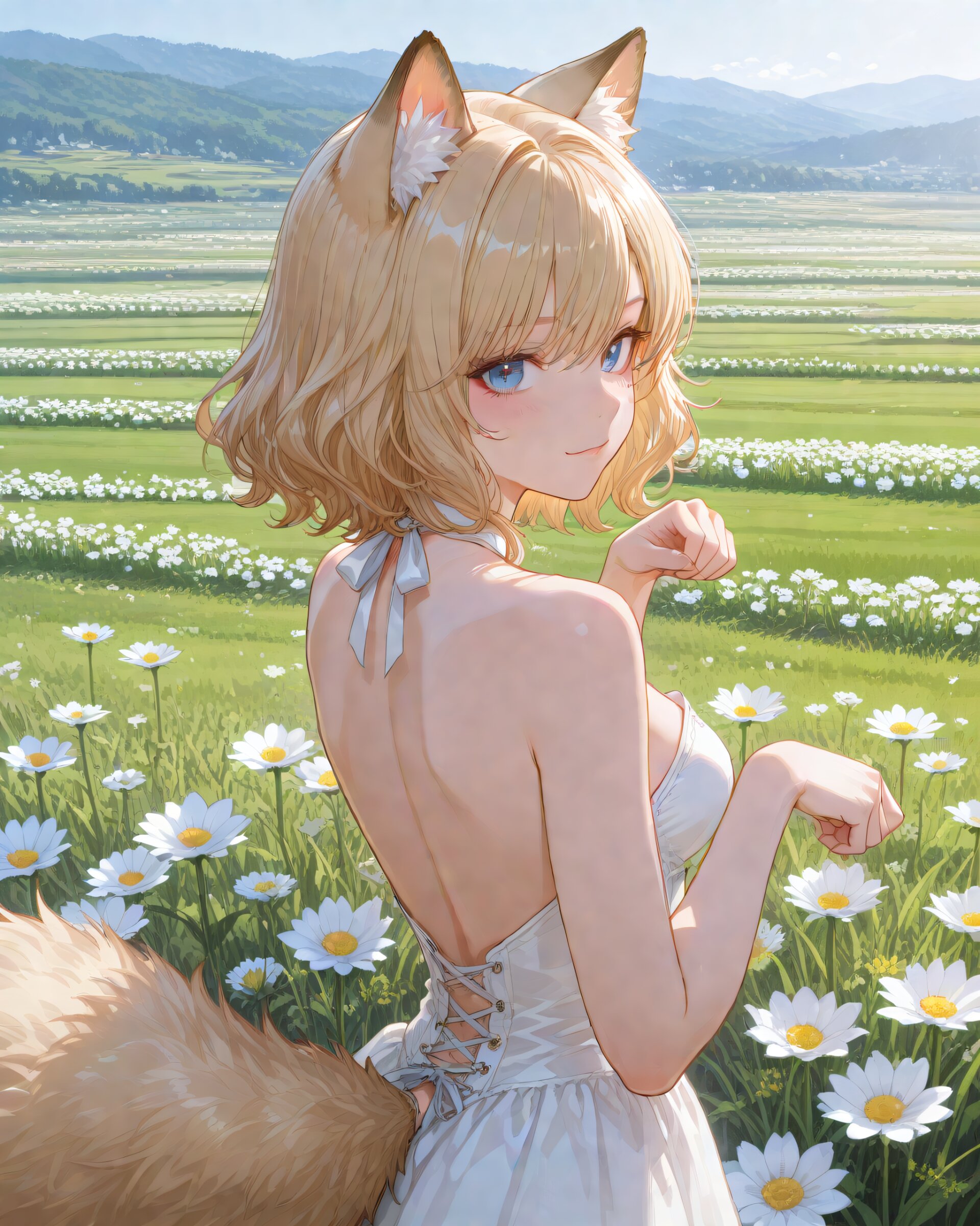 <lora:hyper_sdxl_8_step_lora_f16:1>,, A happy girl, fluffy cat ears, paw pose, back shot, looking viewer, The background is a picturesque spring landscape featuring blooming flowers and rolling green hills, sunny day, BREAK 18 years old, girl, short hair, wavy blonde hair, swept bangs, medium breasts, slender, frosty blue eyes, BREAK masterpiece, amazing quality, best quality, very aesthetic, ultra-detailed, 8K, newest, vivid, dramatic lighting,