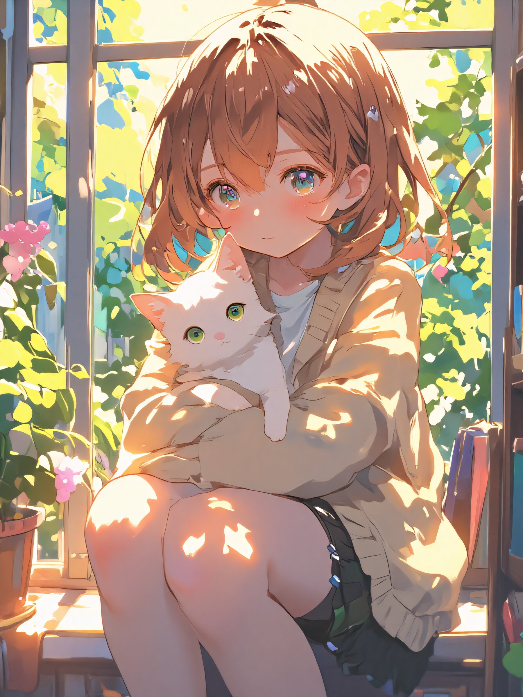 An anime-style girl sitting gently on a cozy windowsill, holding a playful, fluffy cat in her arms. Her medium-length chestnut hair cascades softly, adorned with a small ribbon, and her warm smile radiates affection as the cat nuzzles close to her. She wears a comfortable yet stylish outfit\u2014a cute cardigan and skirt or a casual dress, adding to the homely atmosphere. The cat, with silky white fur and bright emerald eyes, looks up at her with an endearing curiosity, its tail swishing lightly. The background features a serene interior setting\u2014a softly lit room with blooming potted plants and bookshelves, and the window frames a peaceful view of a sunny garden. Highly detailed, soft and heartwarming tones, blending charm, warmth, and playful anime aesthetics.