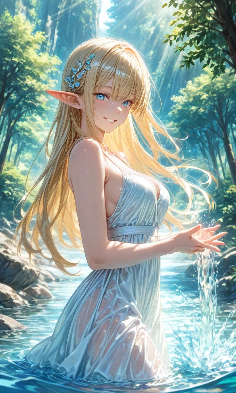 score_9, score_8_up, score_7_up, source_anime, masterpiece, amazing, very aesthetic, high resolution, ultra-detailed, absurdres, newest, scenery, 2d, semi-realistic, moe heroine, sharp focus, nice hands, perfect hands, perfect anatomy, perfect structure, (outdoors, 1girl, solo), cowboy shot, from side, low angle, BREAK, An anime-style vertical digital illustration featuring a glamorous blonde-haired, blue-eyed elf girl playing in a shallow, crystal-clear forest stream on a sunny early summer day. She wears a flowing white pastel tiered dress, slightly splashed with water, and smiles brightly as she splashes water into the air with her hands. Her expression is lively and joyful. Droplets glisten in the sunlight, surrounded by fresh green trees and dappled light filtering through the leaves. The atmosphere is playful, refreshing, and filled with the vibrant energy of summer. The camera is closer, showing her clearly, emphasizing her playful interaction with the water. BREAK, ultra detailed lips, ultra detailed face and hair, kawaii, adorable, cute, elf girl, (apatite eyes with CGI effect), (deep blonde hair:1.2), medium breasts, wide hip, grin face, BREAK, photorealistic, masterpiece, very aesthetic, high resolution, ultra-detailed, absurdres, newest, scenery, volumetric lighting,elf-san,