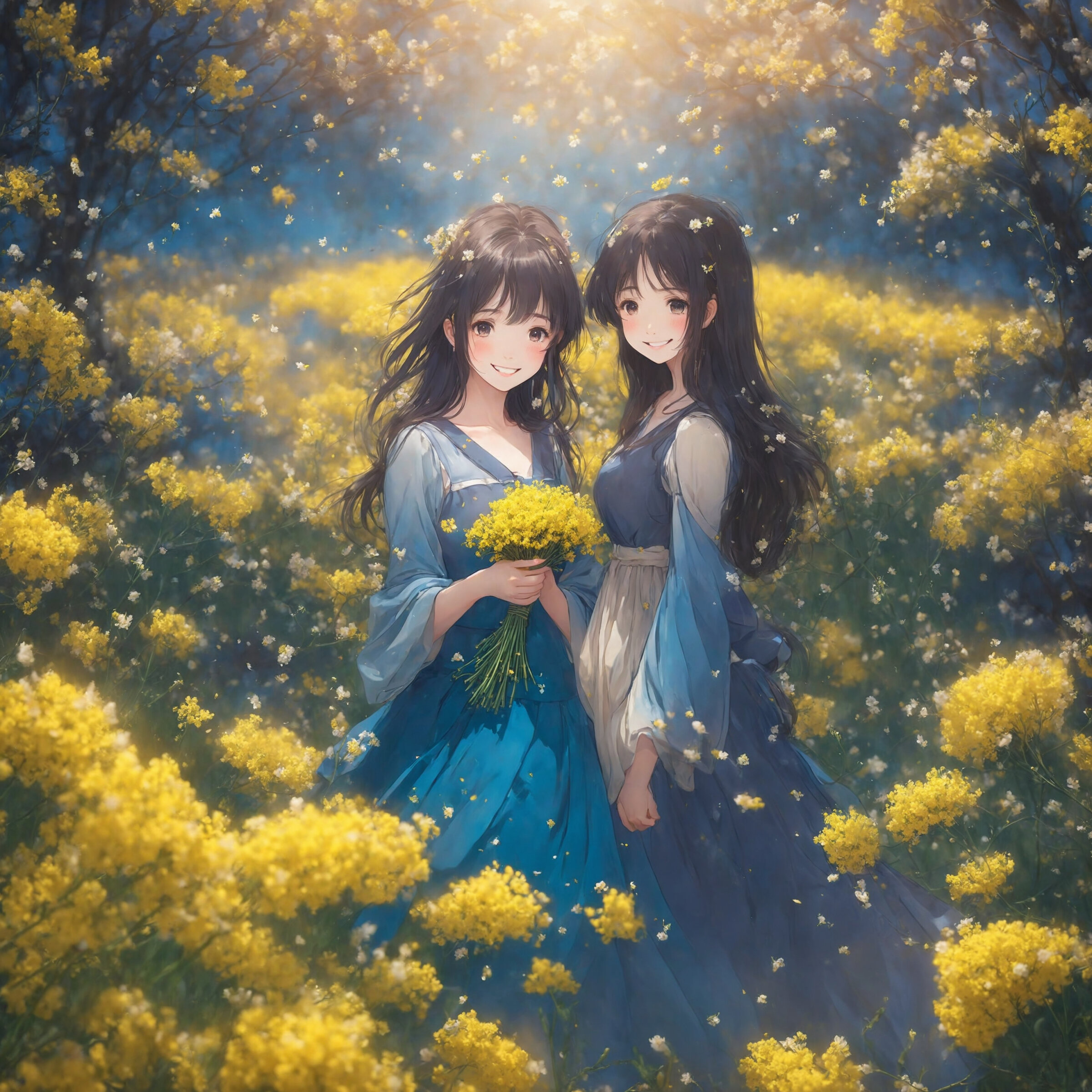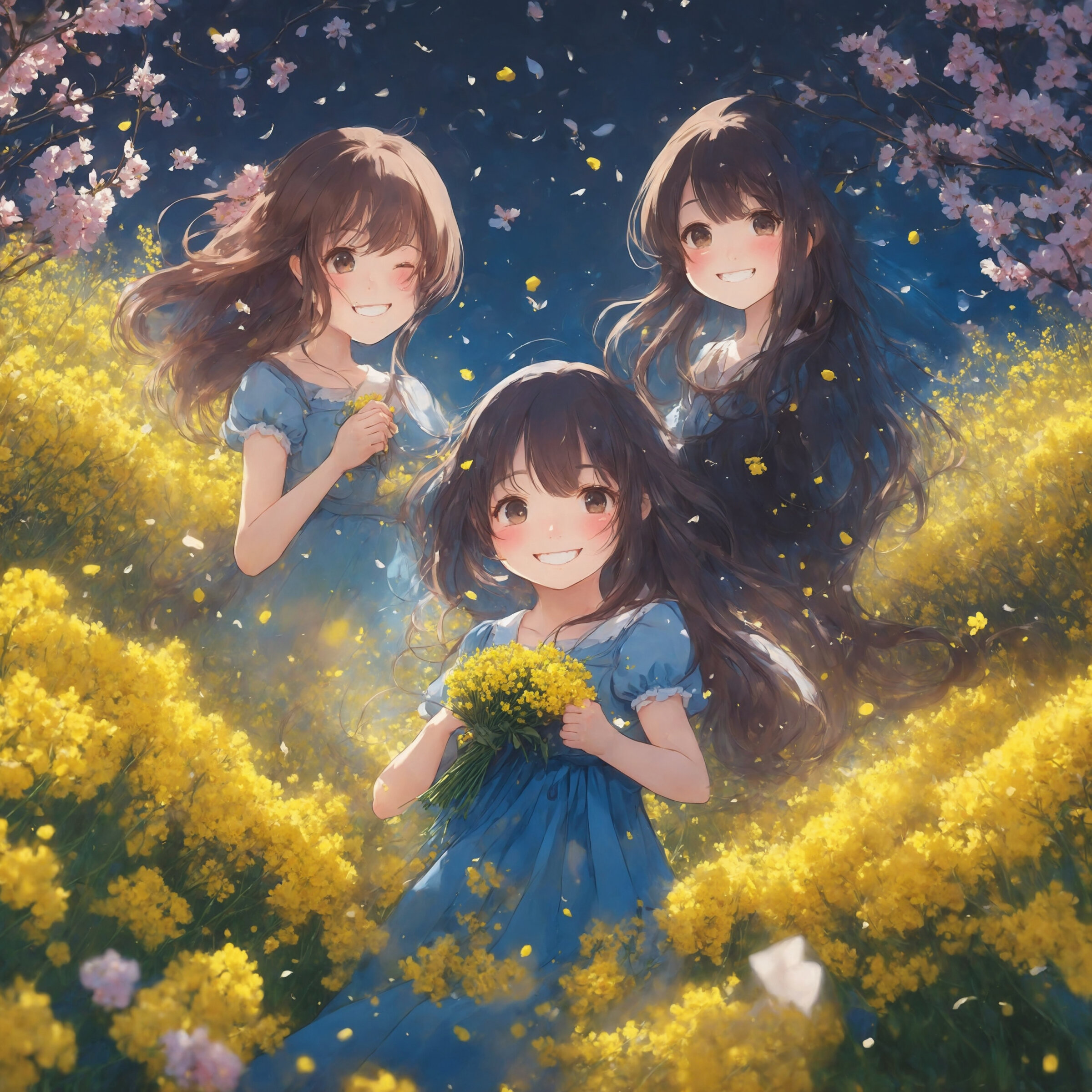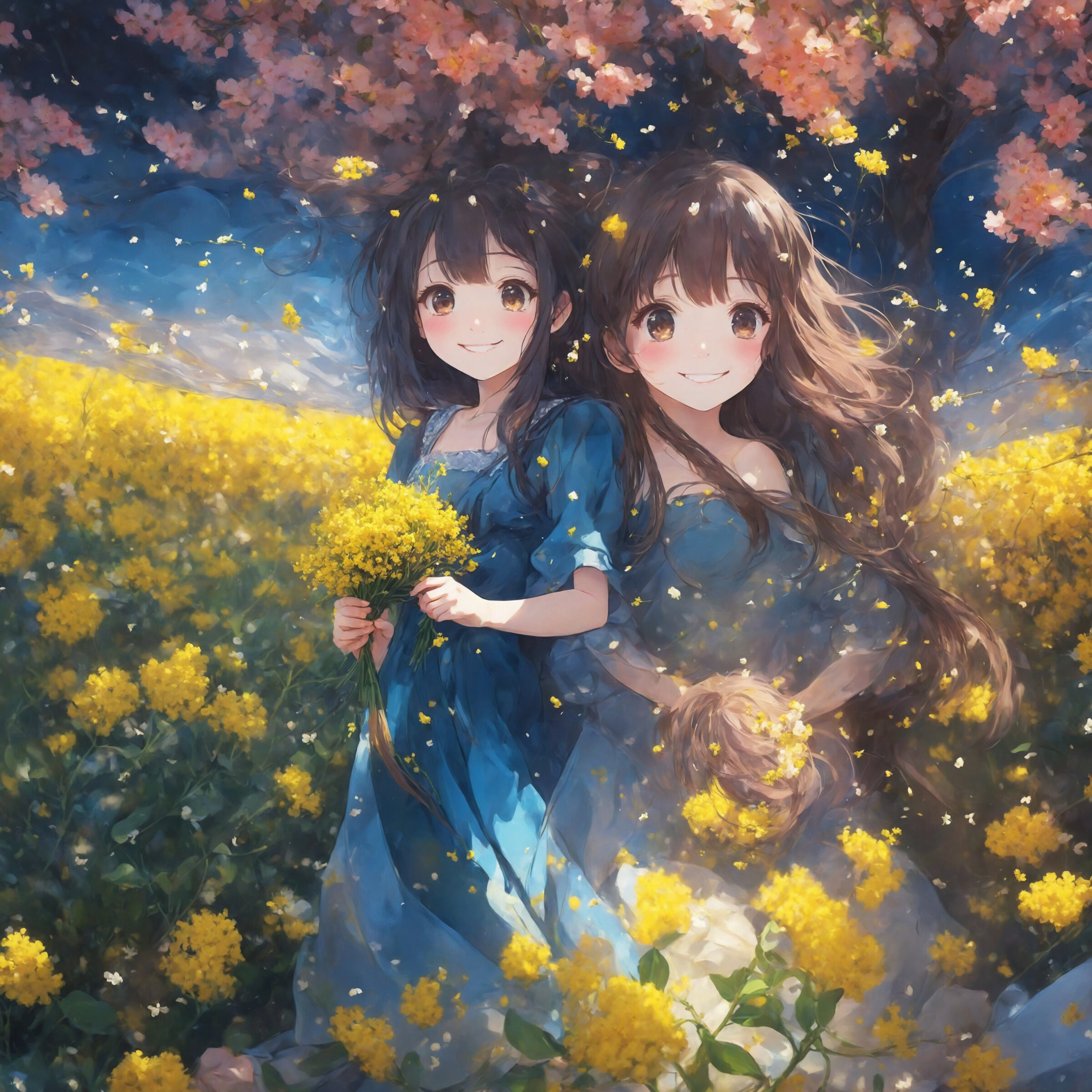 masterpiece, best quality, animation style,anime colored, illustration,2 lady, middle breasts, cherry blossom, happy, smile, white mini dress,mini skirt, BREAK, midnight, galaxy, milky way, rapeseed flowers, 100+ pastel multicolored cherry blossom, magic particles, in the park, falling petals, buried in colorful petals,2 sisters with happy expressions surrounded by cherry blossoms and rapeseed fields