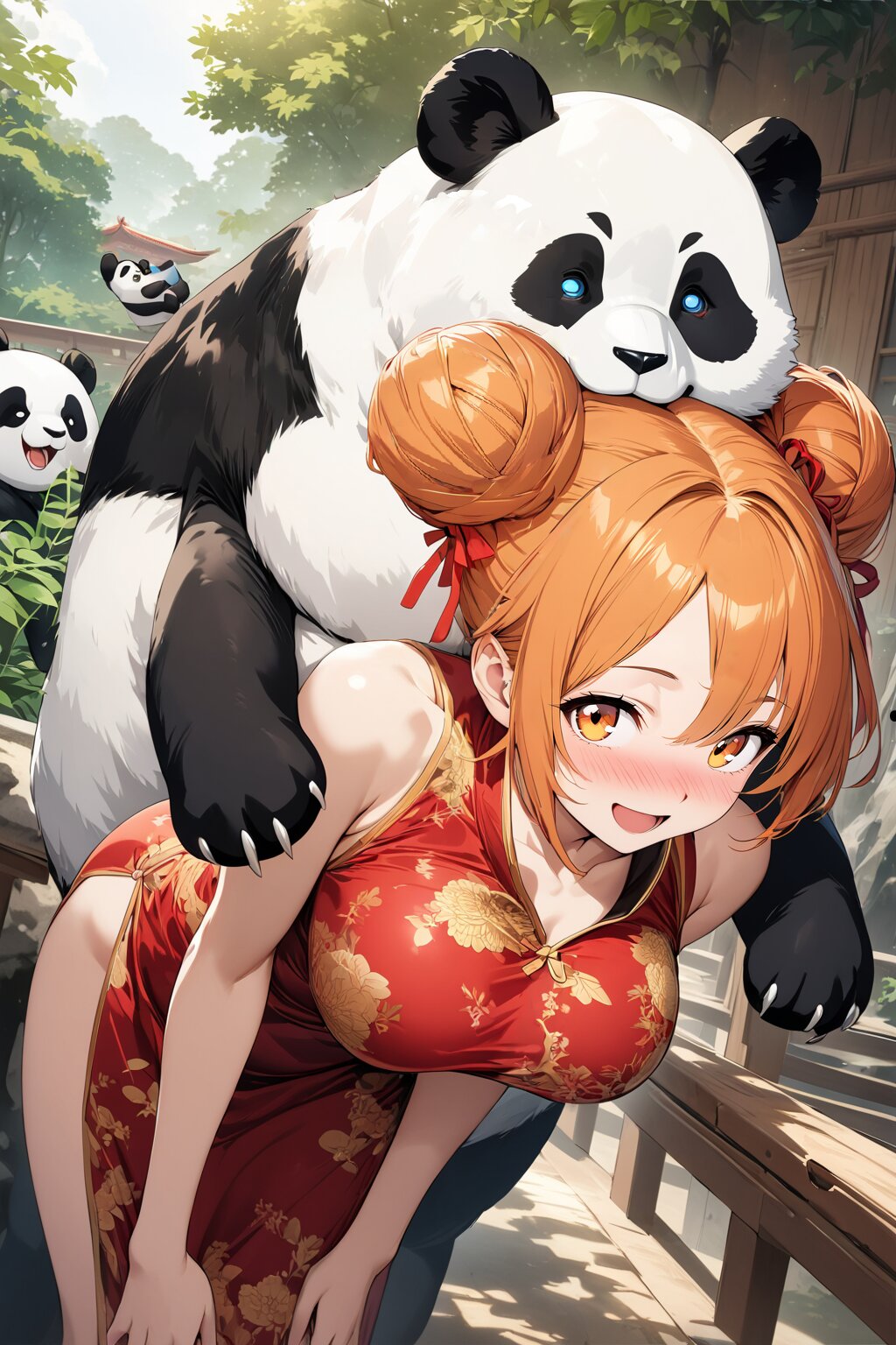 1girl, zoo,panda, large breasts, orange hair,(double bun),(center parted bangs),sideburns,hair side red string ribbon, small orange eyes, noseblush,naughty smile,open mouth,smile, china dress, (hug large panda),leaning forward,arched back, upper body,dynamic angle,looking at viewer,ftom side:0.8, ((best quality)),((very high resolution)),full color,((ultra detailed)),extremely detailed CG,super fine illustration, manga style,hyperrealistic, perfect anatomy,super detailed skin,(beautiful detailed clear eyes),