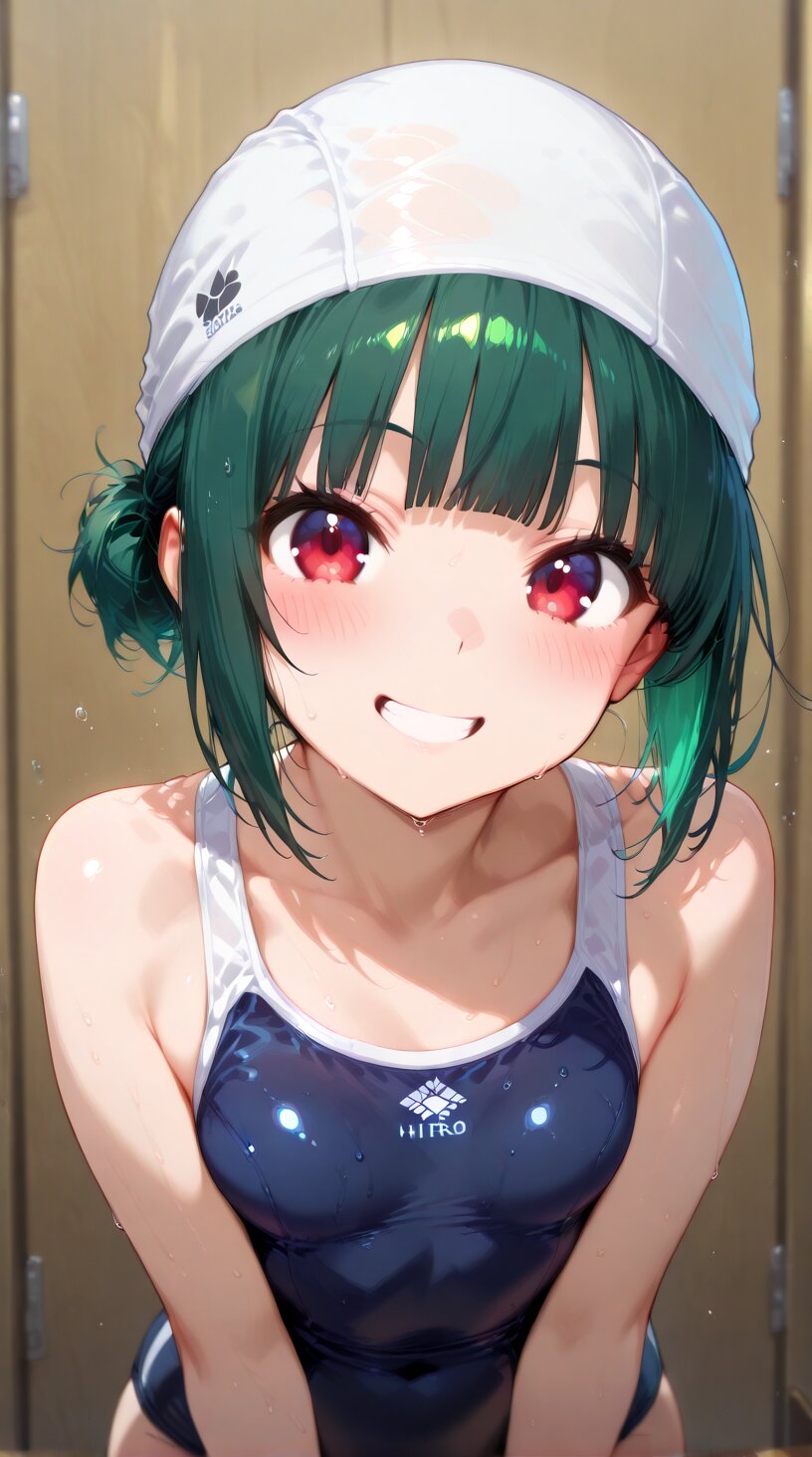 masterpiece,best quality,ultra-detailed,high resolution,super detailed skin,beautiful detailed eyes,1girl,green hair,very short hair, hime cut,blush,red eyes,small breasts, swim cap, smile, grin, school swim suit, learning forward