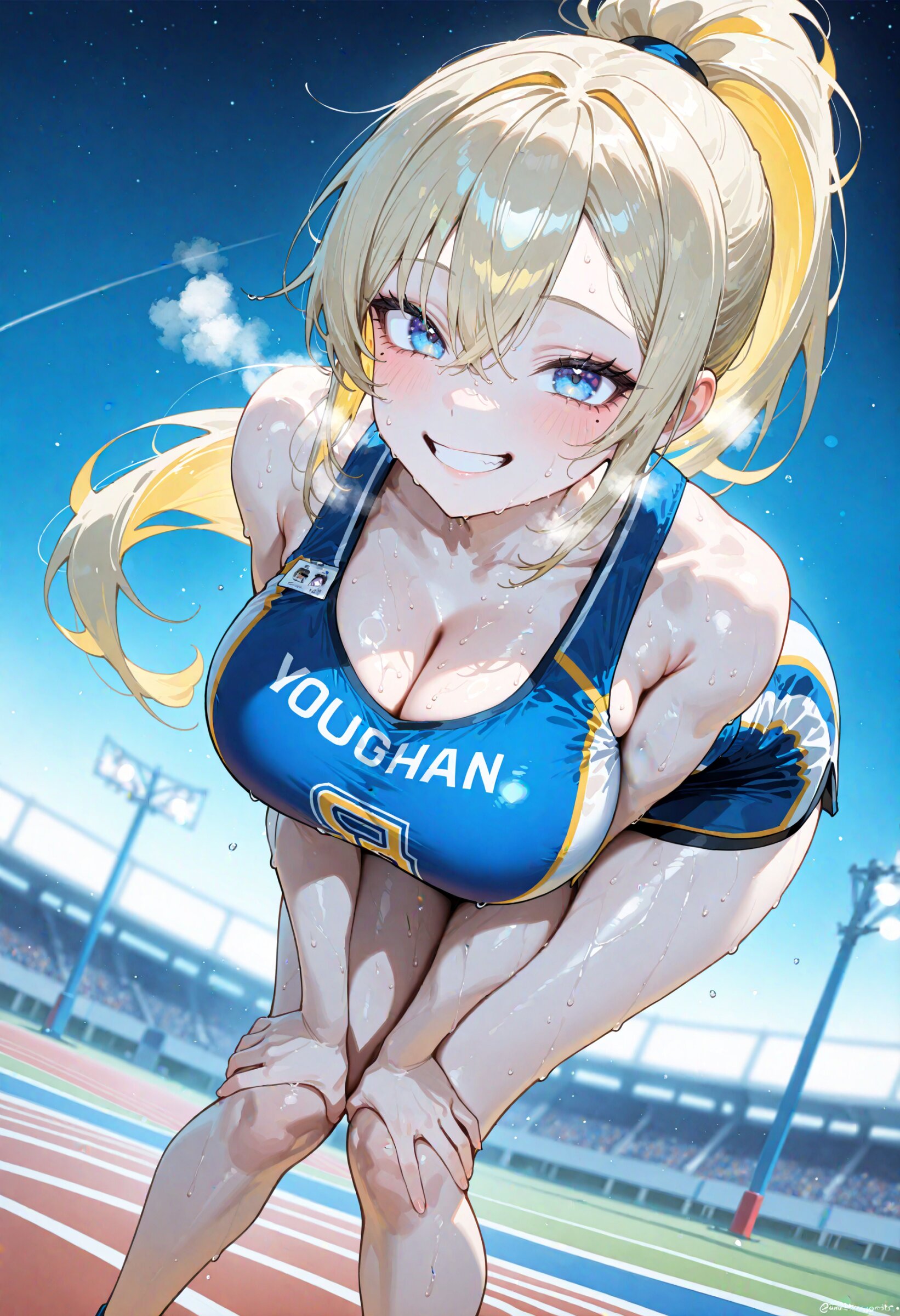 (close up:1.3), knees out of frame (from above,looking up:1.2) looking at viewer, 1girl, gyaru beautiful detailed eyes, cute face, cool, pale skin, skindentation, beautiful celadon eyes, mole under eye , blonde hair, darkmagenta colored inner hair cute, extra long hair, high ponytail choppy bangs , fine hair, first-rate female body perfect body beautiful framed breasts, cleavage, wide hips, ,, curvy shiny eyes, vivid tone, (muscular female:1.0), (basketball uniform:1.0), see-through clothes, tough athlete girl, (sweaty:1.0), wet, good smell, leaning forward, hands on own thighs, huge hip, provocative smiling, blowing wind,abdomen, starry sky, track and field, night illumination depth of field, bokeh, super fine concept art, hard surface, 8K, unreal engine, masterpiece, best quality, amazing quality, very aesthetic, absurdres, you can add tag scenery, (volumetric lighting), To make the background more distinctive. professional art lots of details, , overexposure, shiny-glistening, (watercolor style:1.2), (pastel color style:1.2) <lora:noline (1):-0.5> <lora:sdxl2-flat2-512b:0.0> <lora:facelightup_xl_v10:0.5>