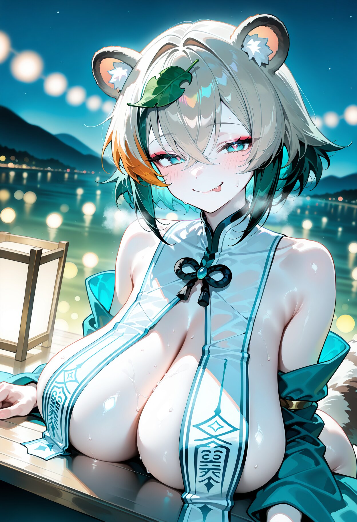 foreshortening, (close to viewer:1.2), knees out of frame looking at viewer, 1girl, beautiful detailed eyes, cute face, cool, dark skin, skindentation, beautiful garnet eyes, , , two-tone hair, cobalt blue and lime green hair cute, extra long hair, french braid center-flap bangs , , first-rate female body perfect body beautiful plump, huge breasts, cleavage, huge ass, thigh gap, curvy, dog ears, dog tail, (maroon thong in maroon hakama, detached sleeves:1.0), black thighhighs, low strap, closed mouth, heavy breathing, groin, , steaming body sideboob, collarbone, depth of field, bokeh, (simple watercolor background:1.0), (wearing japanese clothes, ofuda maebari, breast curtains, detached collar, tabi:1.1), geta, , yokozuwari, opened by self, , , , super fine concept art, 8K, unreal engine, masterpiece, best quality, amazing quality, very aesthetic, absurdres, you can add scenery, (volumetric lighting), To make the background more distinctive. professional art lots of details, , overexposure, shiny-glistening, (watercolor style:1.0), (pastel color style:1.0) <lora:noline (1):-0.5> <lora:sdxl2-flat2-512b:0.0> <lora:facelightup_xl_v10:0.5>