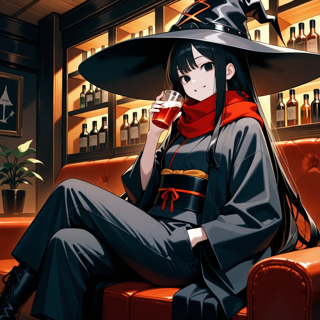 masterpiece,best quality,highres,highly detailed,detailed eyes,general,1girl,solo,(hand in pocket,holding cold drink,Witch's black hat,long red scarf,grin),17 years old,cute girl,slender,small breasts,very long sleeves,light smile,black hair,long hair,bangs,black eyes,Witch girl,(very long black Witch's cloak,very long black Witch's kimono robe, black obi,long black cargo pants),boots,slender girl,sitting sofa,in bar,upper body,fantasy,