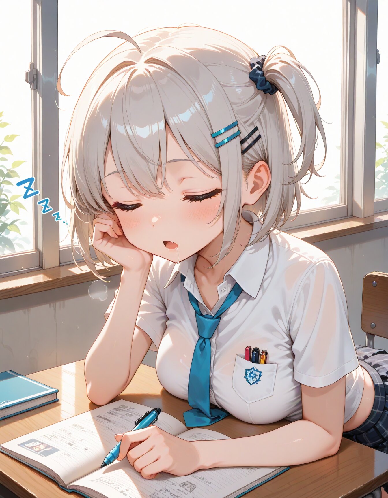 1girl, fallen asleep face flat on her desk, drowsily, doze off, Zzz, (closed eyes:1.2), leaning forward, school uniform, short sleeve shirt, sitting, ahoge, bob cut hair, medium breasts, a pen on table, notebook on table, notebook filled with letters, drooling, drivel, saliva, classroom, open mouth,