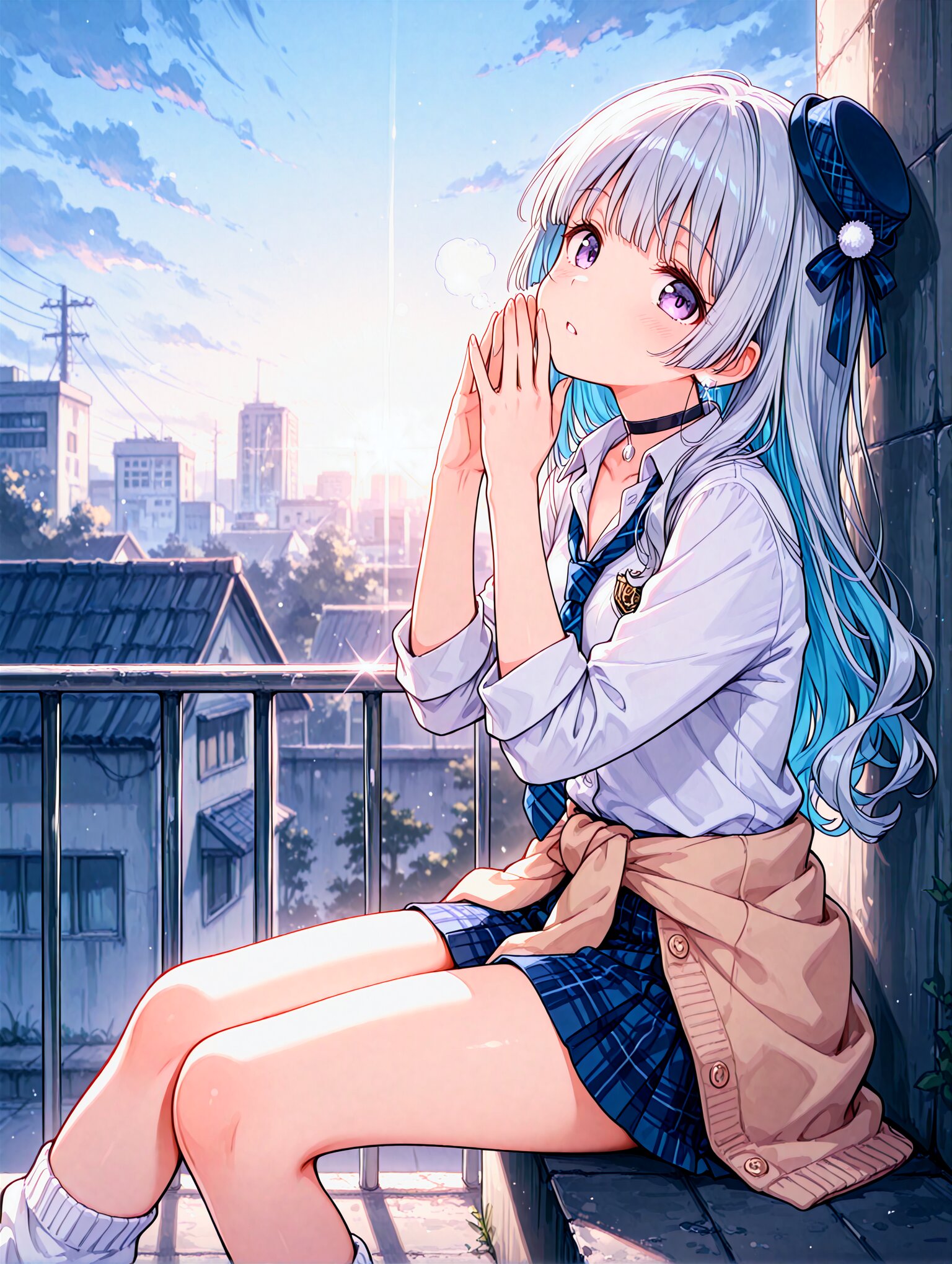 beautiful detailed background, best quality, (pale color:0.7), portrait, feet out of frame,(evening:0.8), rooftop,backlight,glint, solo, kogal,loose socks, plaid blue necktie, plaid blue skirt, ribbon, school uniform,white shirt, small breasts, partially unbuttoned, pom_pom_(clothes), jewelry, wrap a sweater around your waist, parted lips,(Expressionless:0.9),(grin:0.6),(evil smile:0.6), big eyes,(half-closed eyes:0.7), (tareme:1.2), pale purple eyes, thighs, (silver hair:1.1),(dark blue hair colored inner hair:0.8), working,outdoors, long hair,hime cut, (wavy hair,:0.8) eyebrows visible through hair, mini hat, blue strapping ribbon and bow, frills, (strapping ribbon,:0.7) choker,neck,collarbone,, (hands up,:0.8),(whispering:1.1), Secret talk,(whisper:0.8), (from side,:0.9) , looking at viewer, ,head back, pov <lora:noline-16oa:-1.5>