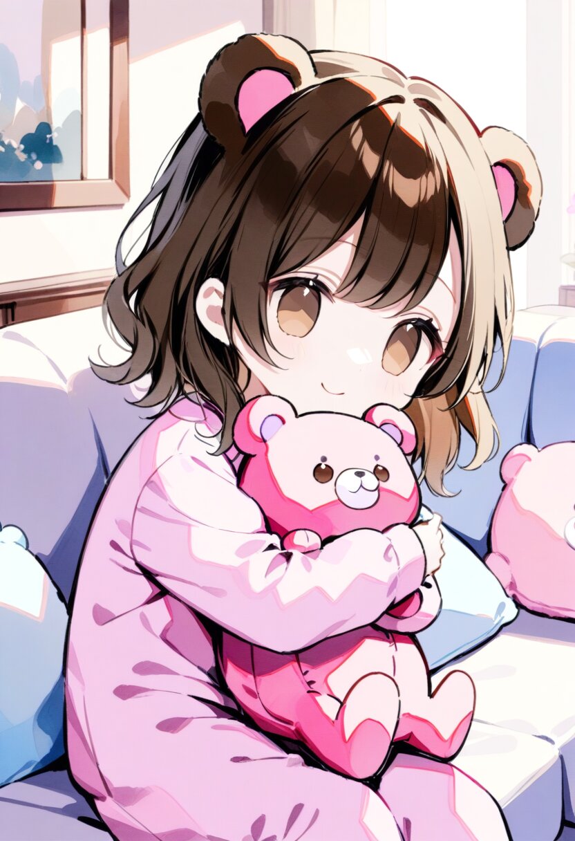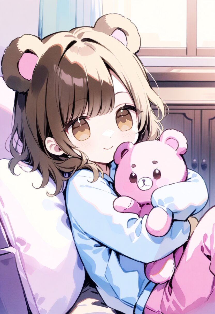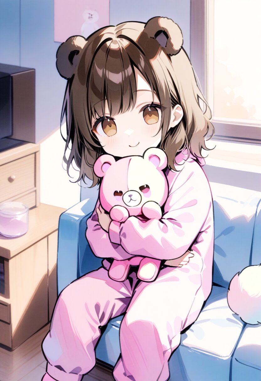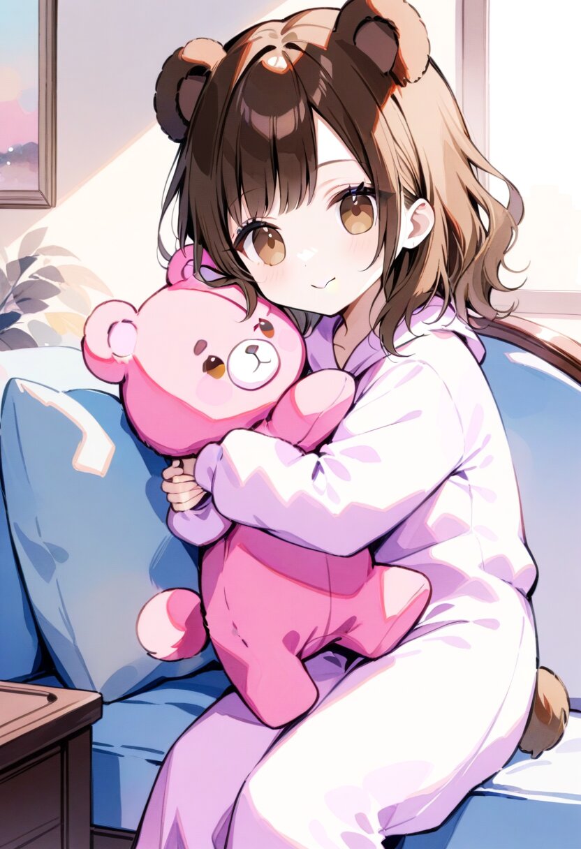 <lora:inmnstylexl:1> <lora:yumekawaii_ftr:1>best quality, masterpiece, very aesthetic, watercolor painting, pastel colors, general, chibi, 1girl, bear ears, bear tail, brown hair, medium hair, wavy hair, brown eyes, smile, pink onesie, lying sofa, hugging teddy bear, living room