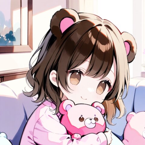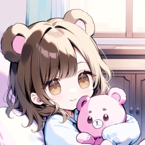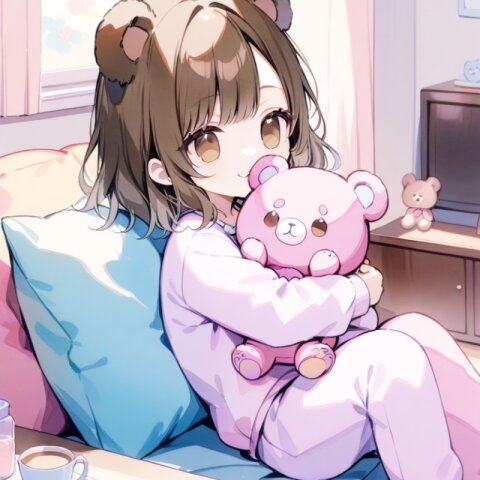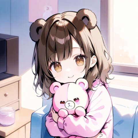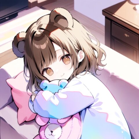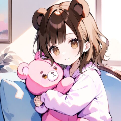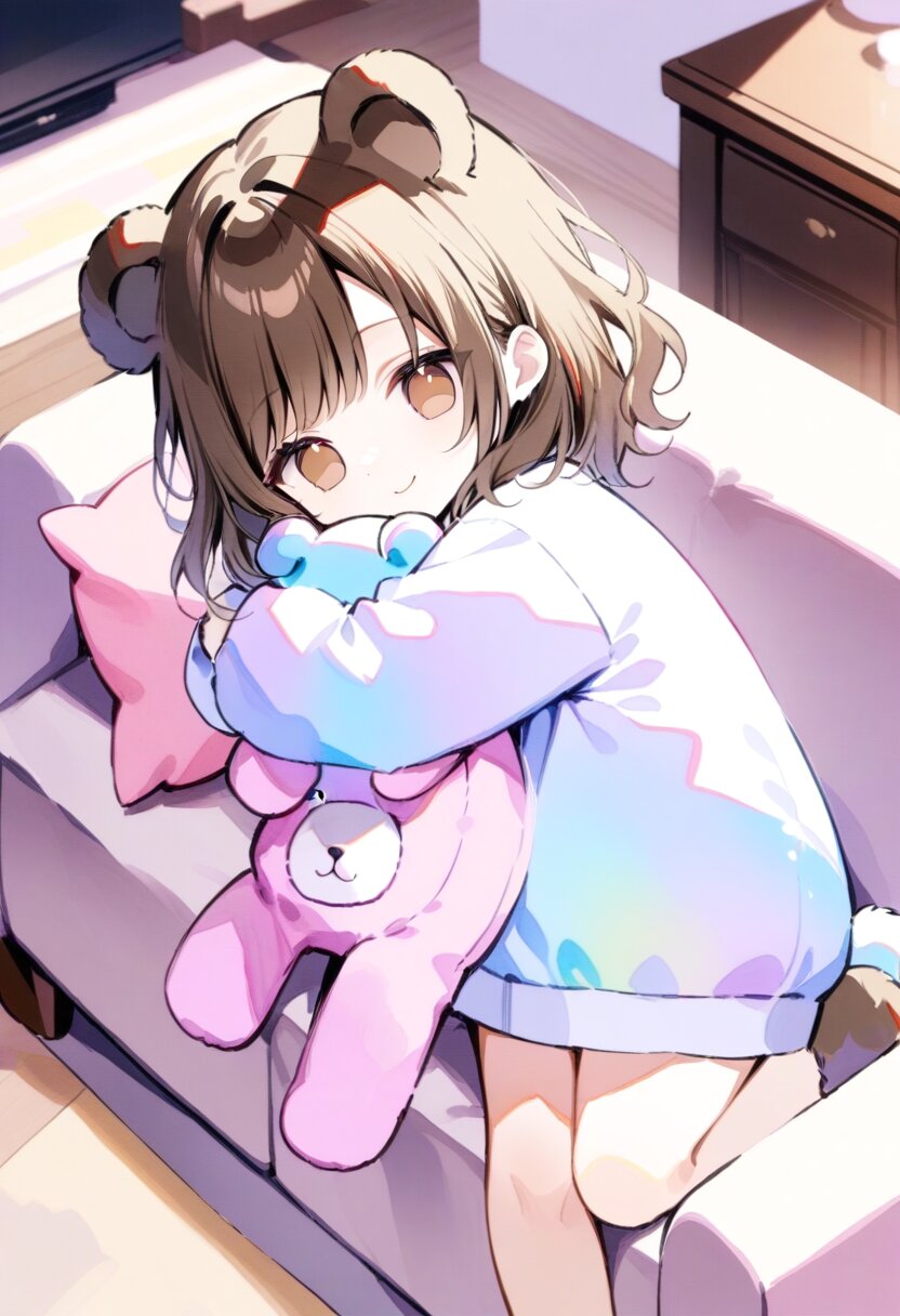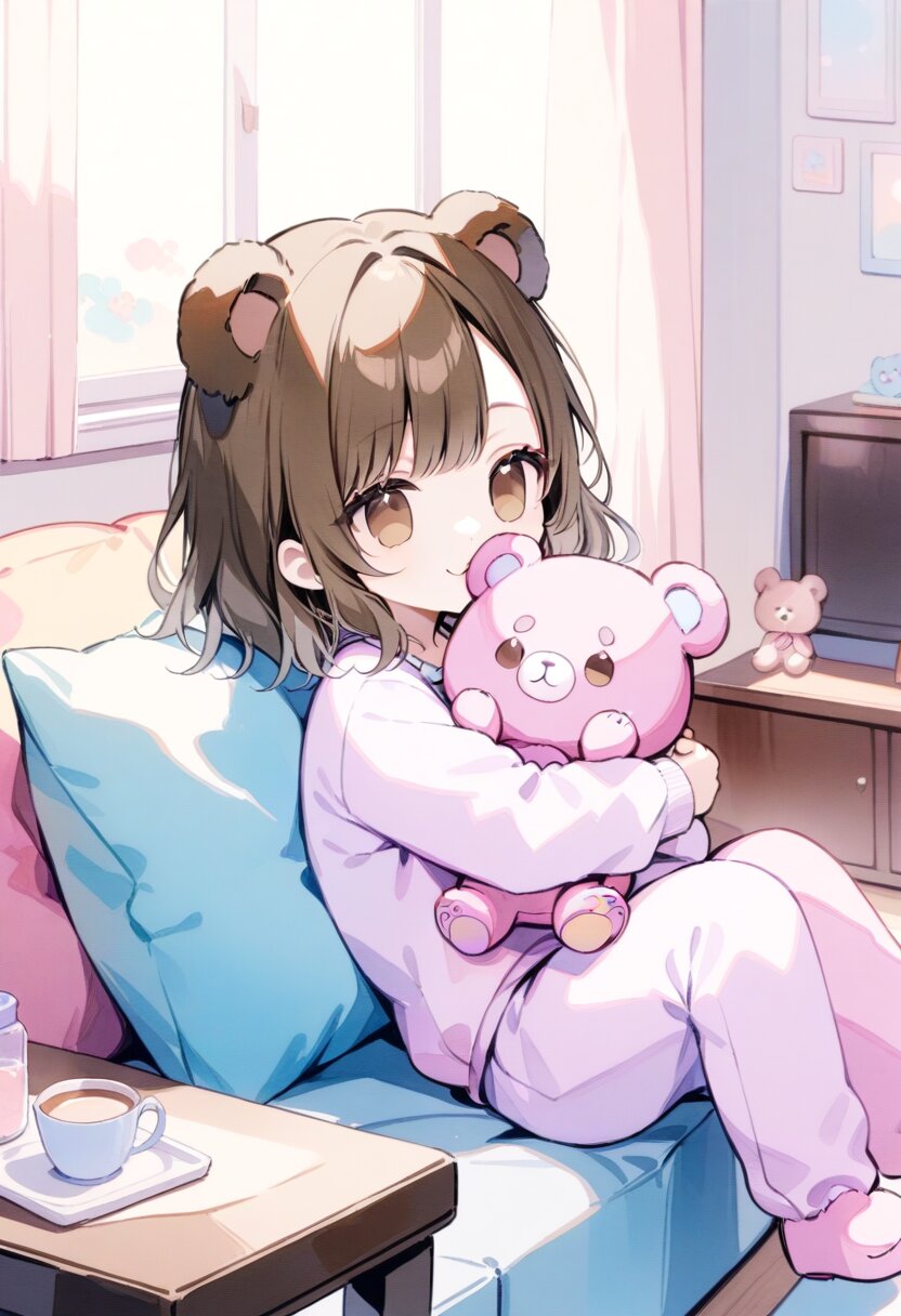 <lora:inmnstylexl:1> <lora:yumekawaii_ftr:1>best quality, masterpiece, very aesthetic, watercolor painting, pastel colors, general, chibi, 1girl, bear ears, bear tail, brown hair, medium hair, wavy hair, brown eyes, smile, pink onesie, lying sofa, hugging teddy bear, living room