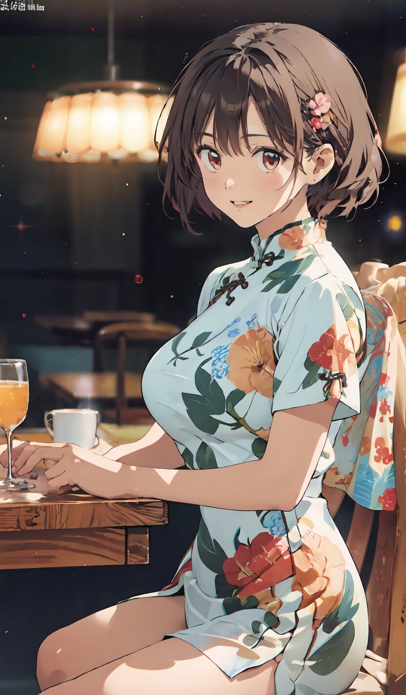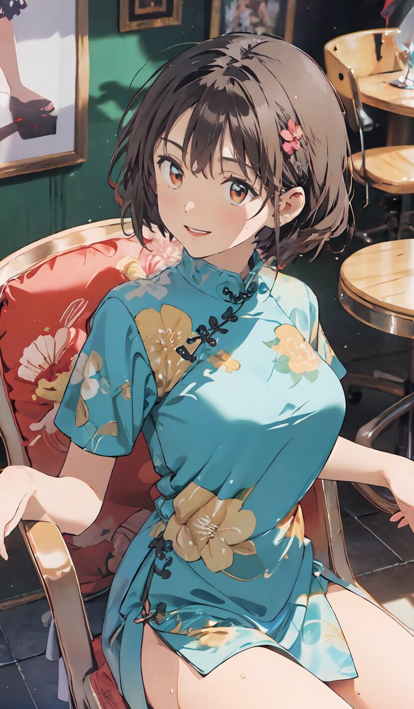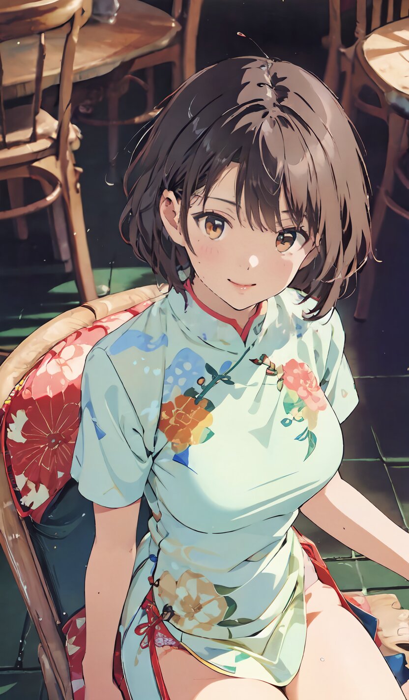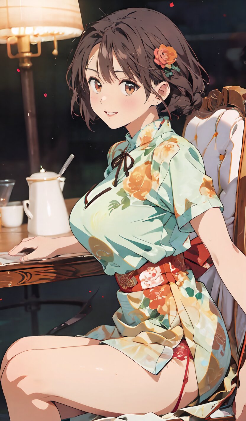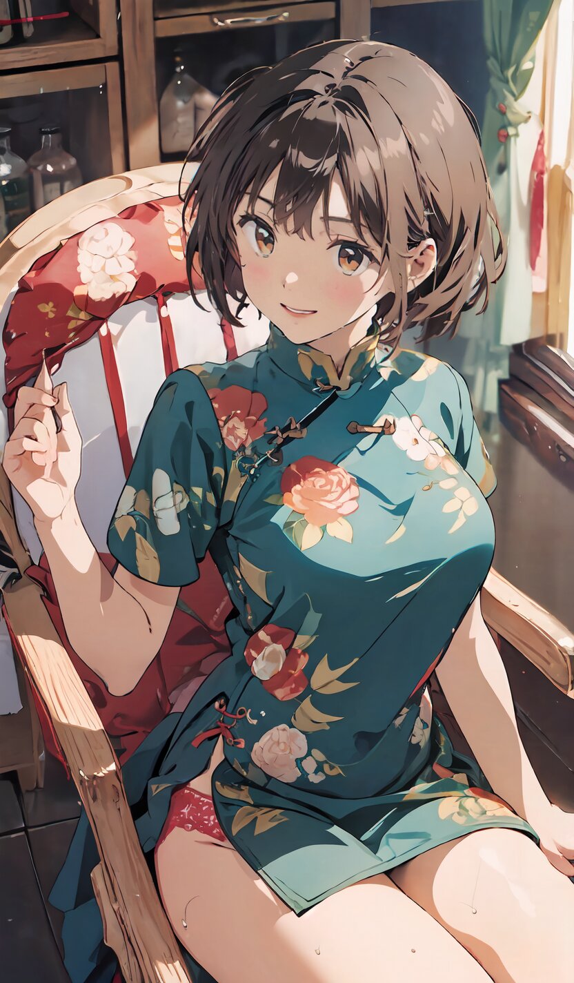random angle, (8k, best quality, masterpiece:1), (realistic, photo-realistic:1.4), HDR, (incredibly absurdres:1.2), (sexy pose: 1.6), 1woman, 18 years old, perfect anatomy, slender, huge breasts, beautiful detailed face, (cowboy shot: 1.6), perfect skin, detailed skin texture, looking aside, (Qipao Dress, Short Sleeve, Mandarin Collar, Dark Green with Brown & Beige Floral Print, red panties: 1.2), (sitting on chair: 1.6), in the night pub, <lora:mariM_v01:1>