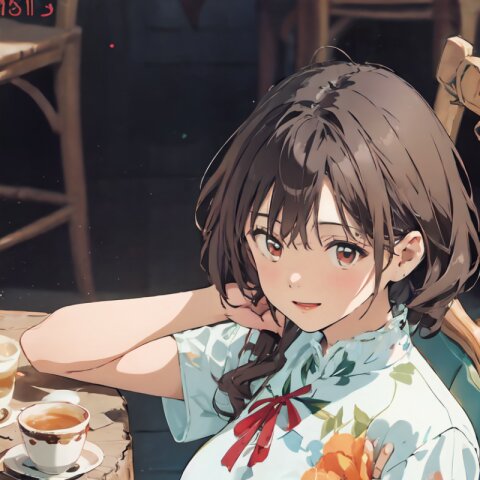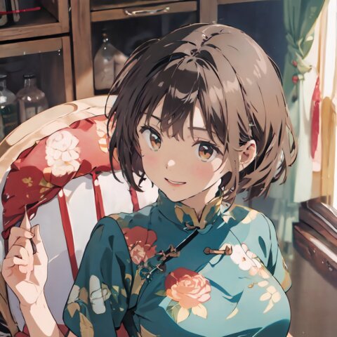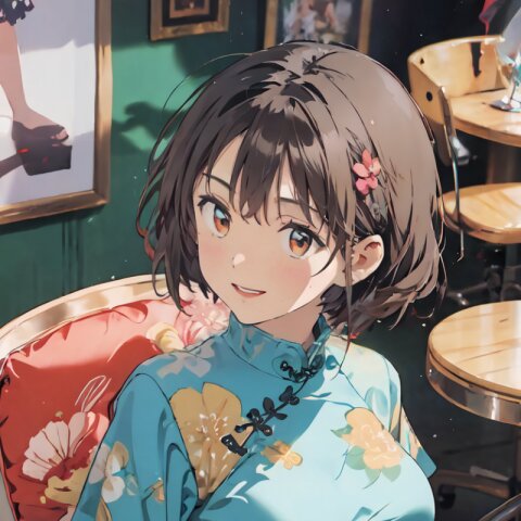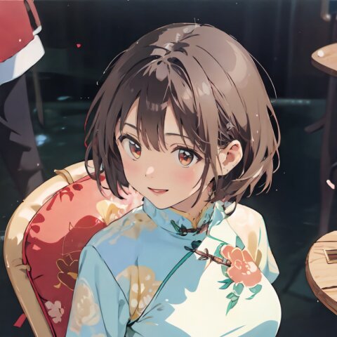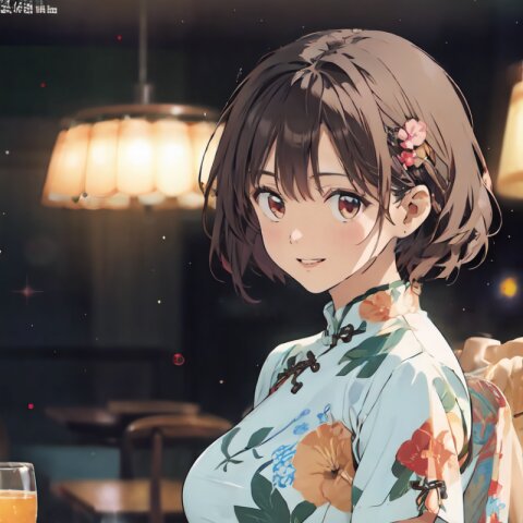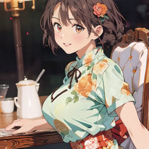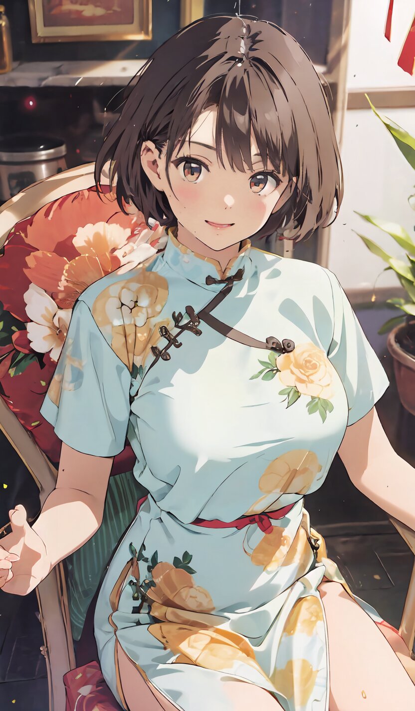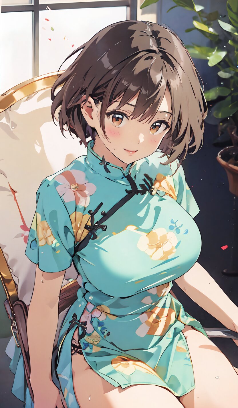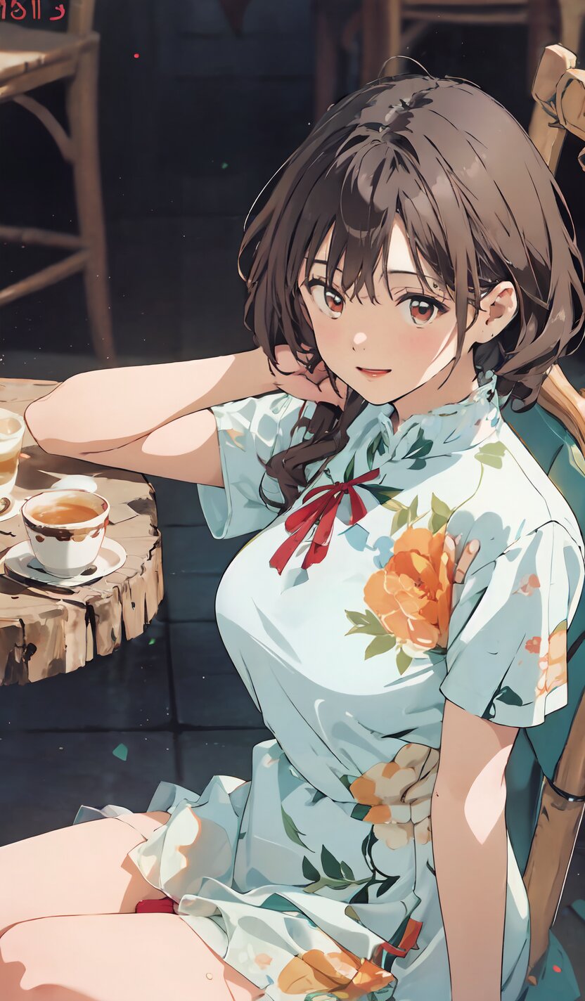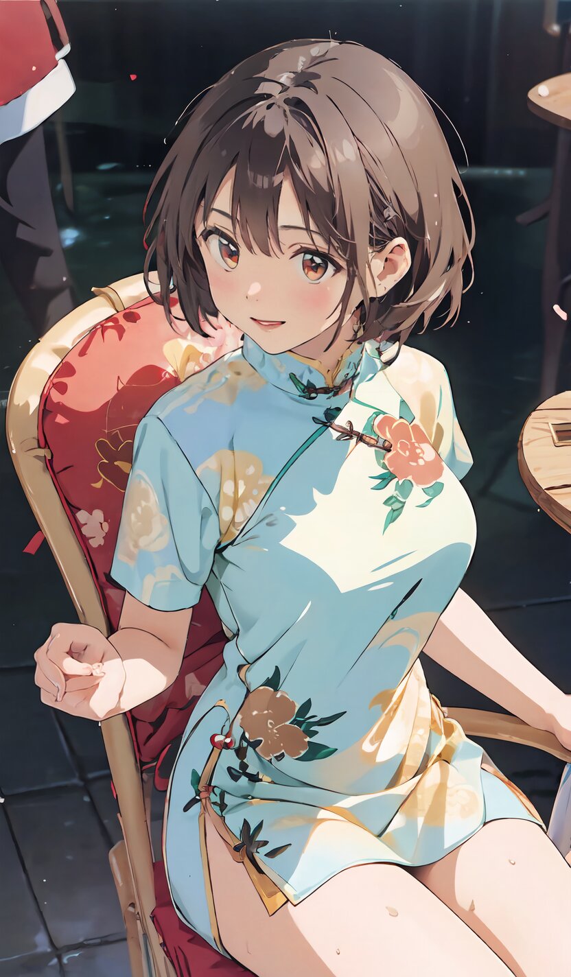 random angle, (8k, best quality, masterpiece:1), (realistic, photo-realistic:1.4), HDR, (incredibly absurdres:1.2), (sexy pose: 1.6), 1woman, 18 years old, perfect anatomy, slender, huge breasts, beautiful detailed face, (cowboy shot: 1.6), perfect skin, detailed skin texture, looking aside, (Qipao Dress, Short Sleeve, Mandarin Collar, Dark Green with Brown & Beige Floral Print, red panties: 1.2), (sitting on chair: 1.6), in the night pub, <lora:mariM_v01:1>