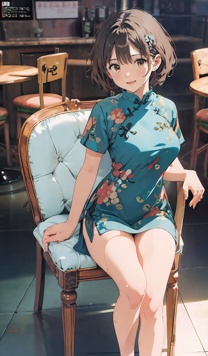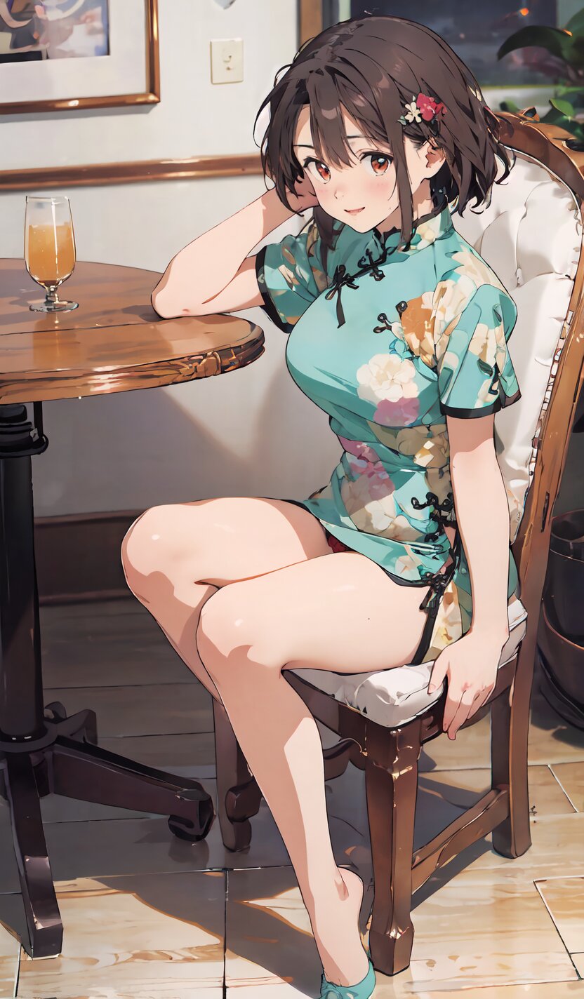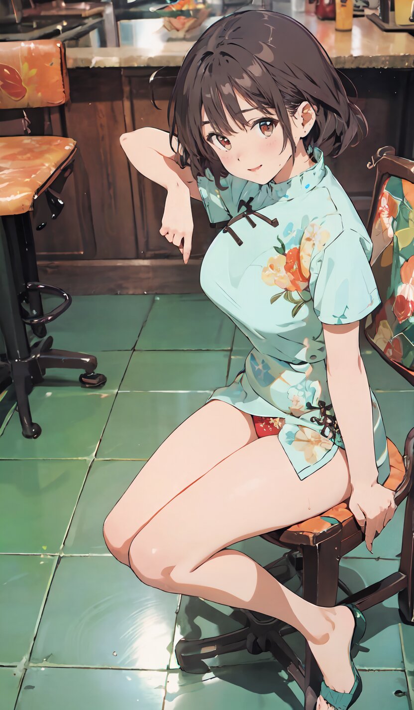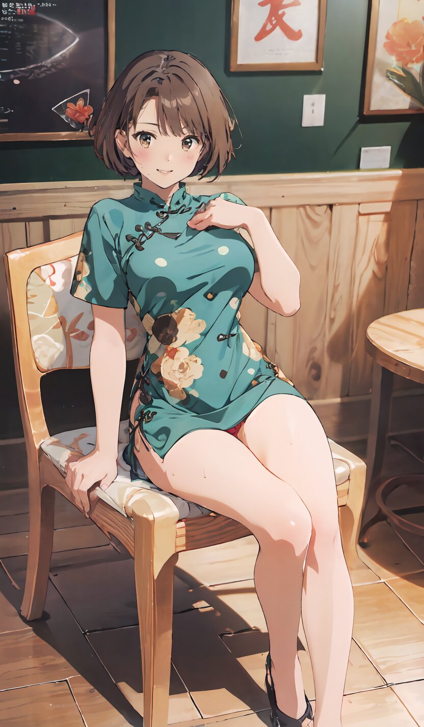 random angle, (8k, best quality, masterpiece:1), (realistic, photo-realistic:1.4), HDR, (incredibly absurdres:1.2), (sexy pose: 1.6), 1woman, 18 years old, perfect anatomy, slender, huge breasts, beautiful detailed face, (full body: 1.6), perfect skin, detailed skin texture, looking aside, (Qipao Dress, Short Sleeve, Mandarin Collar, Dark Green with Brown & Beige Floral Print, red panties: 1.2), (sitting on chair, showing sexy legs line: 1.6), in the night pub, <lora:mariM_v01:1>