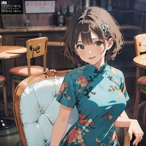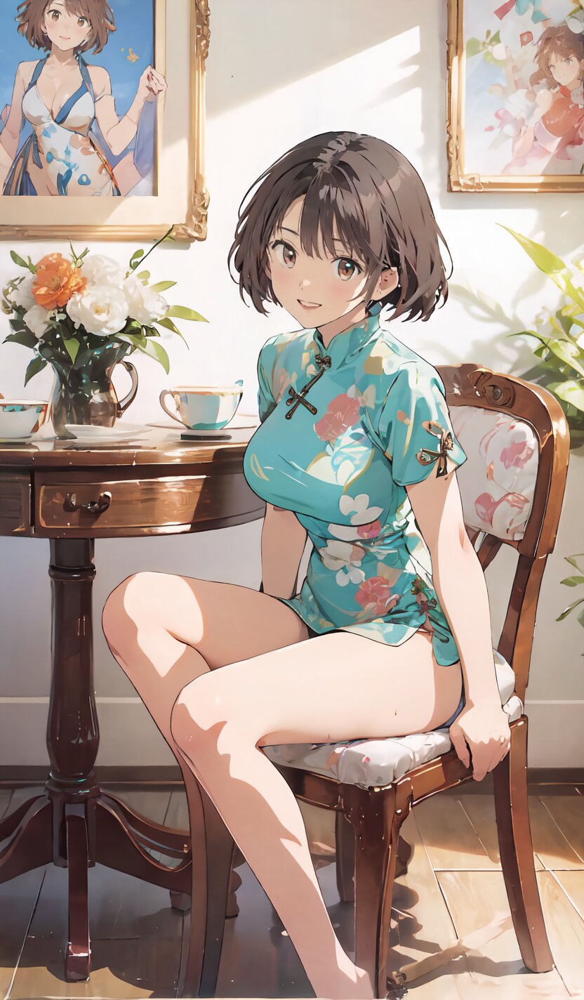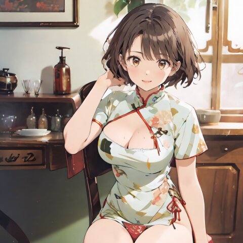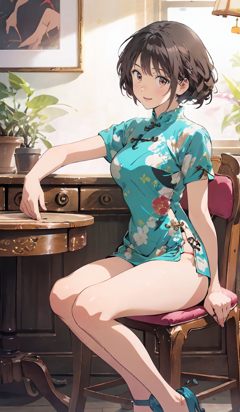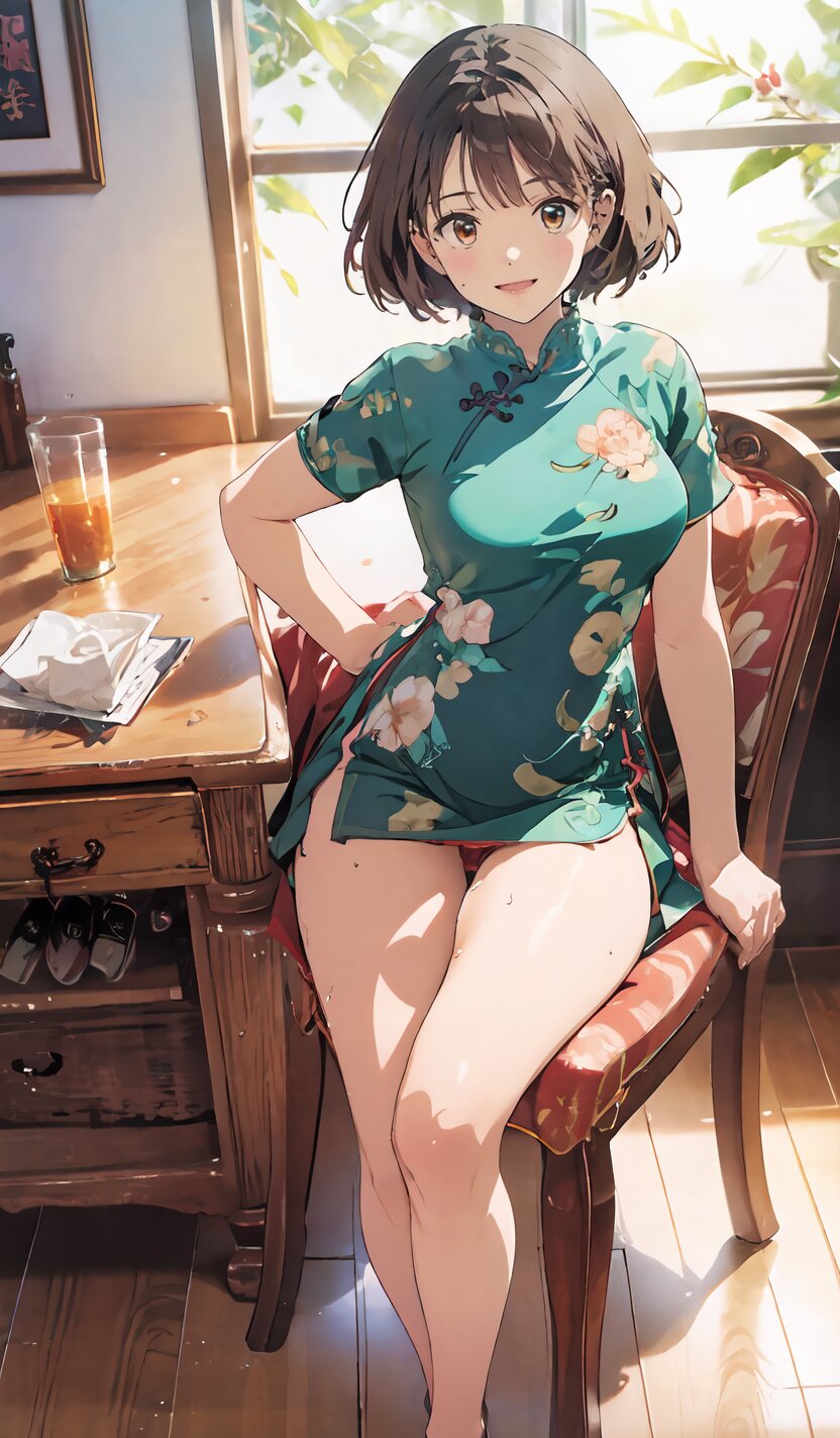 random angle, (8k, best quality, masterpiece:1), (realistic, photo-realistic:1.4), HDR, (incredibly absurdres:1.2), (sexy pose: 1.6), 1woman, 18 years old, perfect anatomy, slender, huge breasts, beautiful detailed face, (full body: 1.6), perfect skin, detailed skin texture, looking aside, (Qipao Dress, Short Sleeve, Mandarin Collar, Dark Green with Brown & Beige Floral Print, red panties: 1.2), (sitting on chair, showing sexy legs line: 1.6), in the night pub, <lora:mariM_v01:1>