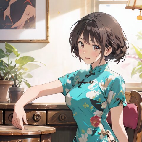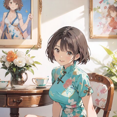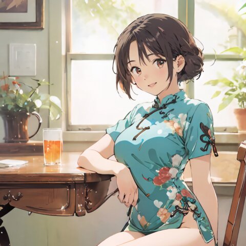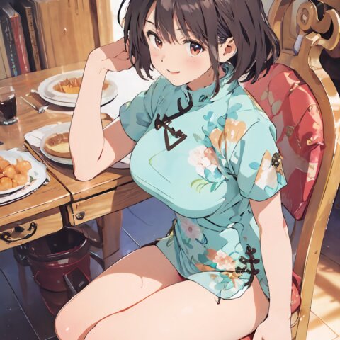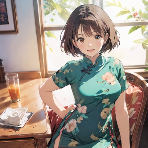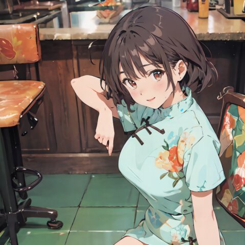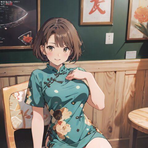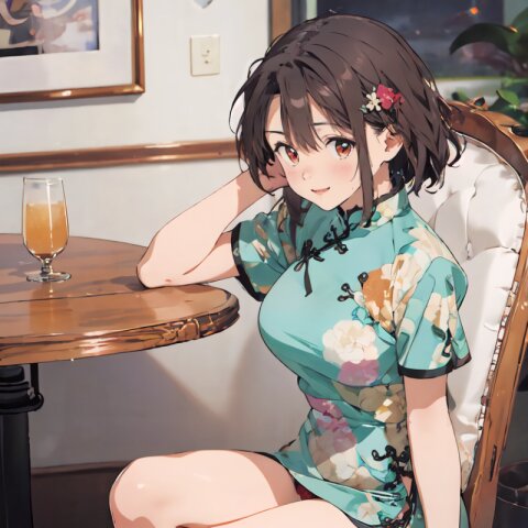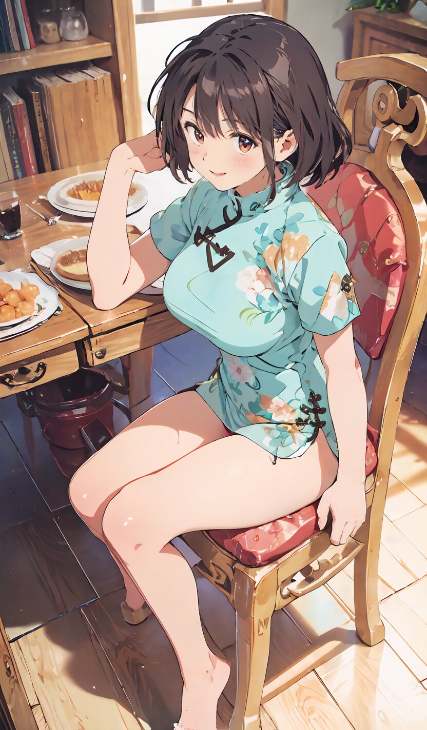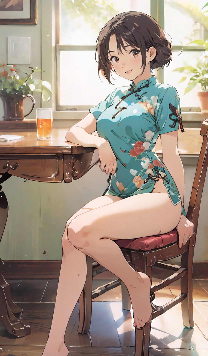 random angle, (8k, best quality, masterpiece:1), (realistic, photo-realistic:1.4), HDR, (incredibly absurdres:1.2), (sexy pose: 1.6), 1woman, 18 years old, perfect anatomy, slender, huge breasts, beautiful detailed face, (full body: 1.6), perfect skin, detailed skin texture, looking aside, (Qipao Dress, Short Sleeve, Mandarin Collar, Dark Green with Brown & Beige Floral Print, red panties: 1.2), (sitting on chair, showing sexy legs line: 1.6), in the night pub, <lora:mariM_v01:1>