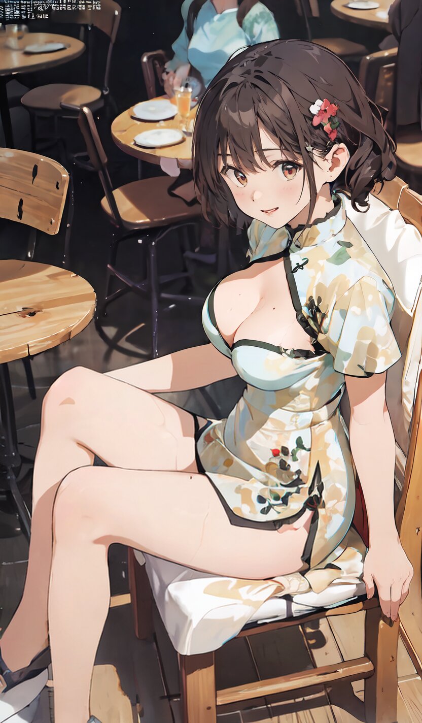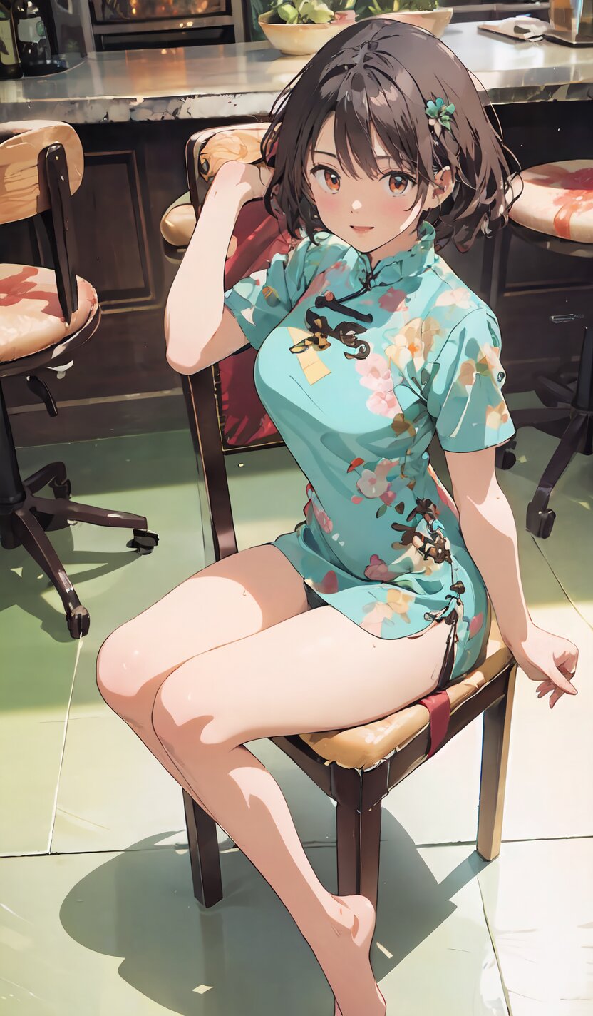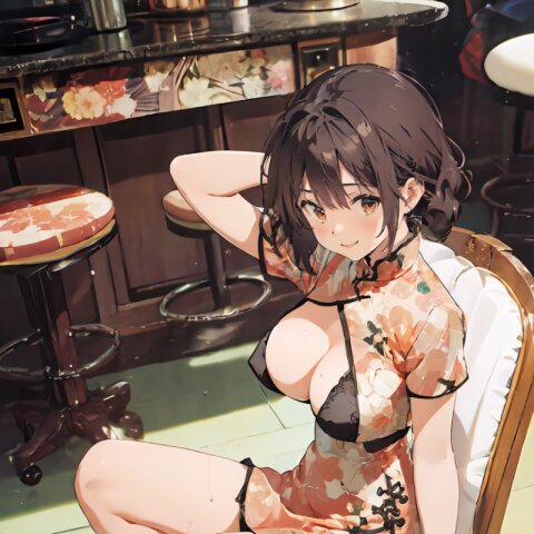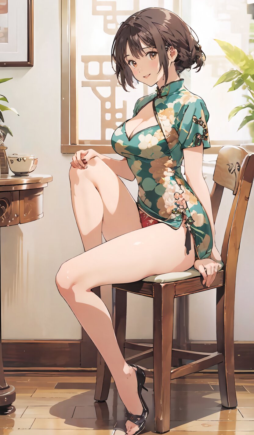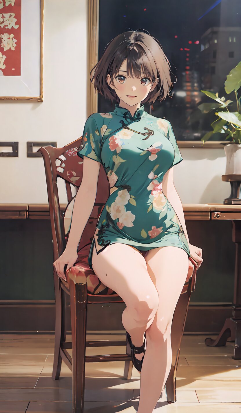 random angle, (8k, best quality, masterpiece:1), (realistic, photo-realistic:1.4), HDR, (incredibly absurdres:1.2), (sexy pose: 1.6), 1woman, 18 years old, perfect anatomy, slender, huge breasts, beautiful detailed face, (full body: 1.6), perfect skin, detailed skin texture, looking aside, (Qipao Dress, Short Sleeve, Mandarin Collar, Dark Green with Brown & Beige Floral Print, red panties: 1.2), (sitting on chair, showing sexy legs line: 1.6), in the night pub, <lora:mariM_v01:1>