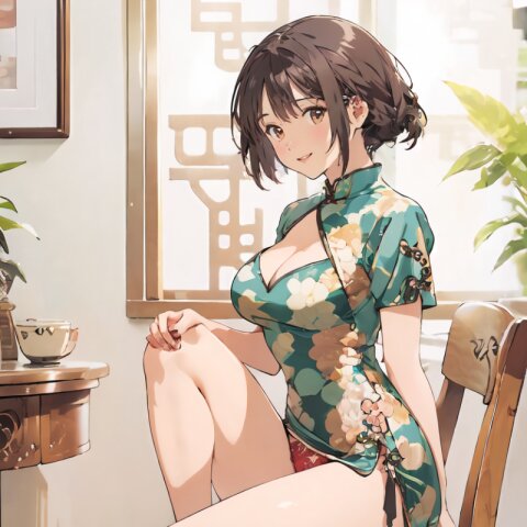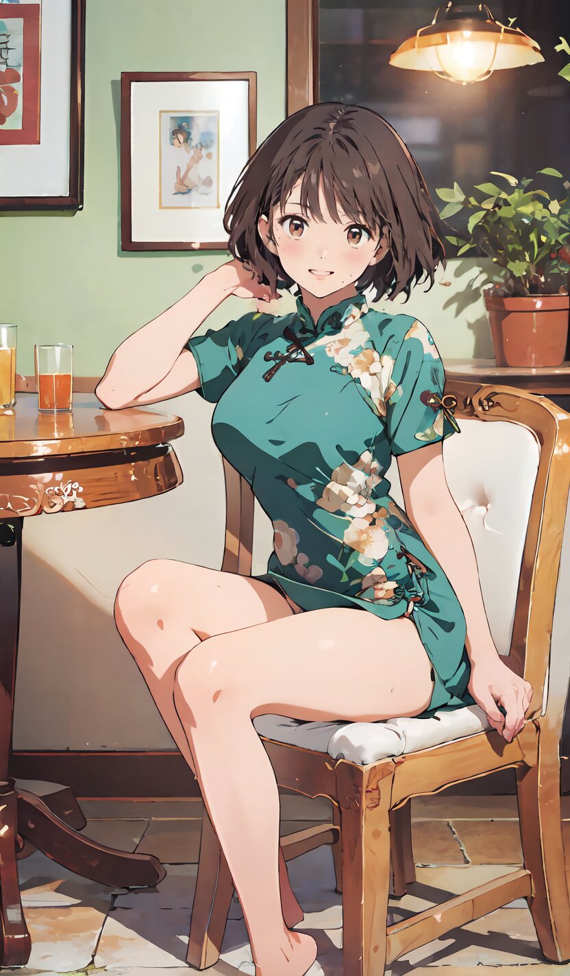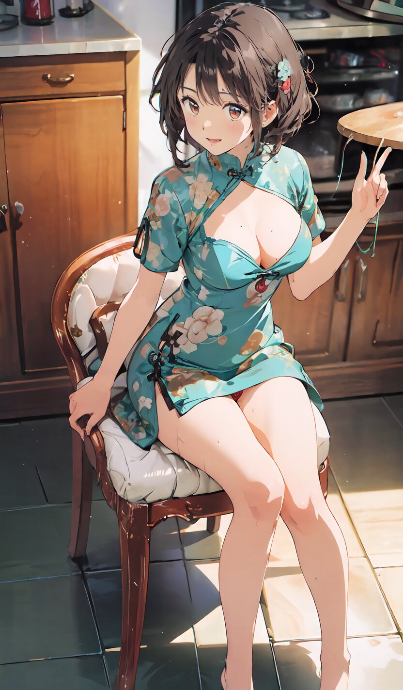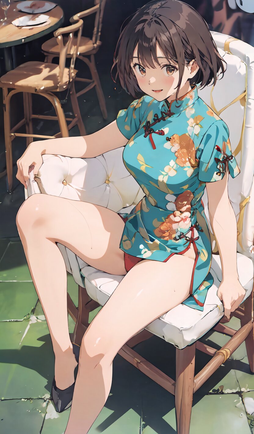 random angle, (8k, best quality, masterpiece:1), (realistic, photo-realistic:1.4), HDR, (incredibly absurdres:1.2), (sexy pose: 1.6), 1woman, 18 years old, perfect anatomy, slender, huge breasts, beautiful detailed face, (full body: 1.6), perfect skin, detailed skin texture, looking aside, (Qipao Dress, Short Sleeve, Mandarin Collar, Dark Green with Brown & Beige Floral Print, red panties: 1.2), (sitting on chair, showing sexy legs line: 1.6), in the night pub, <lora:mariM_v01:1>
