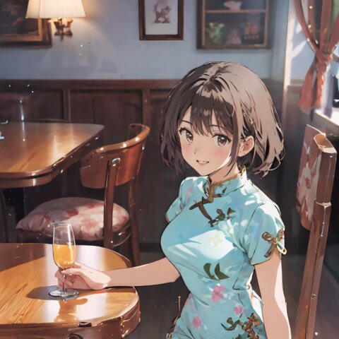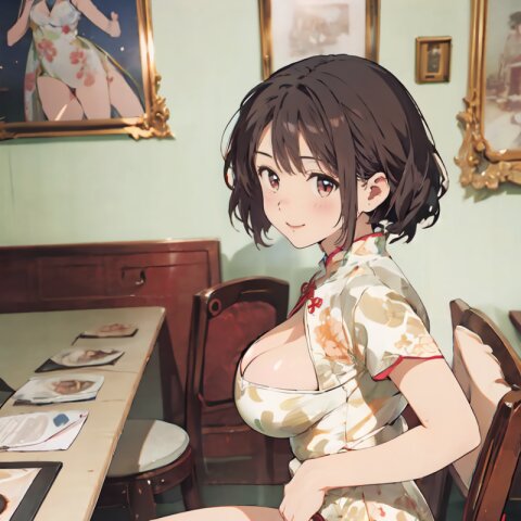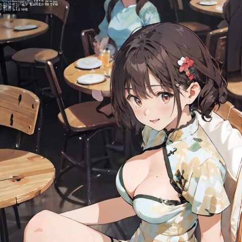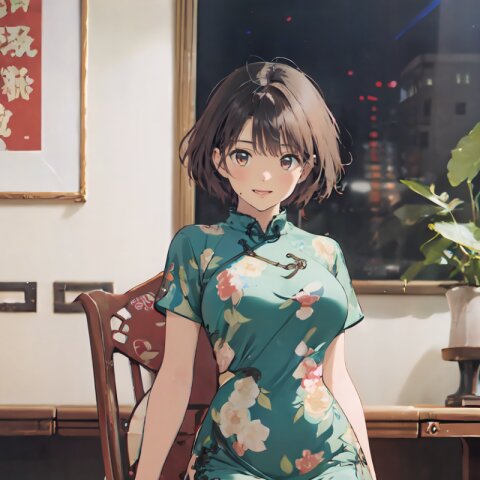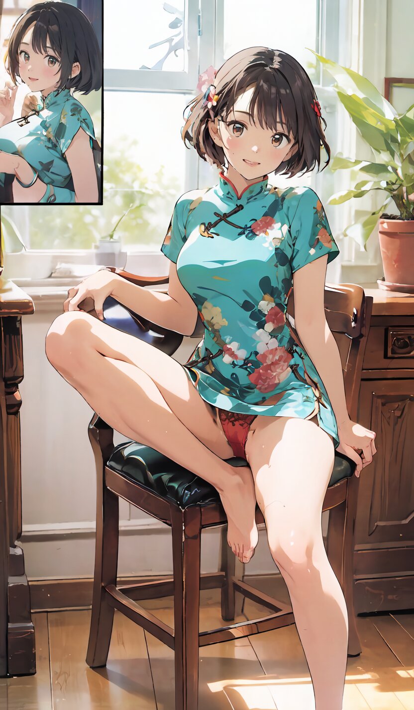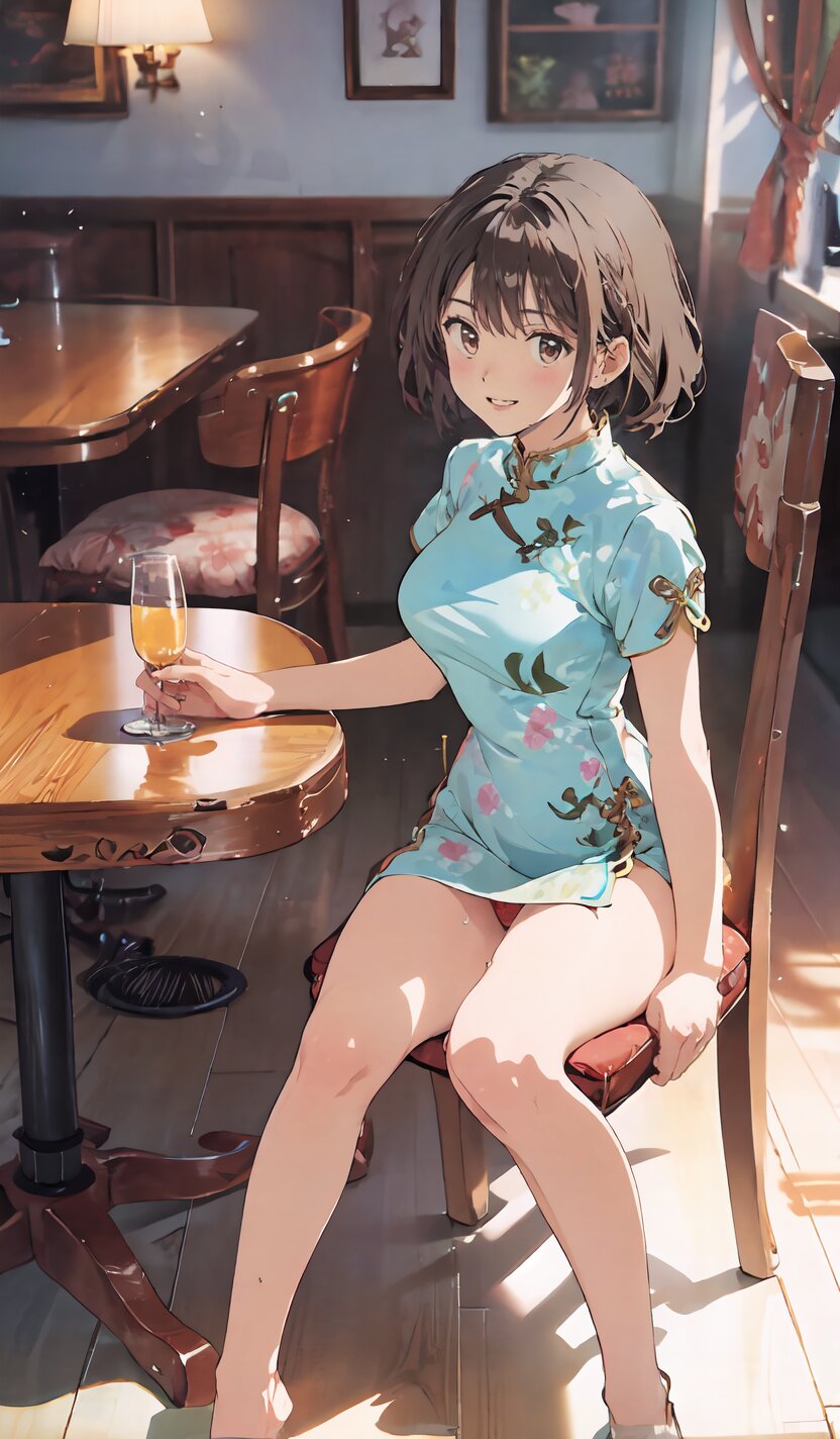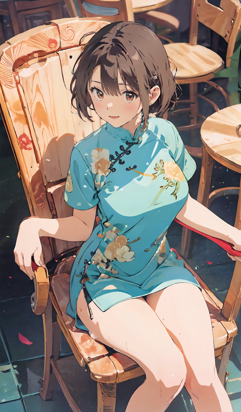 random angle, (8k, best quality, masterpiece:1), (realistic, photo-realistic:1.4), HDR, (incredibly absurdres:1.2), (sexy pose: 1.6), 1woman, 18 years old, perfect anatomy, slender, huge breasts, beautiful detailed face, (full body: 1.6), perfect skin, detailed skin texture, looking aside, (Qipao Dress, Short Sleeve, Mandarin Collar, Dark Green with Brown & Beige Floral Print, red panties: 1.2), (sitting on chair, showing sexy legs line: 1.6), in the night pub, <lora:mariM_v01:1>