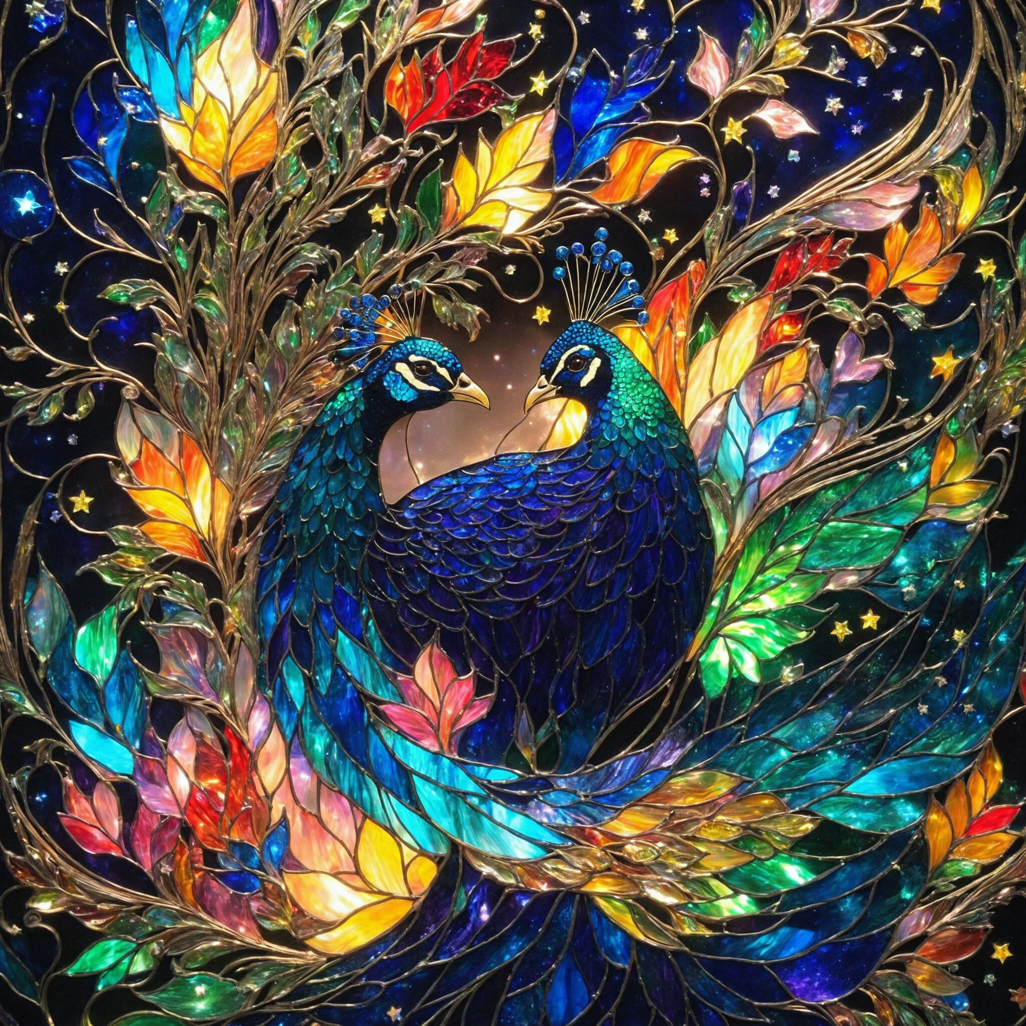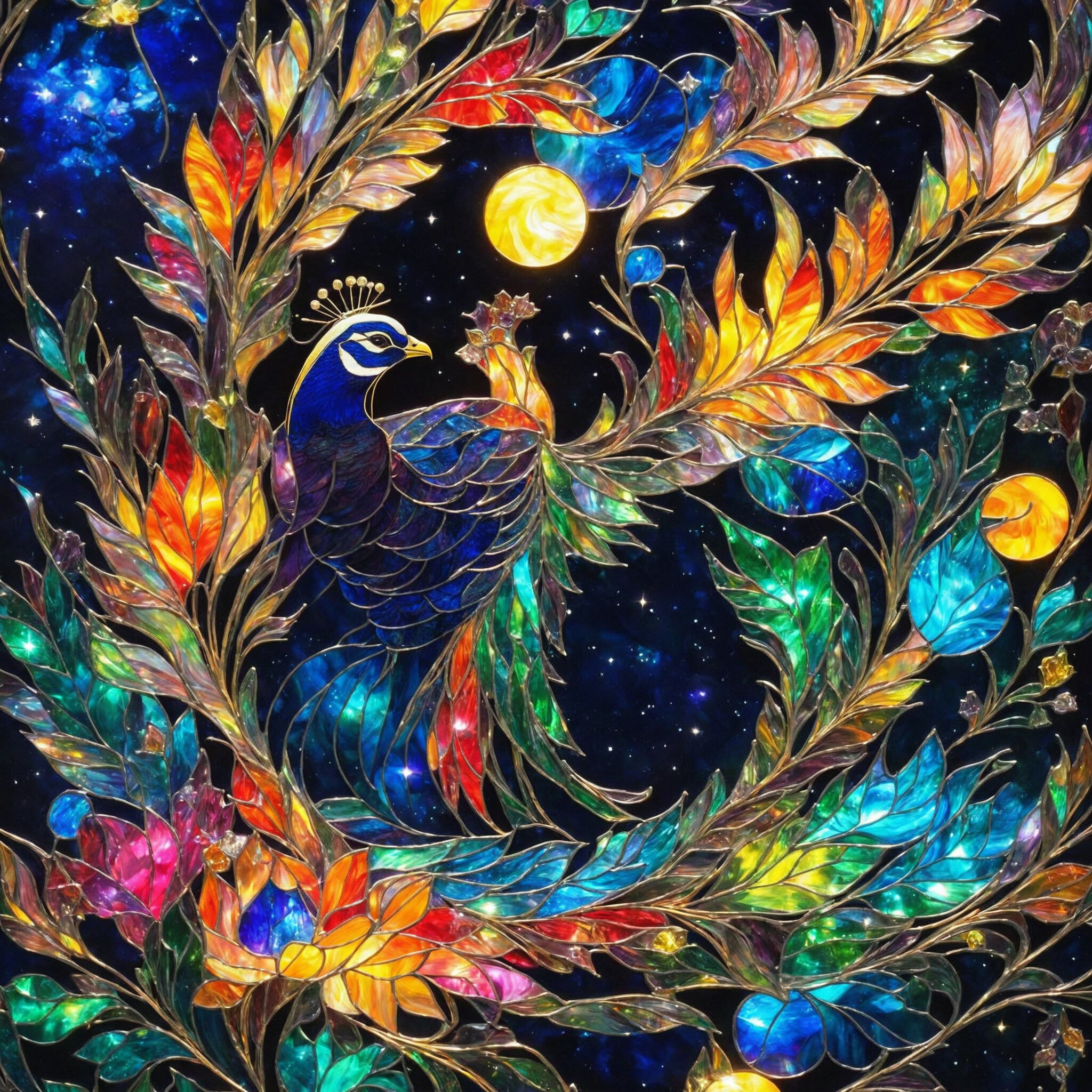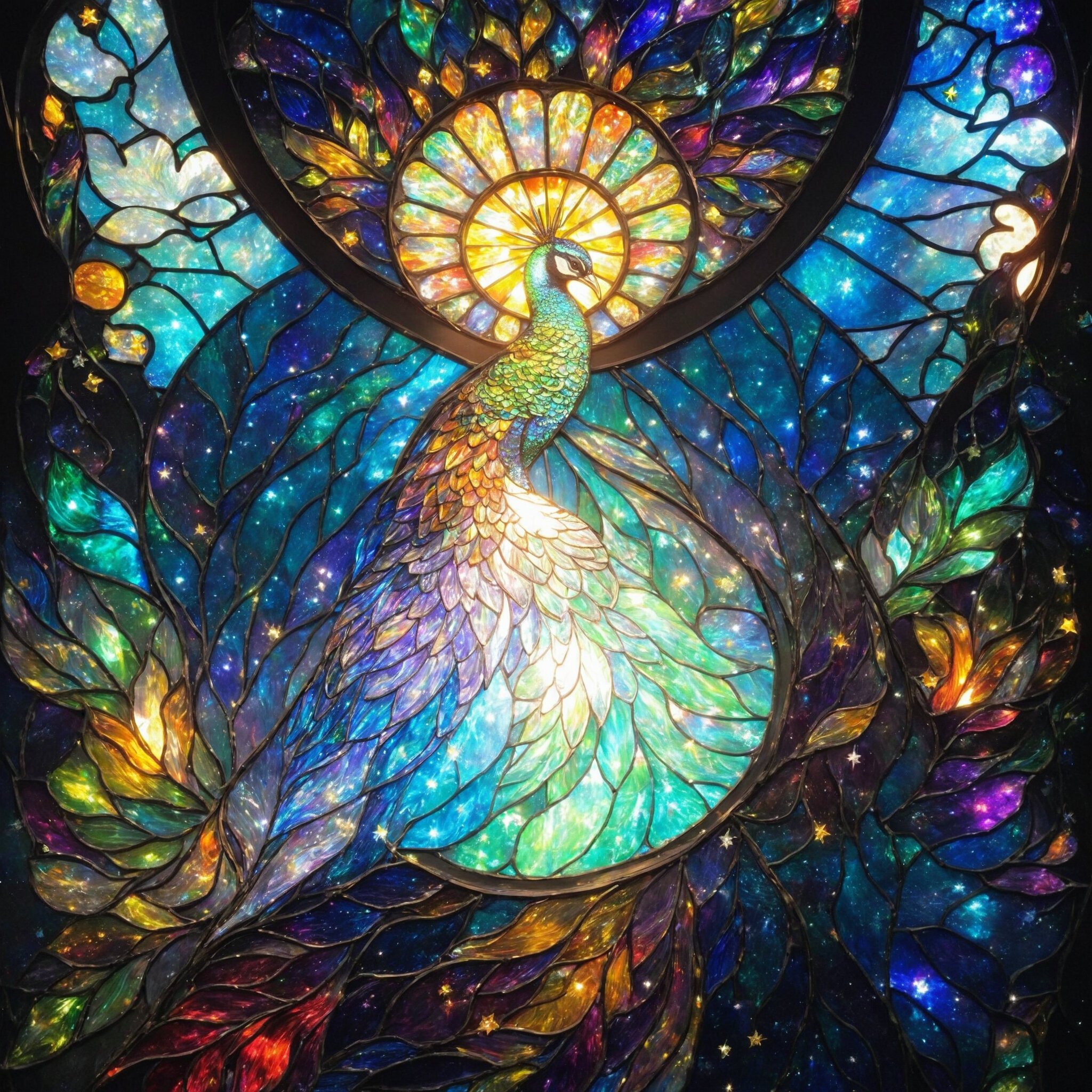 masterpiece, best quality, anime colored, illustration, ultra detailed, The Milky Way and the Aurora shine fantastically against a black background. This work has a very delicate and dreamy glow. Peacock, The characters in the work are made of crystals. break The light that hits them reflects like a rainbow, giving it a mysterious impression. The whole work has an atmosphere like a magical forest. It's a wonderful work that you'll want to look at forever.