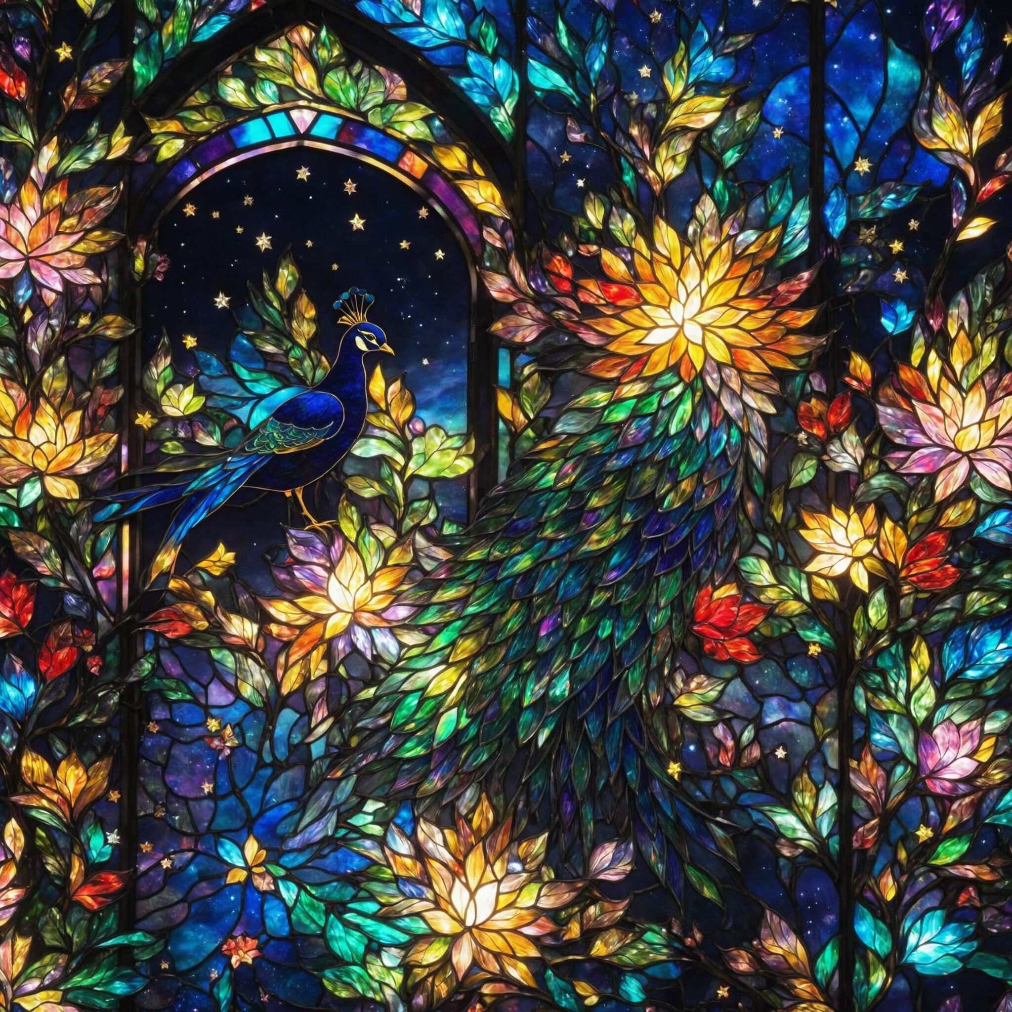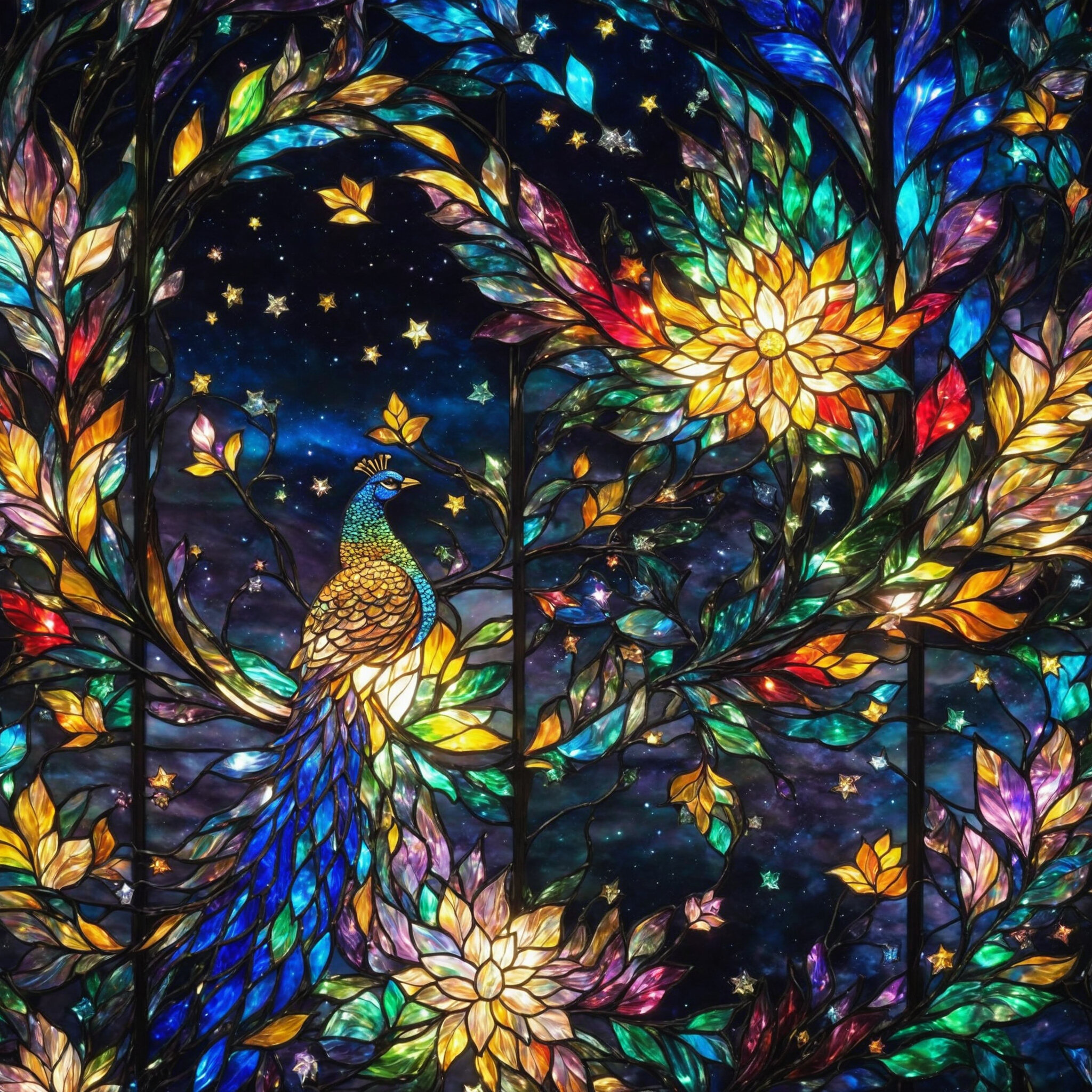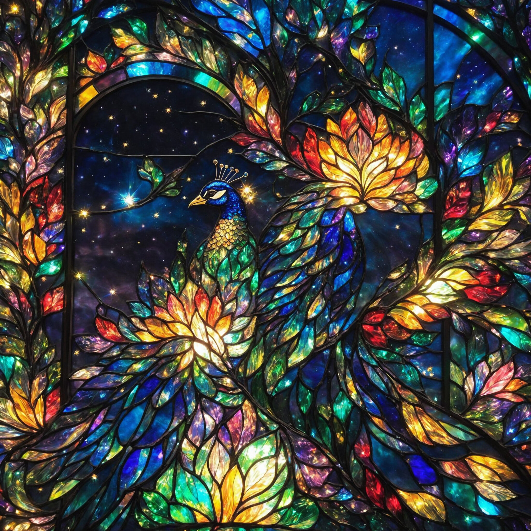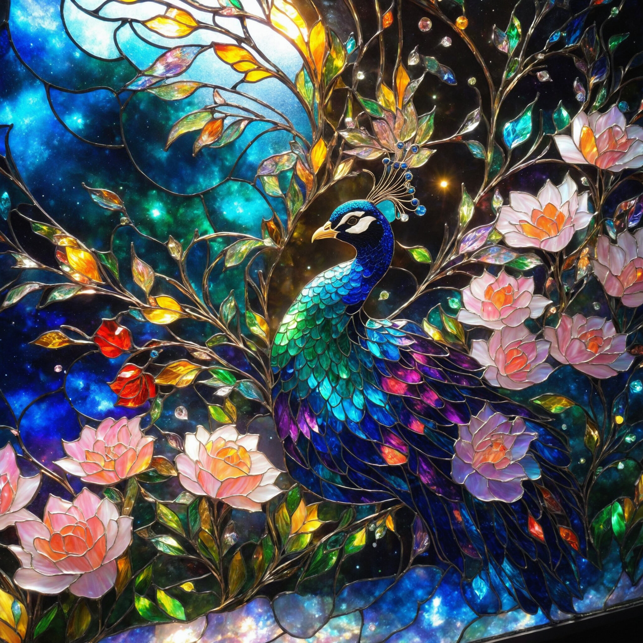 masterpiece, best quality, anime colored, illustration, ultra detailed, The Milky Way and the Aurora shine fantastically against a black background. This work has a very delicate and dreamy glow. Peacock, The characters in the work are made of crystals. break The light that hits them reflects like a rainbow, giving it a mysterious impression. The whole work has an atmosphere like a magical forest. It's a wonderful work that you'll want to look at forever.