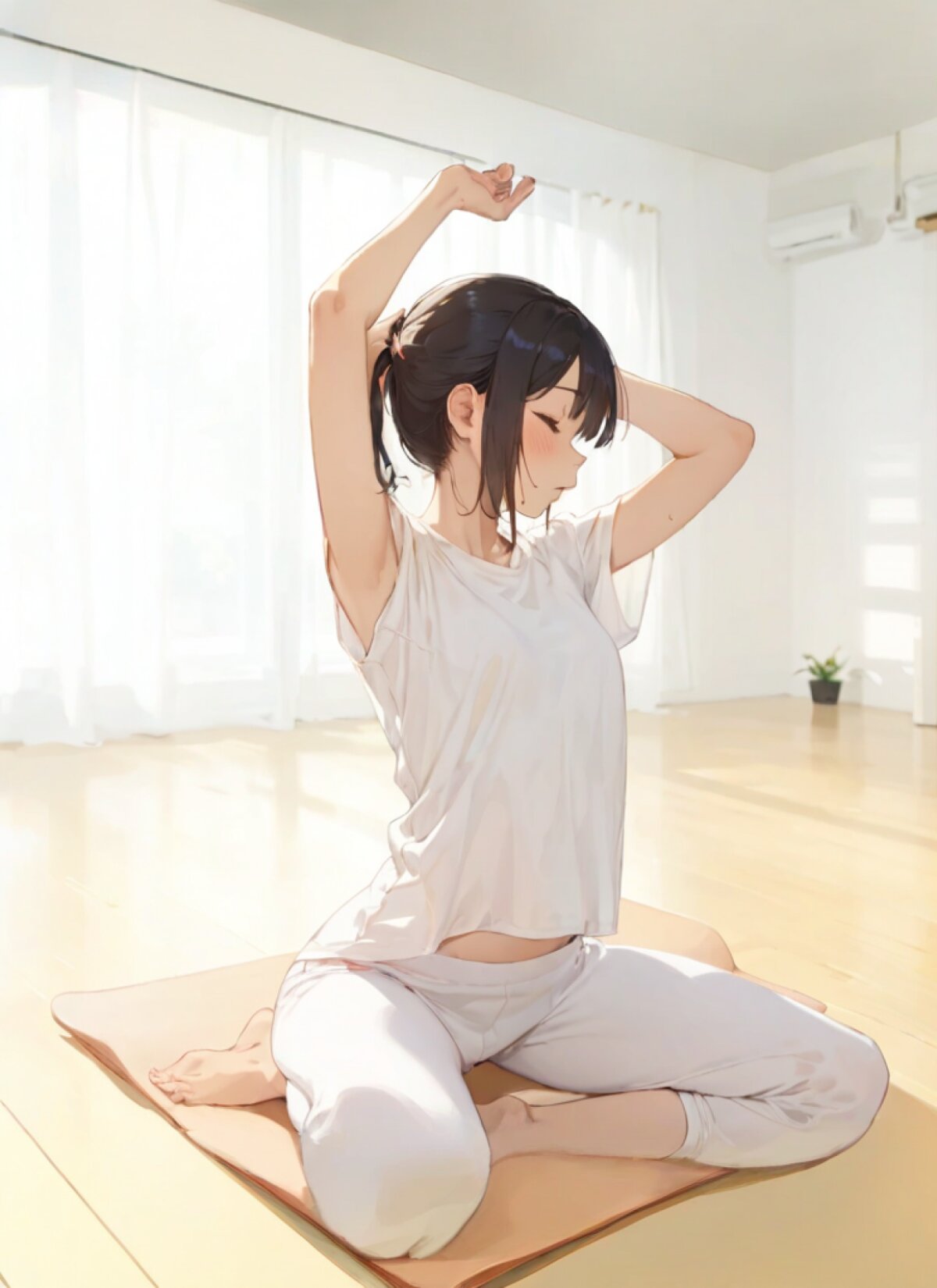 masterpiece, best quality, 1girl, Yoga pose,relax pose,meditation,white T-Shirt,pinki sweat pants,shut eyes,both arms straight up to ceiling pose,short bob pony tail hair,on the floor,Yoga studio,Yoga green mat,quiet space,streching,soft sun light,