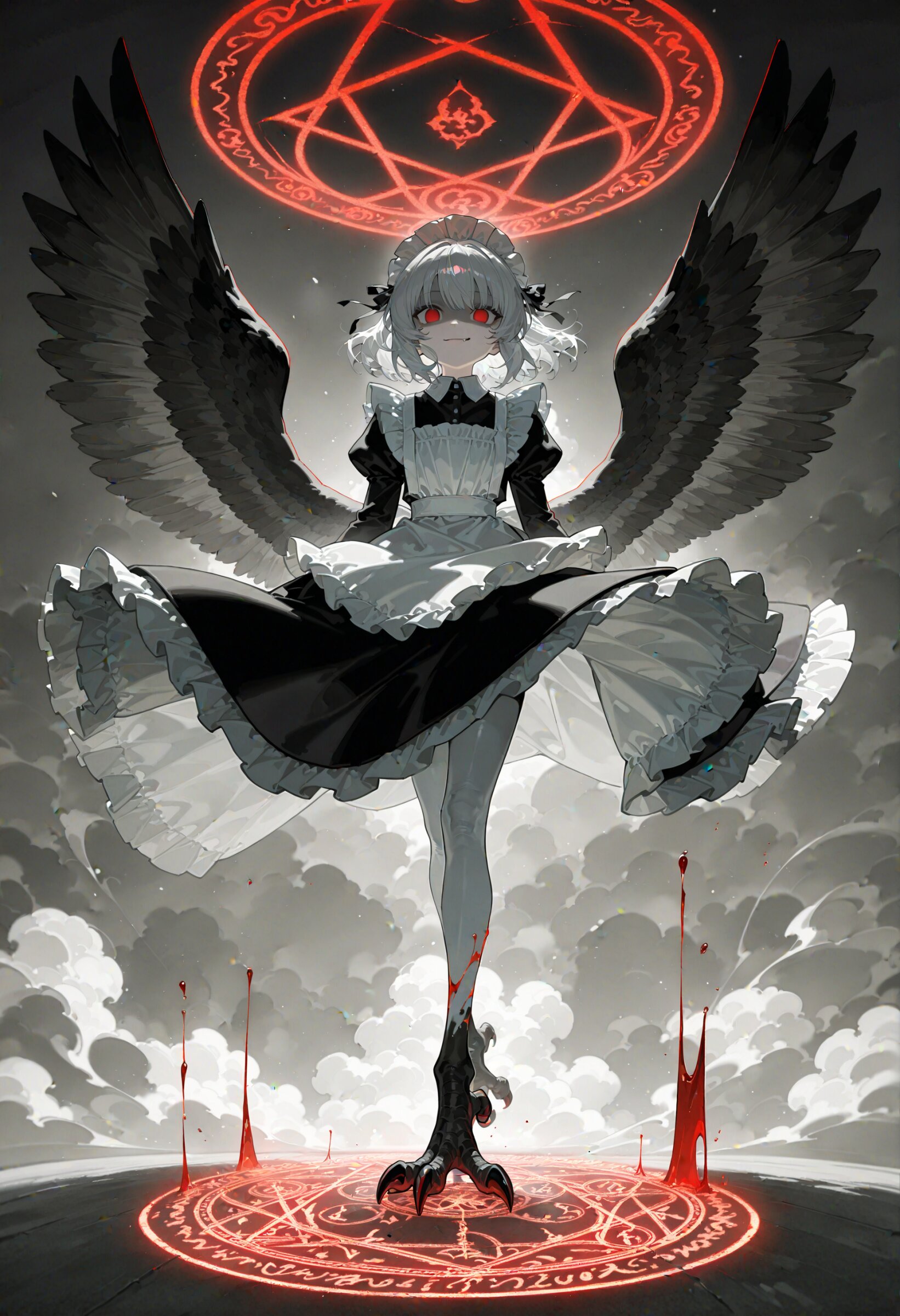 (fisheye,fisheye lens angle:1.0), (low angle shot:1.2) (absurdres absolutely resolution:1.2),texture, official art, ultra detailed, unity 8k wallpaper, dark theme, paper background, sumi-e, faux traditional media, color ink \(medium\), painting \(medium\), calligraphy brush (medium), , spot color, 1girl, (ultra-detailed), solo, maid, pale skin, pale ivory hair, (beautiful empty eyes, light smile, shaded face:1.0), long sleeves classic maid uniform, long skirt, maid headdress, maid apron, luminous effect lens flare lotion shiny-glistening cute girl solo full body, standing, crossed legs, skirt lift, graceful courtesy, bowing (low wings, fang, talons, dust cloud, strong wind:1.1), ink wash painting, (ultra detailed floating glowing magic circle:1.2), (high saturation) An illustration with line art drawn using a brush, featuring dynamic movement lines expressed with thick sumi ink strokes. super fine concept art, hard surface, 8K, unreal engine, masterpiece, best quality, amazing quality, very aesthetic, absurdres, you can add scenery, (volumetric lighting), To make the background more distinctive. professional art lots of details, , overexposure, sumie effect style, <lora:noline (1):-0.5> <lora:sdxl2-flat2-512b:0.15> <lora:facelightup_xl_v10:0.5>