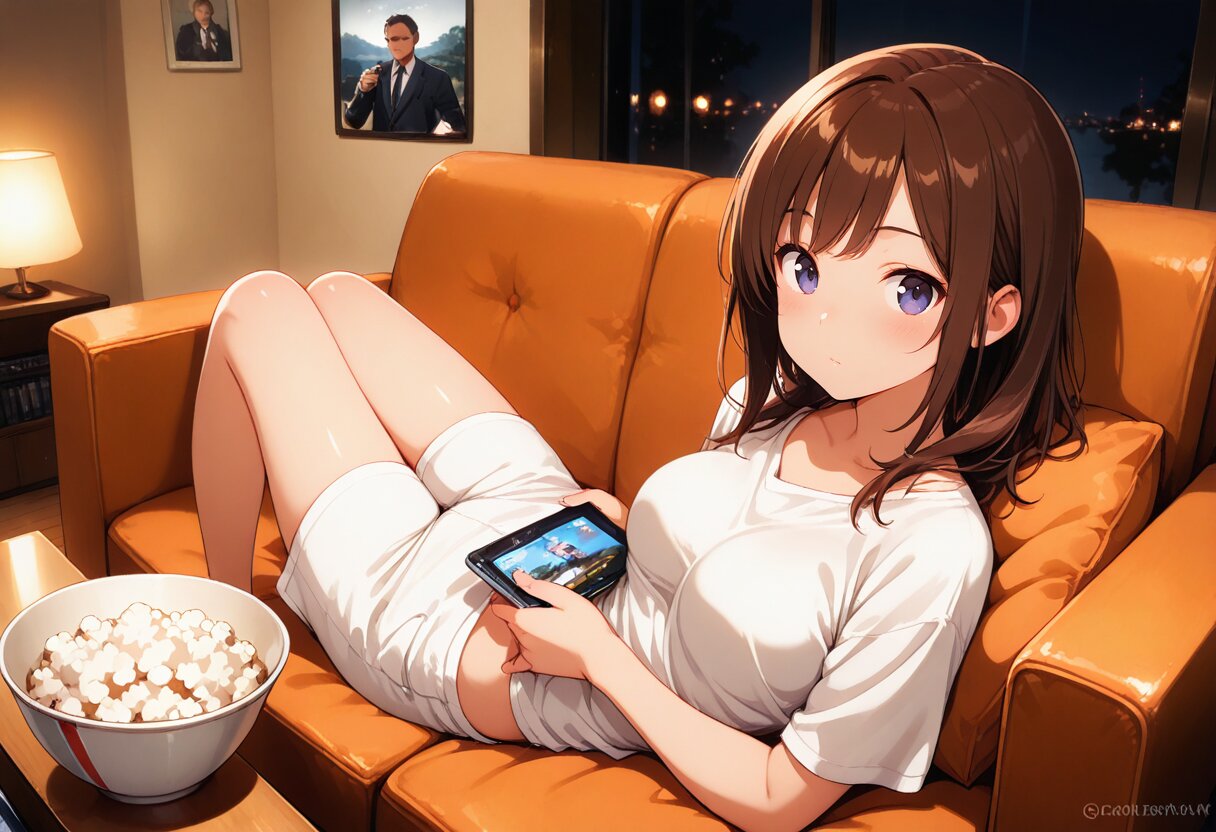 photo of a relaxed person lying on a sofa,casually grabbing popcorn by hand from a large bowl,watching movies or TV shows,cozy indoor living room setting,warm ambient lighting,soft textures,cinematic,dof, <lora:xl_more_art-full_v1:1>,<lora:flat_sdxl:-0.4>,<lora:outline_xl_kohaku_delta_spv5x:-0.4>,general,safe,, appropriate posture,appropriate configuration,ideal ratio body proportions,perfect anatomy, <lora:Fixhands_anime_bdsqlsz_V1:1>, masterpiece, best quality, amazing quality, very aesthetic, absurdres, highres, newest