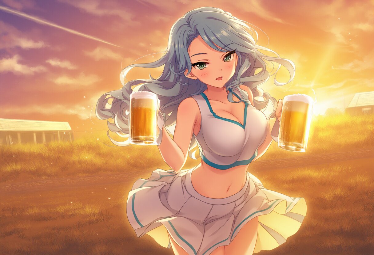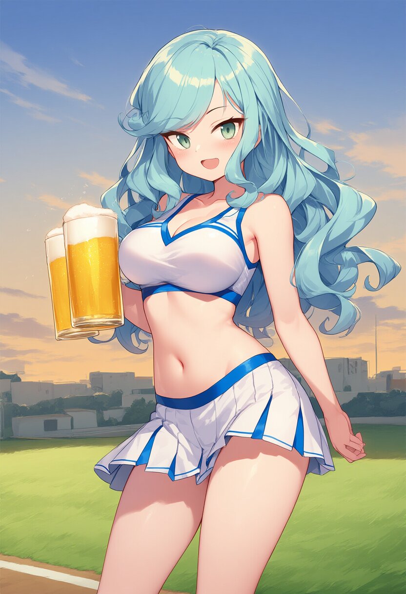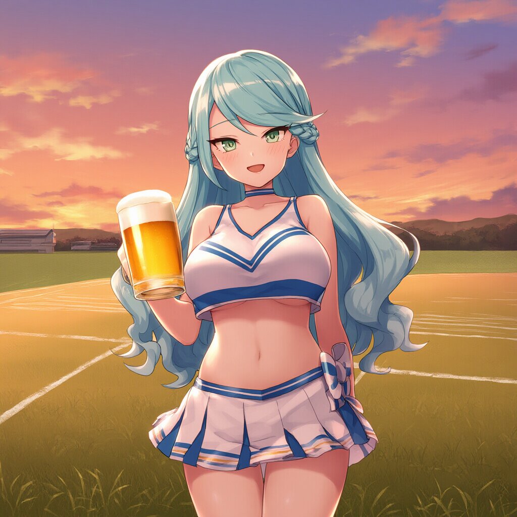 {{{highly detailed}}}, {{official style}}, {{game cg}}, {{intricate}}, {{nyanko daisensou}}, 1girl, solo, light blue hair, light green eyes, {{{{{tsurime}}}}}, {{{shiny wavy hair, long hair}}}, swept bangs, large breasts, light smile, blush, open mouth, navel, {{wearing white cheerleader costume, skirt}}, {{{hold the beer mug}}}, cowboy shot, evening, sunset, grasslands, school, {{{masterpiece}}}, {{{best quality}}}, {{{very aesthetic}}}, {{{ultra-detailed}}}, {illustration}, {{{extremely detailed}}}, {{{an extremely delicate and beautiful}}}