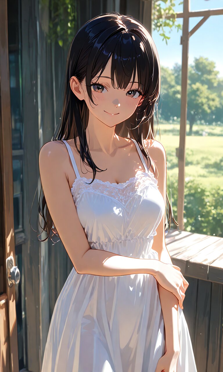 1 lady, long hair, black hair, (white sundress), smile gently, blush, cowboy shot,
