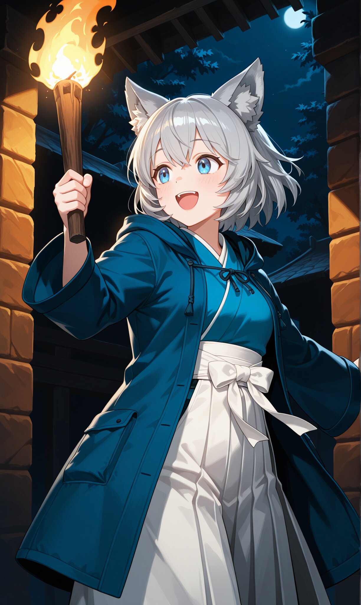 1girl, solo, animal ears, wolf ears, wolf girl, short hair, gray hair, blue eyes, excited, smile, deep blue coat, hooded coat, hooded down, hakama skirt, white hakama, torch, holding torch, torch light, night, dark, looking away, Perfect Hands, Dark Dungeon