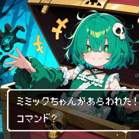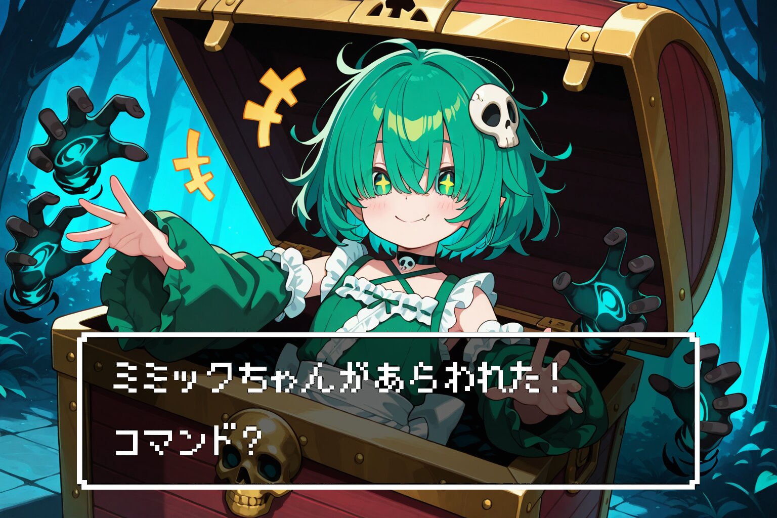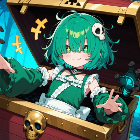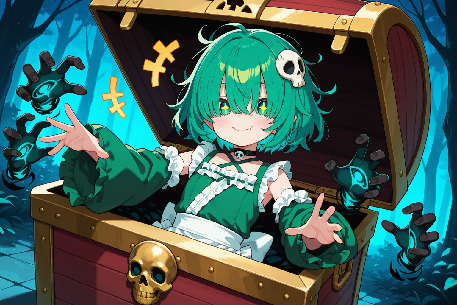 ■フレームはChatGPTに作ってもらいましたー ■SD↓ 1 little girl, solo, diagonal angle, rpg battle frame style, masterpiece, best quality, amazing quality, very aesthetic, cobalt green hair, short hair, messy hair, (hair over eyes:1.2), green eyes, demon fangs, +_+, closed mouth, smile, cheerful, +++, notice lines, choker, green wa maid outfit, (oversized sleeves:1.2), detached sleeves, (floating black ghosty hands:1.2), skull hair ornament, in mimic chest, dungeon,