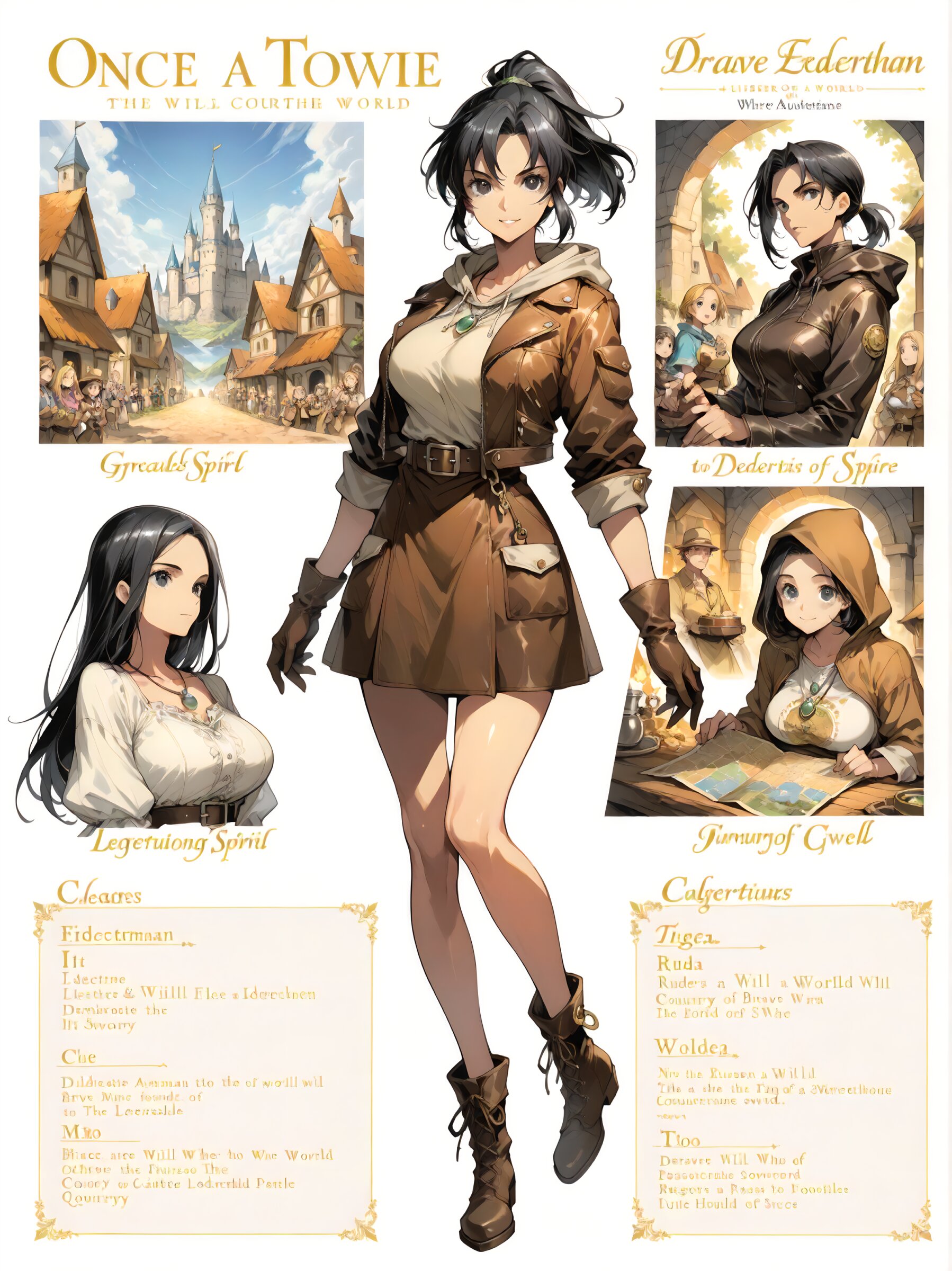 masterpiece, best quality, official art, concept art, delicate anime-style illustration, Rough feeling, strong outlines, adventurous spirit, great part of the story, tourist-magazine style, guide maps, introduction to places of interest, english text, stylish font, descriptions and captions, detailed data, photos of highlights, illustrations and photographs, introduction to fun activities, assemblage, High Fantasy, ARIAHAN, once a prosperous country that ruled the world, is now a small country because of the war. It is a country-like castle town on a small continent with a large castle and peaceful city. It is a friendly country with a peaceful, idyllic atmosphere. It is home to the birthplace of a hero, a brave man who will eventually save the world. The town features Rueda's Tavern, where adventurers from all over the world gather. a world of swords and sorcery, (young girl), cute face and eyes, big breasts, black hair, clear black eyes, single short ponytail hair, cute and lovely, Vigorous, lively, and spontaneous personality,jojo pose, big smile, ((brown theme:1.2)), ((((leather hoodie jacket)) under (Lederhosen:1.4))), (sleeves rolled up), (green gemstone necklace), leather gloves, ((leather belt with pocket:1.2)), (ankle boots:1.4), fighter, mage, preast, brave,