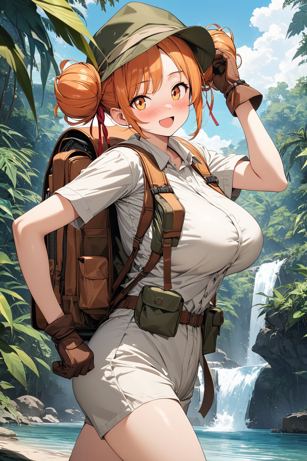 1girl, jungle,blue sky,river,(splash), large breasts, orange hair,(double bun),(center parted bangs),sideburns,hair side red string ribbon, small orange eyes, nose blush,naughty smile,open mouth,joy, adventurer's clothes,adventurer hat,jungle boots,socks,gloves,backpack,knapsack,water_bottle, arm up, cowboy shot,dynamic angle,looking at viewer,from side:0.8, ((best quality)),((very high resolution)),full color,((ultra detailed)),extremely detailed CG,super fine illustration, manga style,hyperrealistic, perfect anatomy,super detailed skin,(beautiful detailed clear eyes),