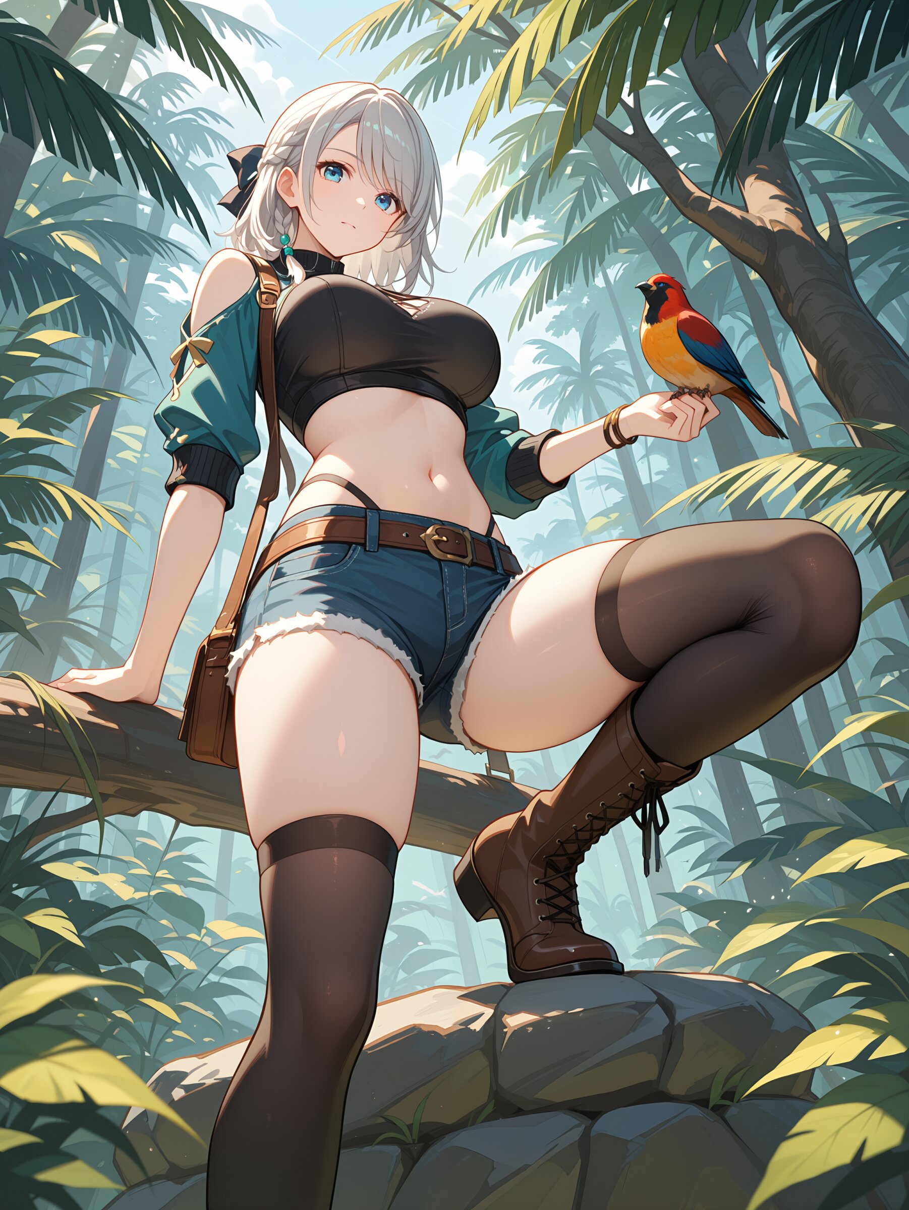 clothed,short pants, thighhighs, lace-up boots, from below, leg focus, leg on stone, adventure, jungle, standing on one leg, bird, looking at bird, dynamic pose,dynamic angle, cinematic scene,