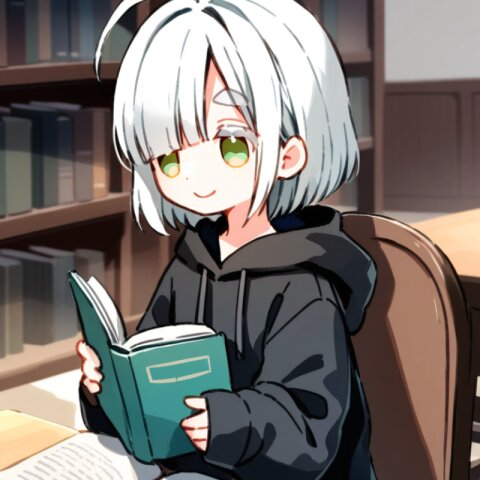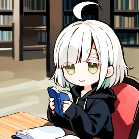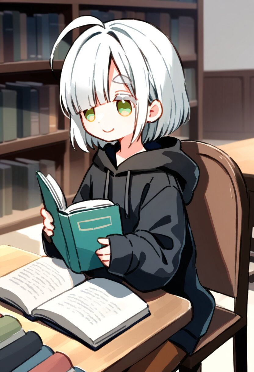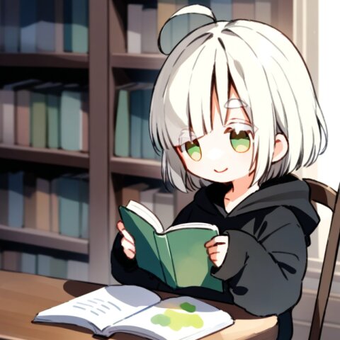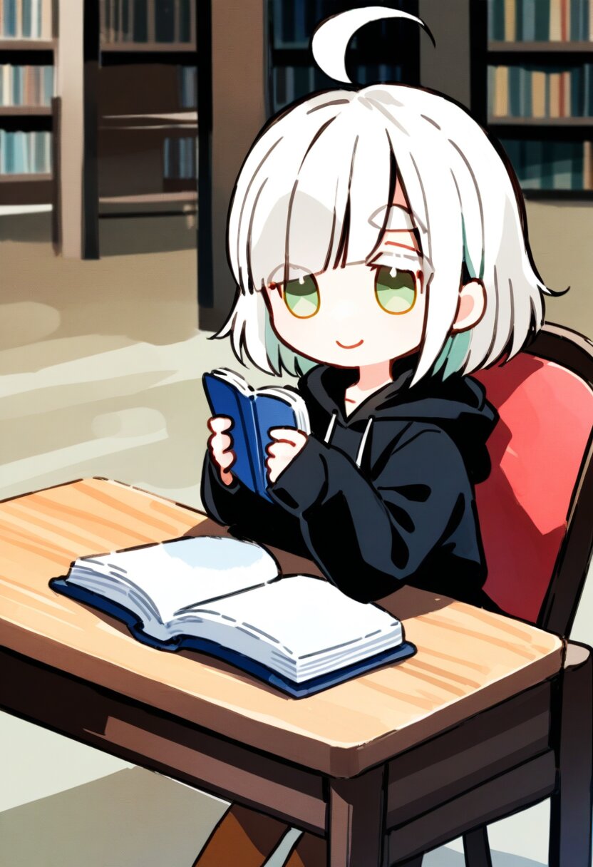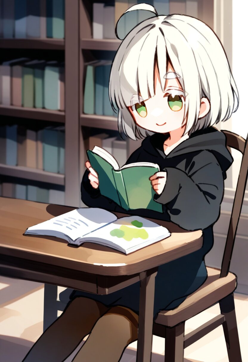 <lora:inmnstylexl:1>, best quality, masterpiece, very aesthetic, watercolor painting, general, chibi, 1girl, 10 years old, (bright white hair), short hair, blunt bangs, white thick eyebrow, white colored eyelashes, (hair over one eye), ahoge, smile, oversize black hoodie, sleeves past wrists, brown tights, reading book, table, sitting chair, library, mintgreen eyes