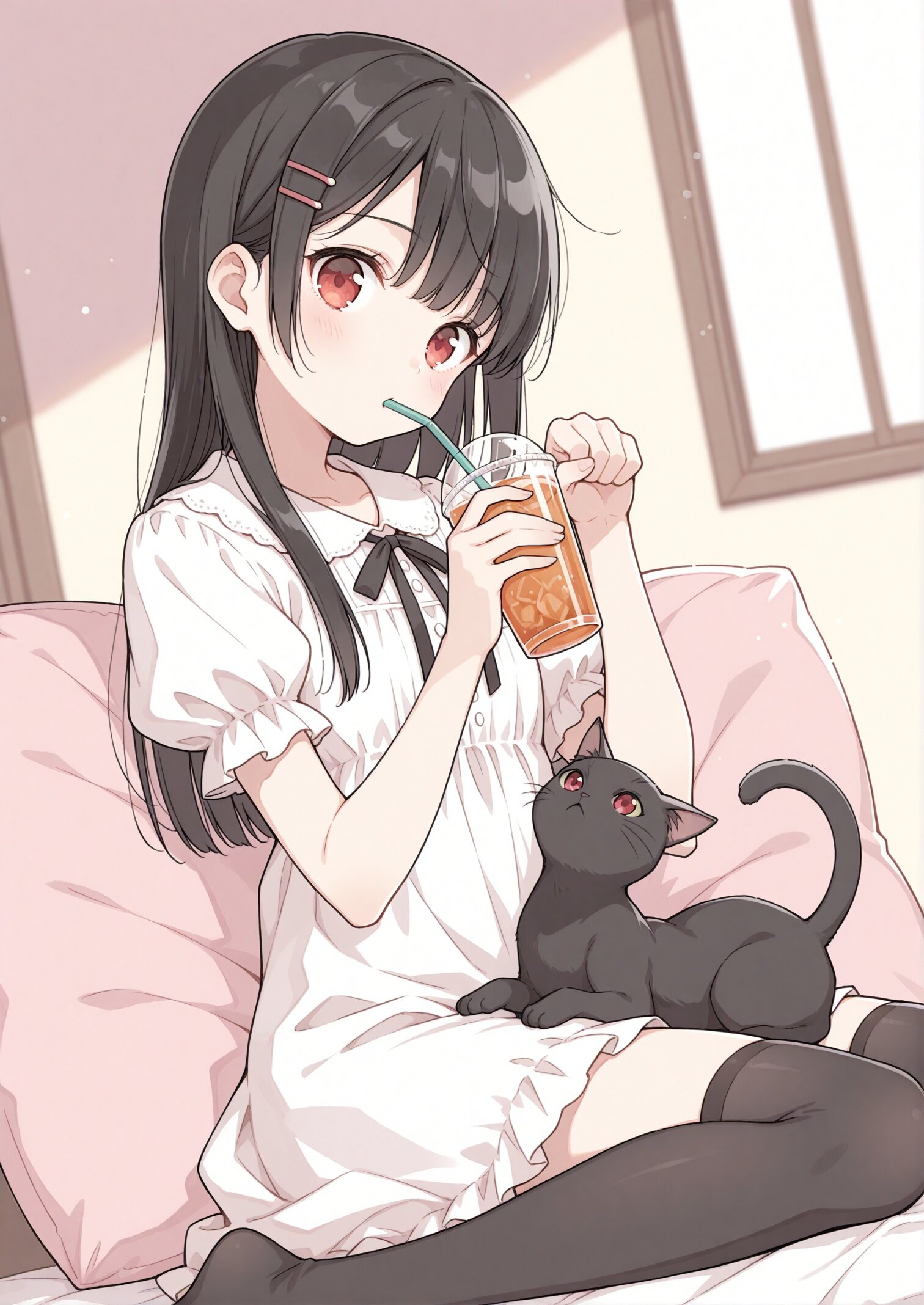 (flat color:0.1),(pale color:0.15), (tareme:0.33), cute 1girl , red eyes, straight hair ,black hair ,(hair between eyes:0.4), hairpin,kawaii, (pastel theme :0.3), (depth of field:0.7), (bokeh:0.5),(drinking straw in mouth:0.5),(excited:0.15) ,(:D:0.2),(:o:0.4), (head tilt:0.7), BREAK (cat on lap, paw up:1.2), indoors, sitting, dress, refined , black_legwear, thighhighs, ribbon, (hand up, paw pose:0.9), puffy short sleeves, (holding a drink:1.1), cushions, wariza , ( from side:0.1), ( dutch angle:0.2),(contrapposto:0.5)