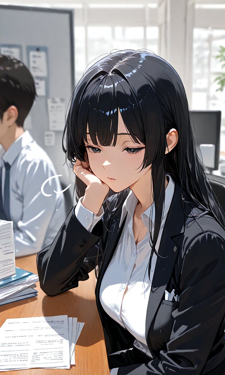 1 lady, long hair, black hair, blant bangs, cool, (office cloth, black jacket, white shirt, boring, office, sitting, tired), (sigh), breasts