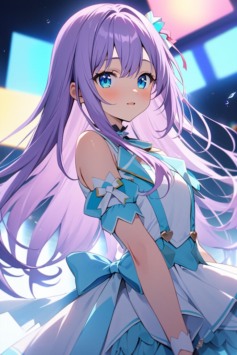 a cute anime girl, long pastel purple hair with inner aqua blue, soft straight hair, gentle eyes, idol outfit with frills and ribbons, white and blue color scheme, glowing background, soft light, masterpiece, best quality