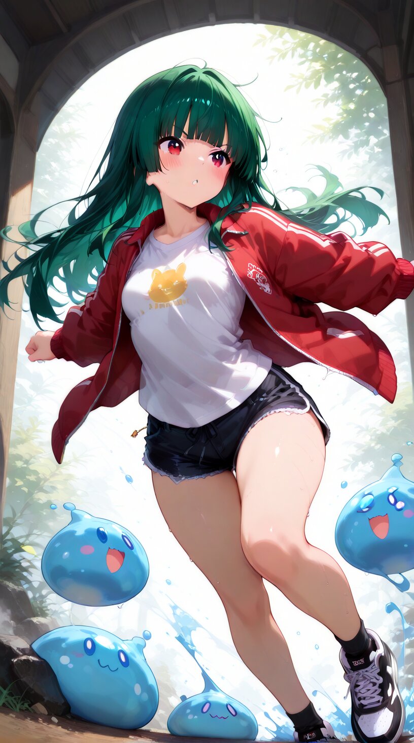 masterpiece,best quality,ultra-detailed,high resolution,super detailed skin,perfect anatomy,beautiful detailed eyes,1girl,green hair,long hair,hime cut,blush,red eyes, small breasts, A streetwear outfit featuring a red coach jacket as outerwear, a loose T-shirt as an inner layer, black denim shorts, chunky black Air Max-style sneakers, and black ankle socks, The outfit has a casual and relaxed streetwear vibe, battle, action pose, slime