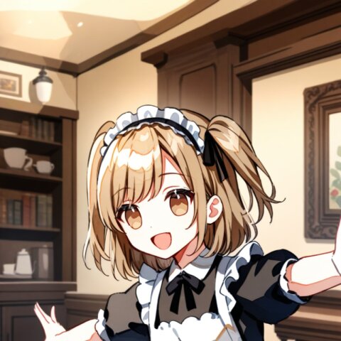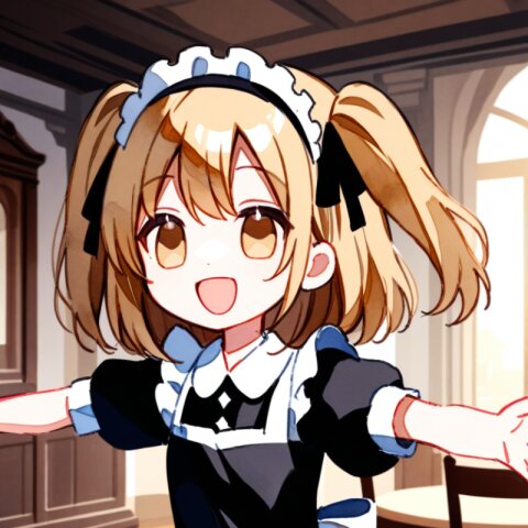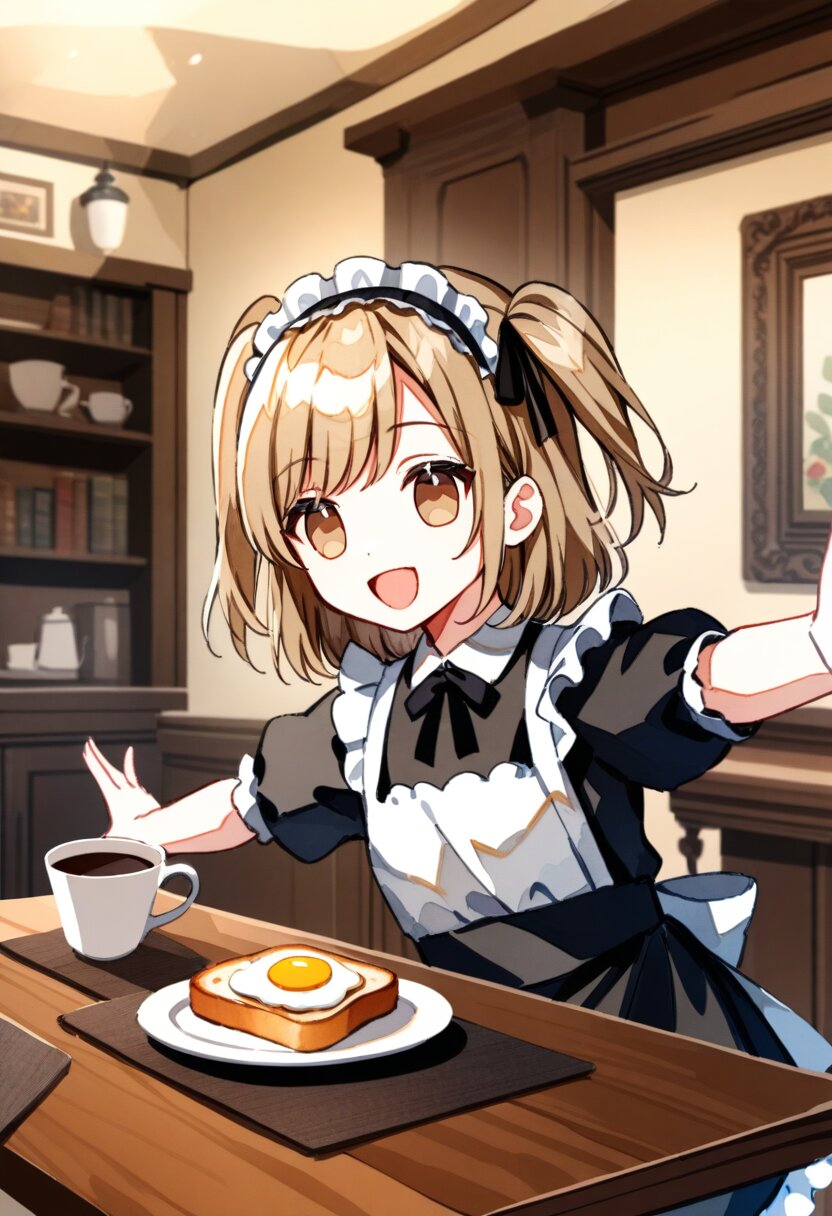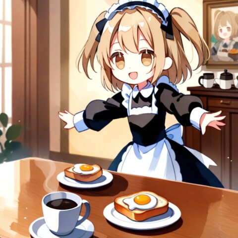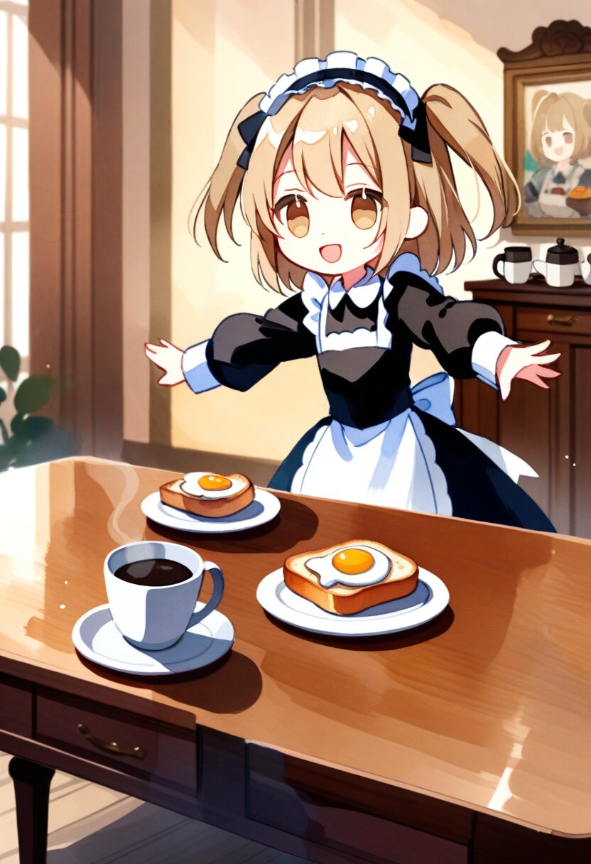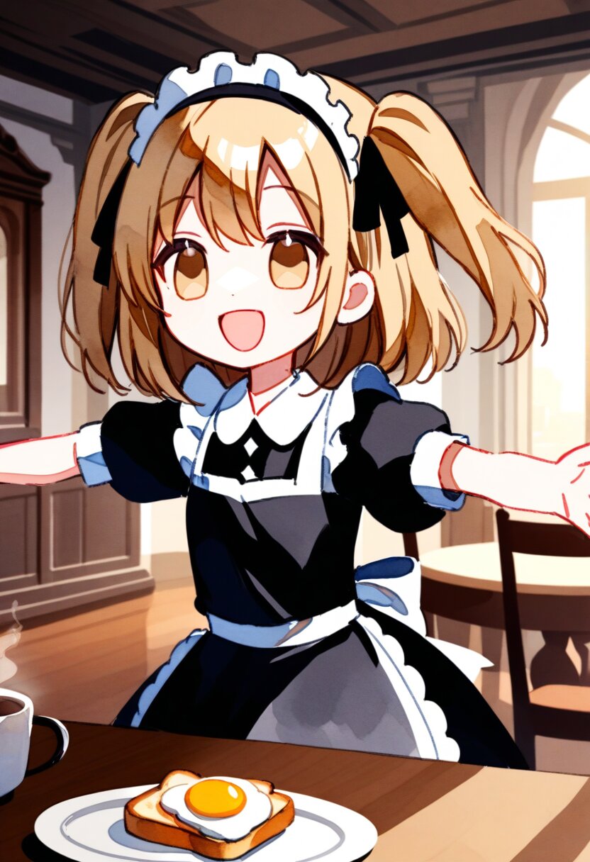<lora:inmnstylexl:1>, best quality, masterpiece, very aesthetic, watercolor painting, general, chibi, 1girl, light brown hair, medium hair, two side up, light brown eyes, maid costume, smile, open mouth, spread arms, fried egg on toast, coffee, table, antique room